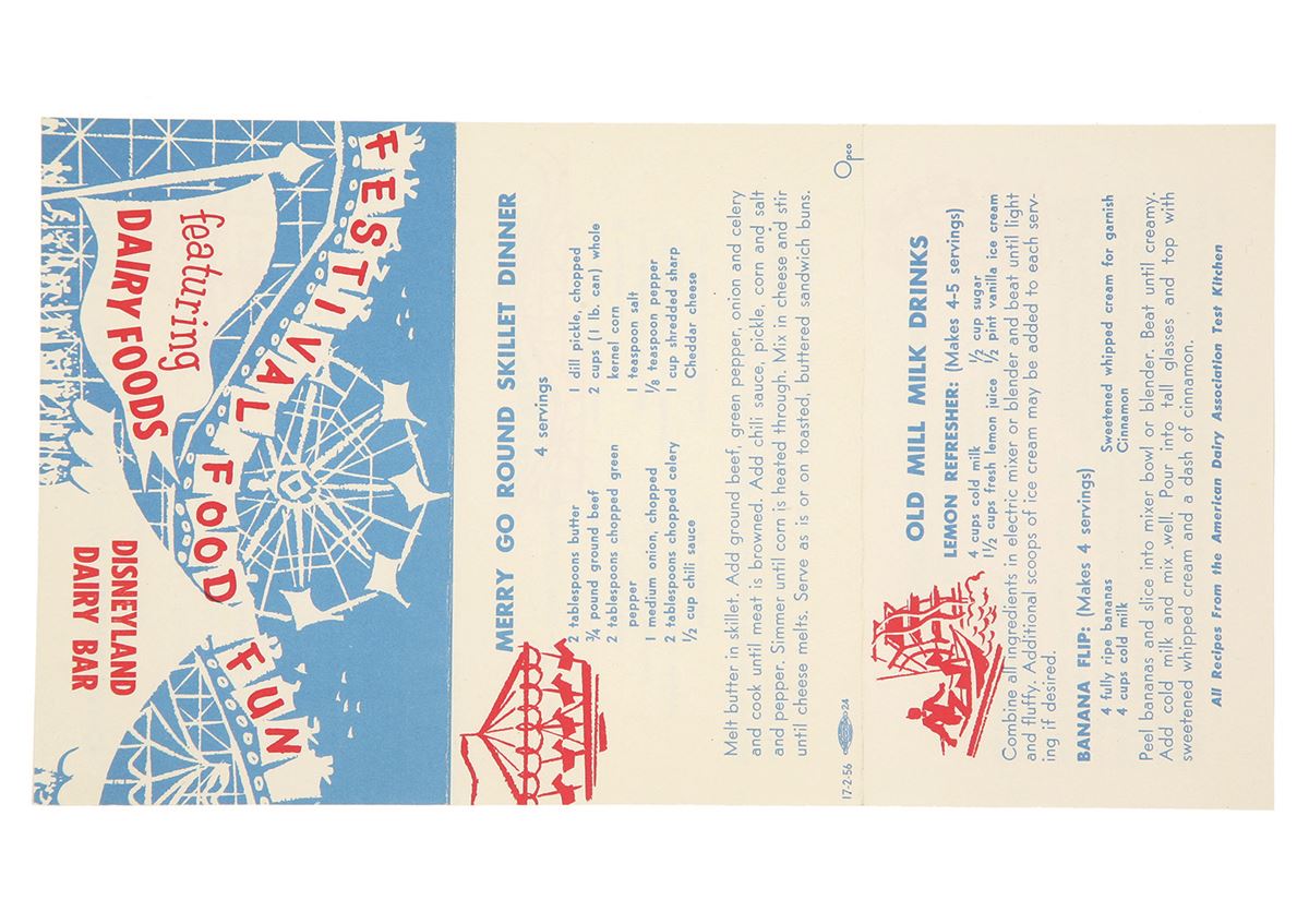 (Disneyland, 1956) Extremely rare tri-fold recipe flyer from the Dairy Bar in Tomorrowland. Sponsored by the American Dairy Association, the exhibit was housed in Tomorrowland from 1956 to 1958. The flyer measures 9”x5” unfolded and is in very good condition with light wear at the folds.