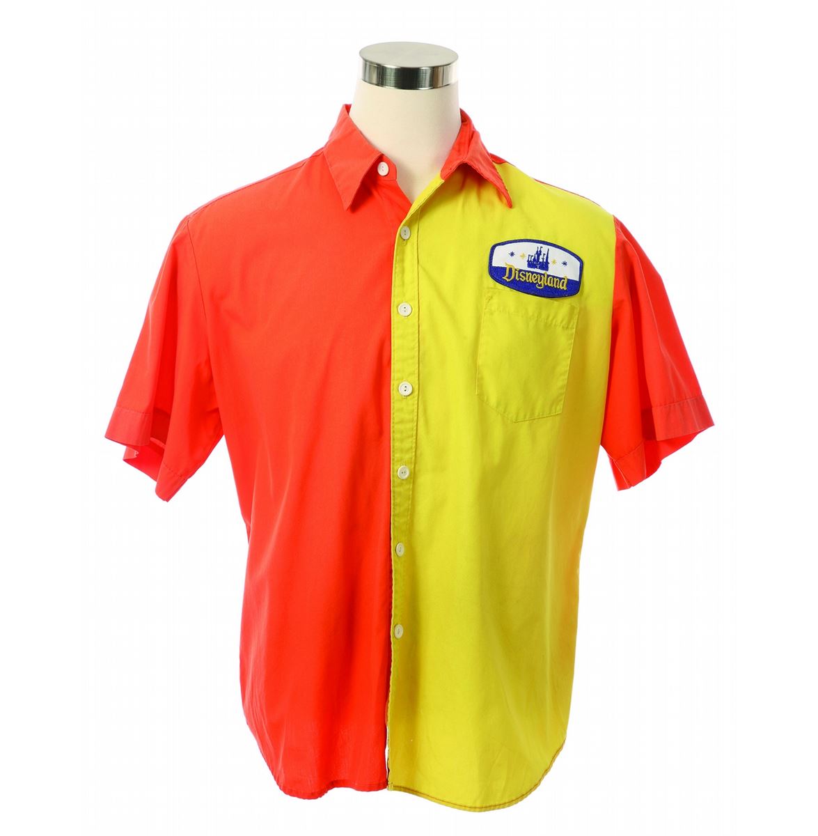 (Disneyland, 1980s) Orange and Yellow Tram Shirt worn in the 1980s and 1990s. Size Men's XL and in good condition with moderate wear, four very tiny holes on the front left shirt tail. Some very light stains.