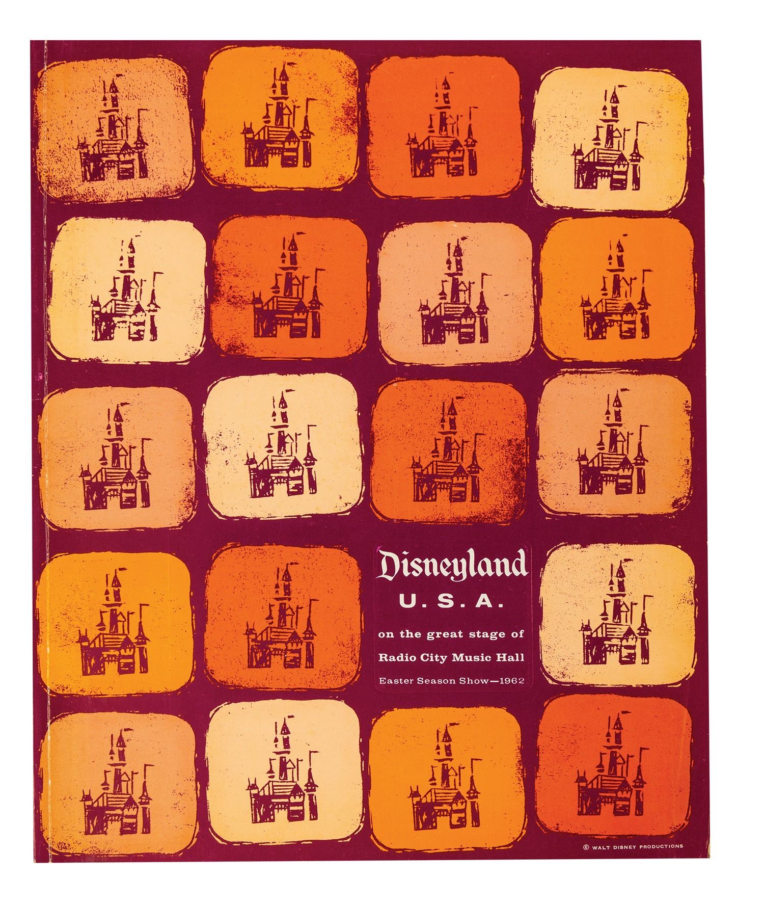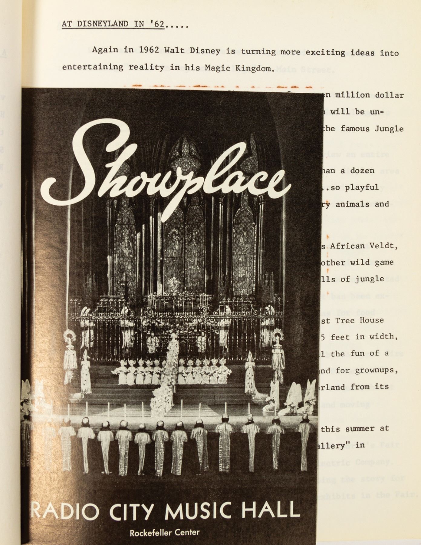 (Disneyland, 1962) An informational booklet and program about Disneyland and the "Disneyland U.S.A." stage show at the Radio City Music Hall. The first of its kind, the "Disneyland U.S.A." Easter attraction showcased the film "Moon Pilot," and offered many on the east coast their first look into the Disneyland experience. Measuring 11"x8.5", the 16-page booklet is in very good condition with expected edge-wear from use and some discoloration to four of the pages.