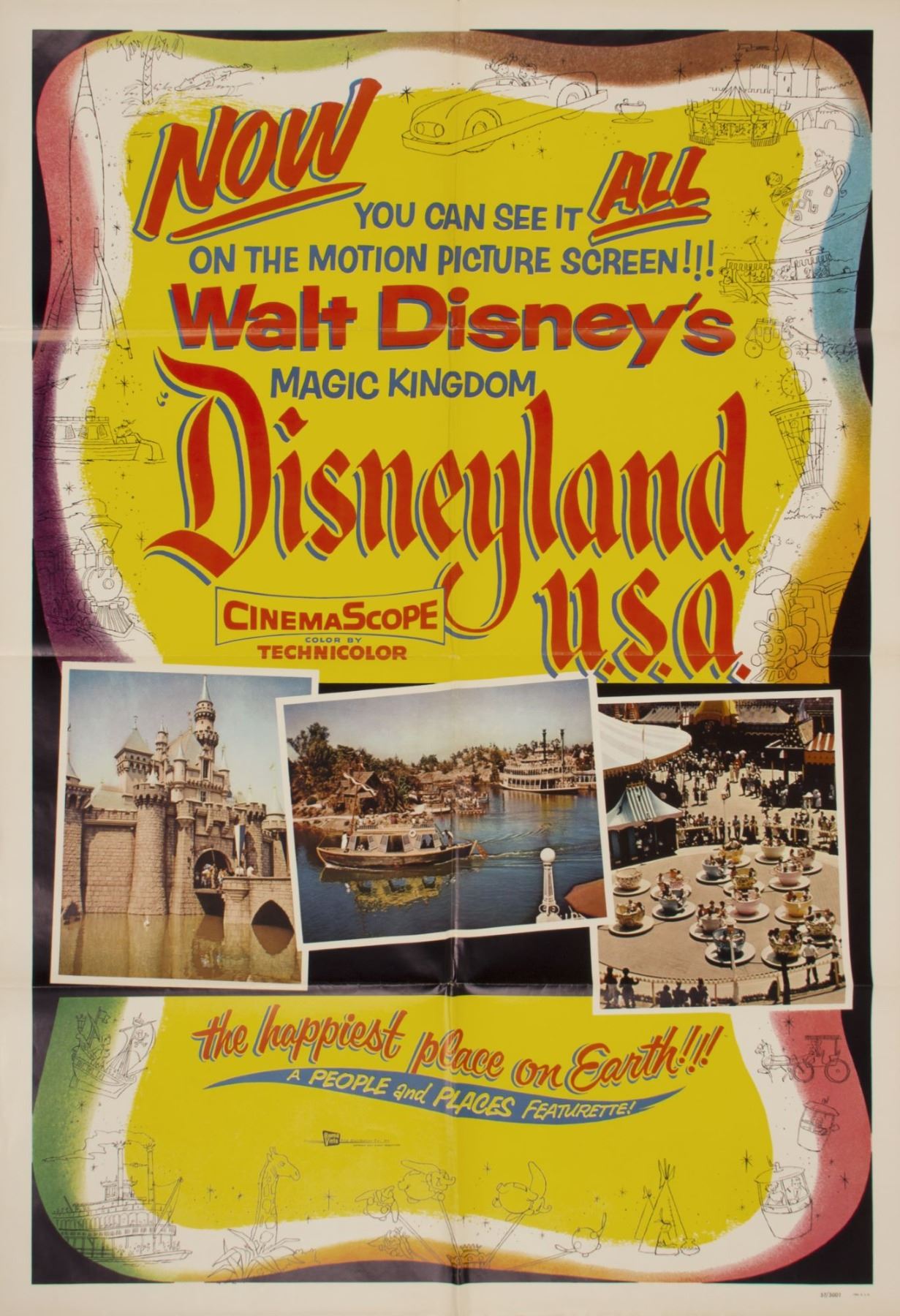 (Disneyland, c.1957) An original one sheet theatrical poster for Disneyland USA, a cinemascope featurette that played in select theaters nation-wide to promote the newest attractions at Disneyland. This poster measures approximately 40.75"x28" and is in very good condition, with some wear to the edges and some tearing along the original fold-lines.