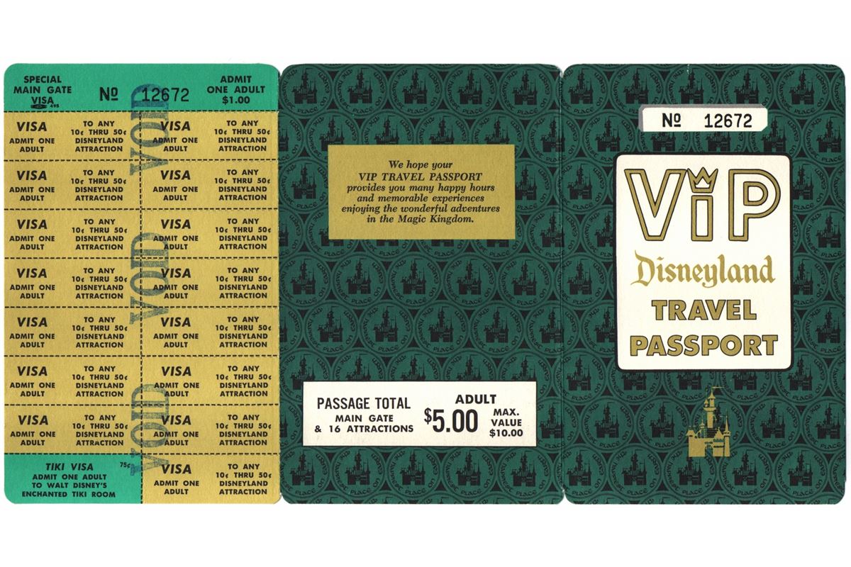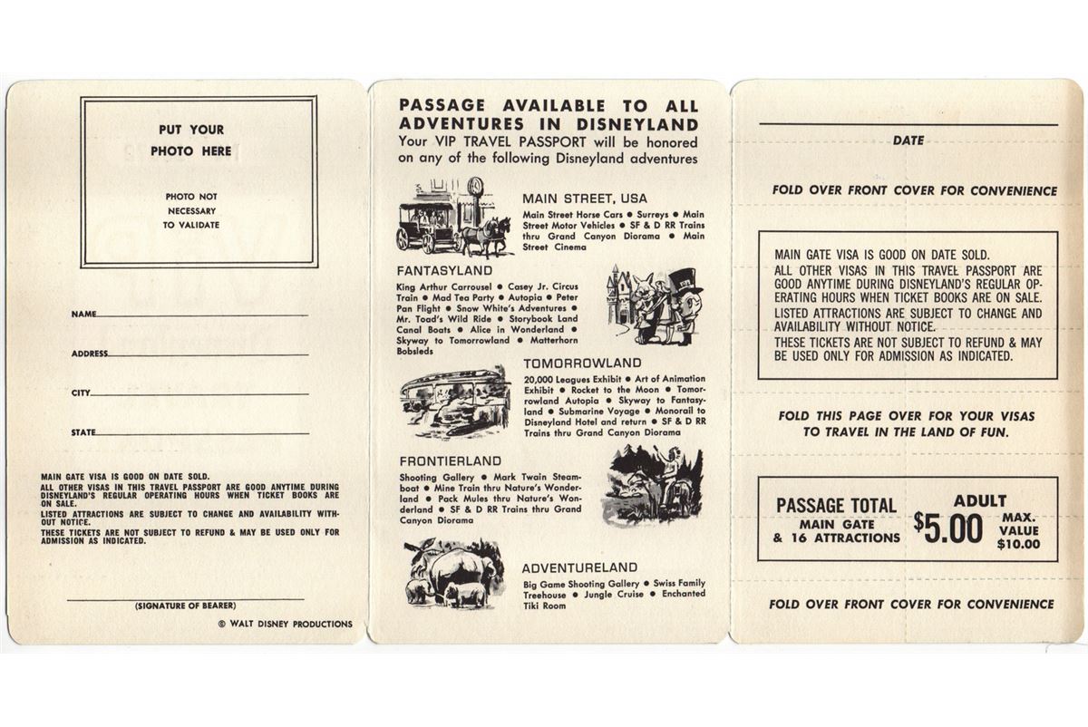 (Disneyland, 1964) Rare ticket produced by Disneyland in what could be called a hybrid of the famous Ticket Book, merged with the 1980s Disneyland Passport. Made in the spirit of an actual government issued travel passport, it features tear-out tickets for use on attractions. Included also is a special ticket for entry into The Enchanted Tiki Room. A very rare ticket item.