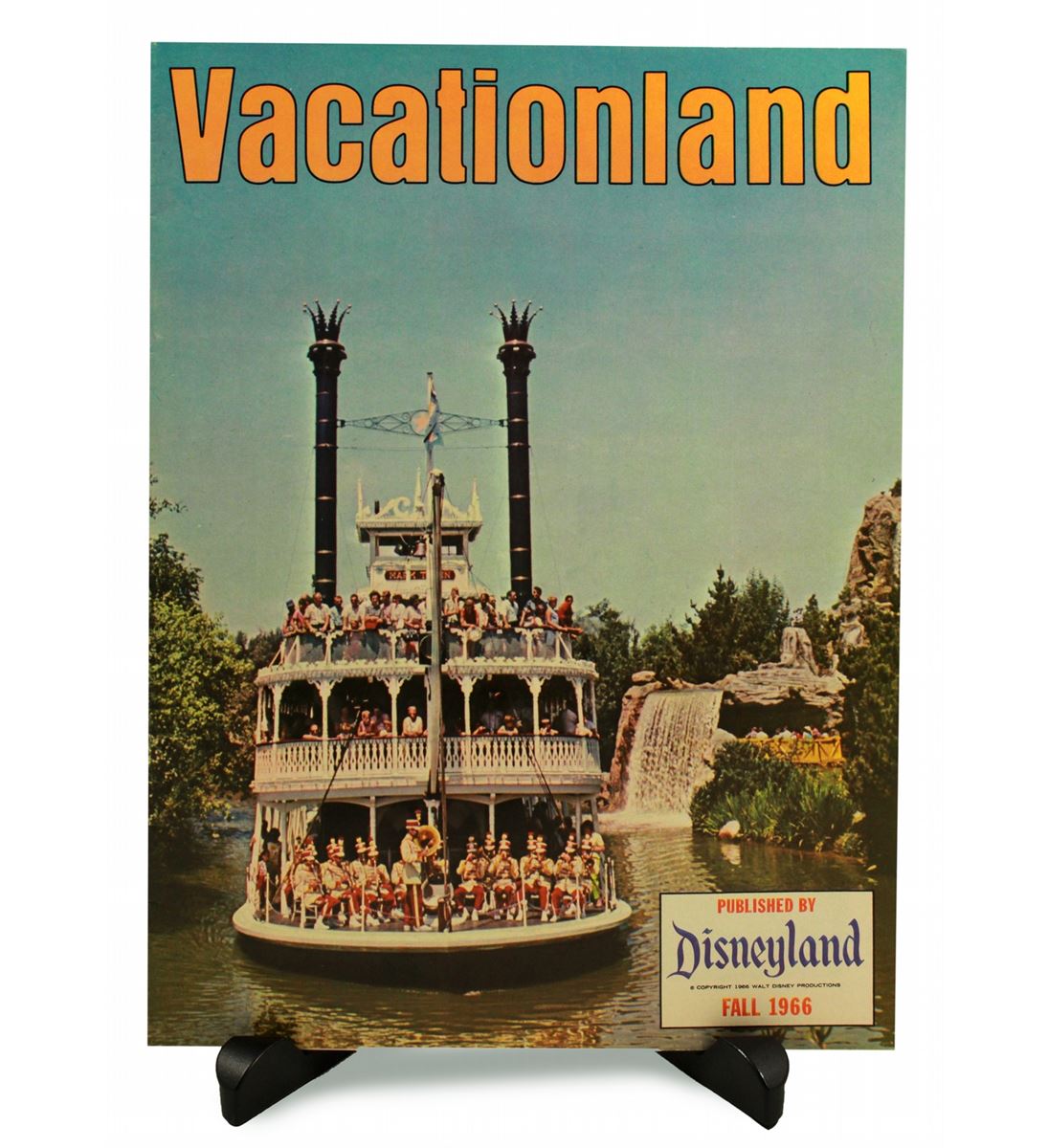 Disneyland Vacationland Magazine from 1966. These beautiful publications are just another example of the forward-thinking strategy the Disney organization used in all manner of park promotion. Rather than draw a line in the sand with competitors, Disneyland invited promotion of nearby attractions and service industry. The mindset being that when individual area businesses do well, we all do well. Disney was very much for the promotion of Southern California as a tourist destination and that included other themed attractions such as Knott's Berry Farm, Movieland Wax Museum and Marineland. Vacationland was published by Disney for placement in area hotels, motels and cross-promoting participant businesses. Editor in Cheif of Vacationland was prolific Disney scribe, Marty Sklar. This 24-page issue dated Fall of 1966 features articles on the Golden Horseshoe, and "Great Moments With Mr. Lincoln. In very good condition overall with very little wear.