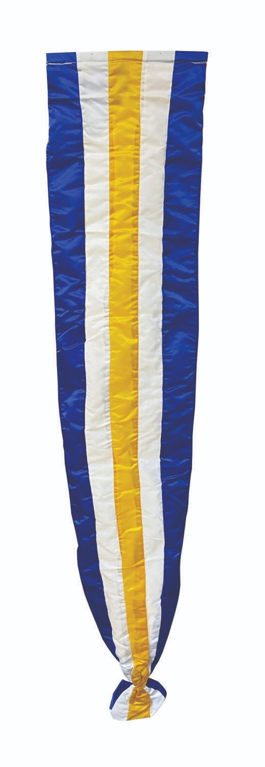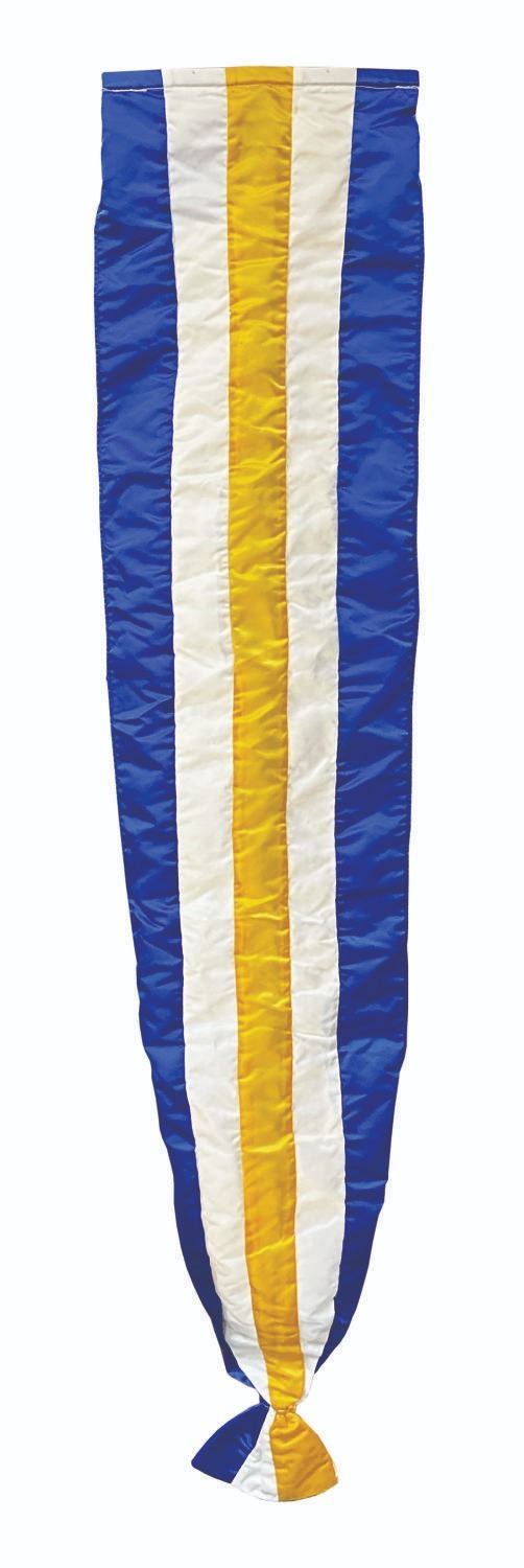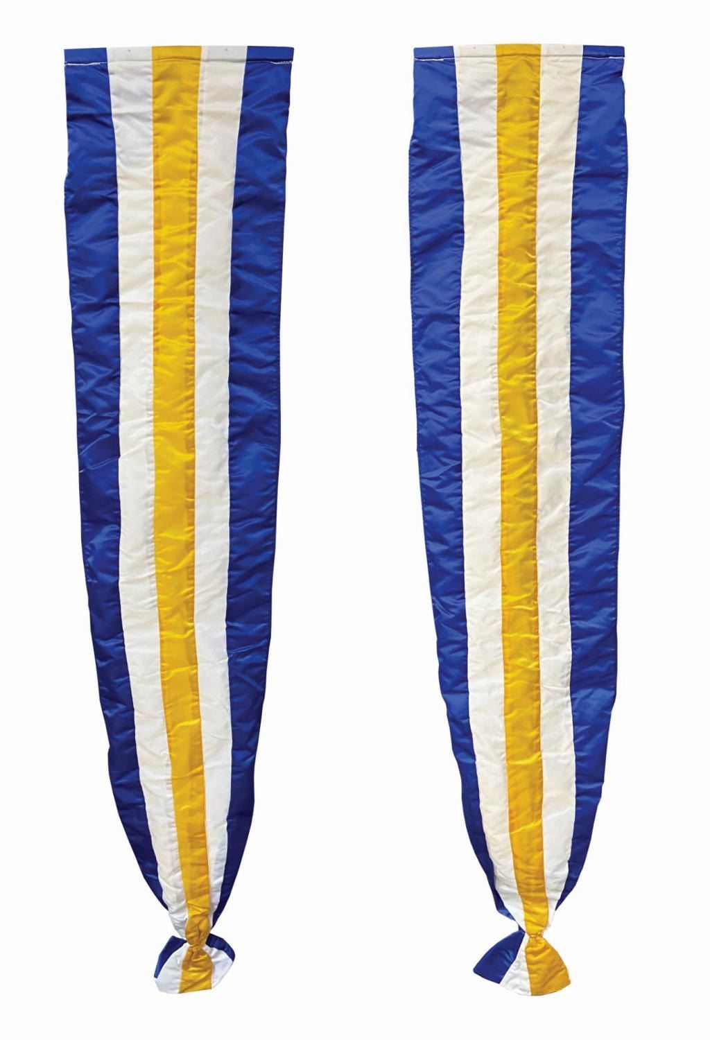(Disneyland, c.2000s) A pair of tri-color vertical banners from Main Street. Constructed of blue, white, and gold synthetic fabric, this style of banner would have been hung from the park's lampposts during events and celebrations. Measuring 58"x12.5", the banners are in very good condition with minor wear.