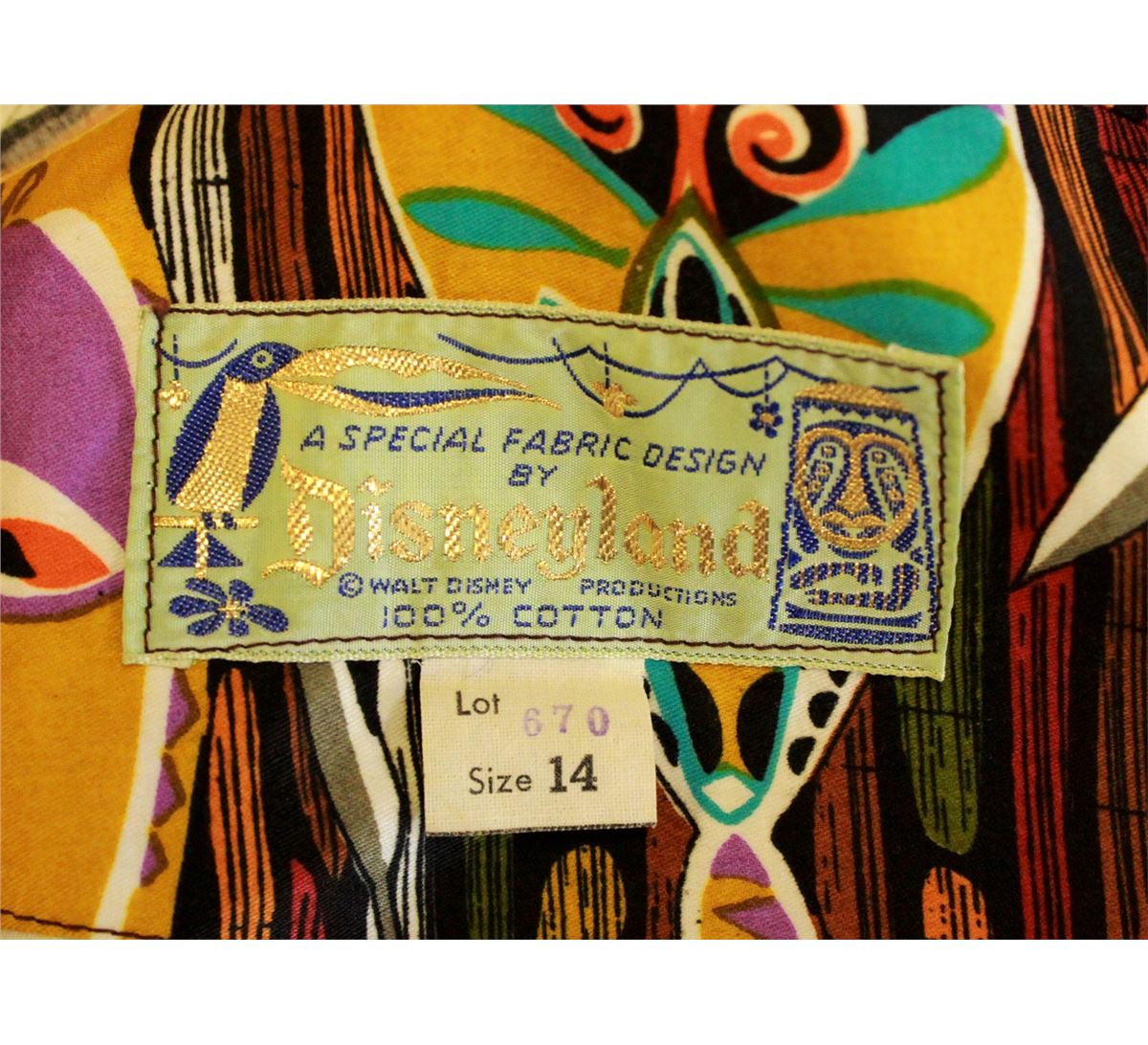 Actually used and worn by the Hostesses in the Enchanted Tiki Room, this is an exceptionally rare cast-member uniform in the rare and sought after Tiki Room pattern. The artful attire was just one of many of the special qualities of the tiki room that made it so memorable. The tag reads, "A Special Fabric Design by Disneyland" and is labeled size 14. Vintage articles of clothing like this may vary slightly to modern sizing. In great condition, with very little wear from use.