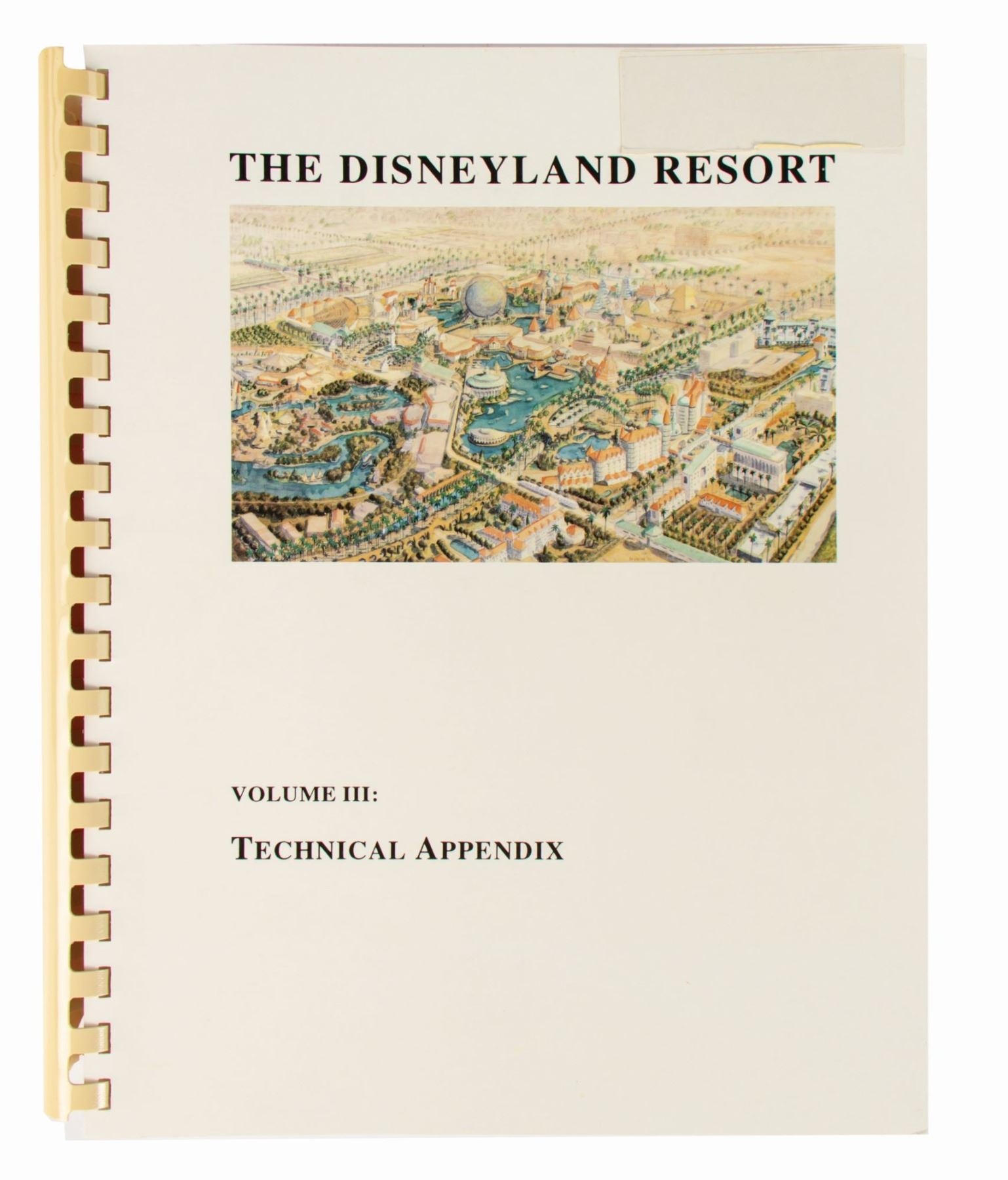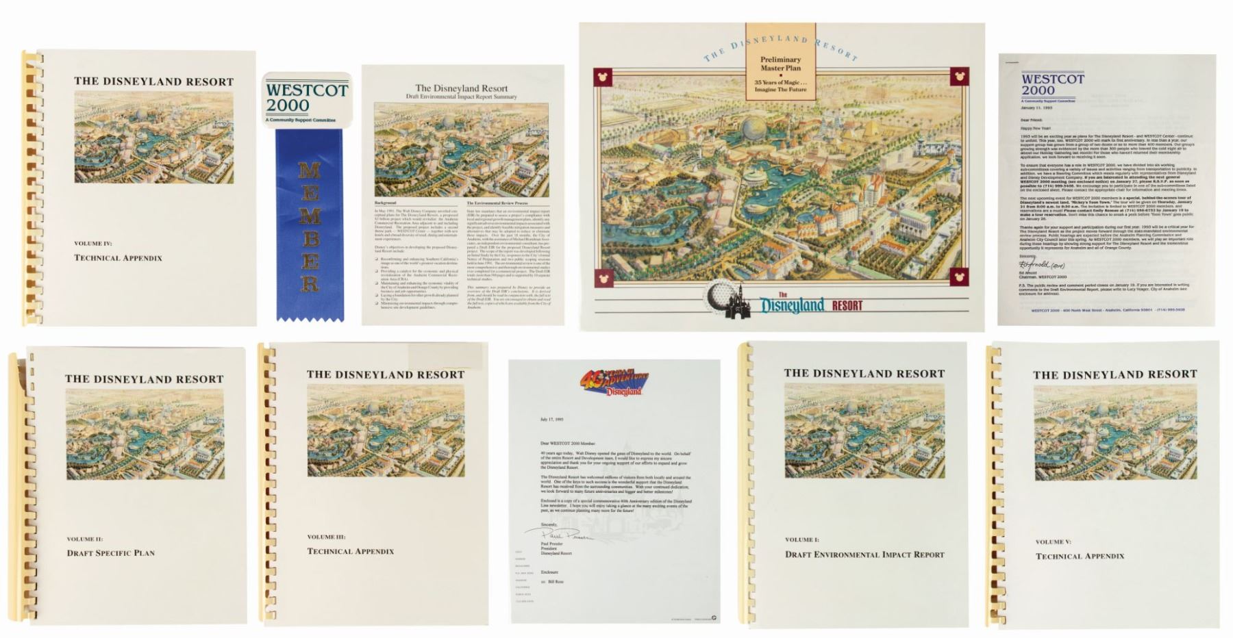 (Disneyland, c.1990s) A fantastic collection of WestCOT 2000 items including: a 5-volume environmental impact report, an impact report summary, (2) letters to supporters, a membership button with ribbon, and a preliminary master plan. WestCOT was a planned expansion to Disneyland that was never realized, but would ultimately lead to the creation of California Adventure. These reports offer a glimpse into the massive Disneyland expansion that could have been. Ranging in size from the 7.5"x2.75" button and ribbon to the 11"x9.25" reports, this collection is in very good condition with minor wear from use.