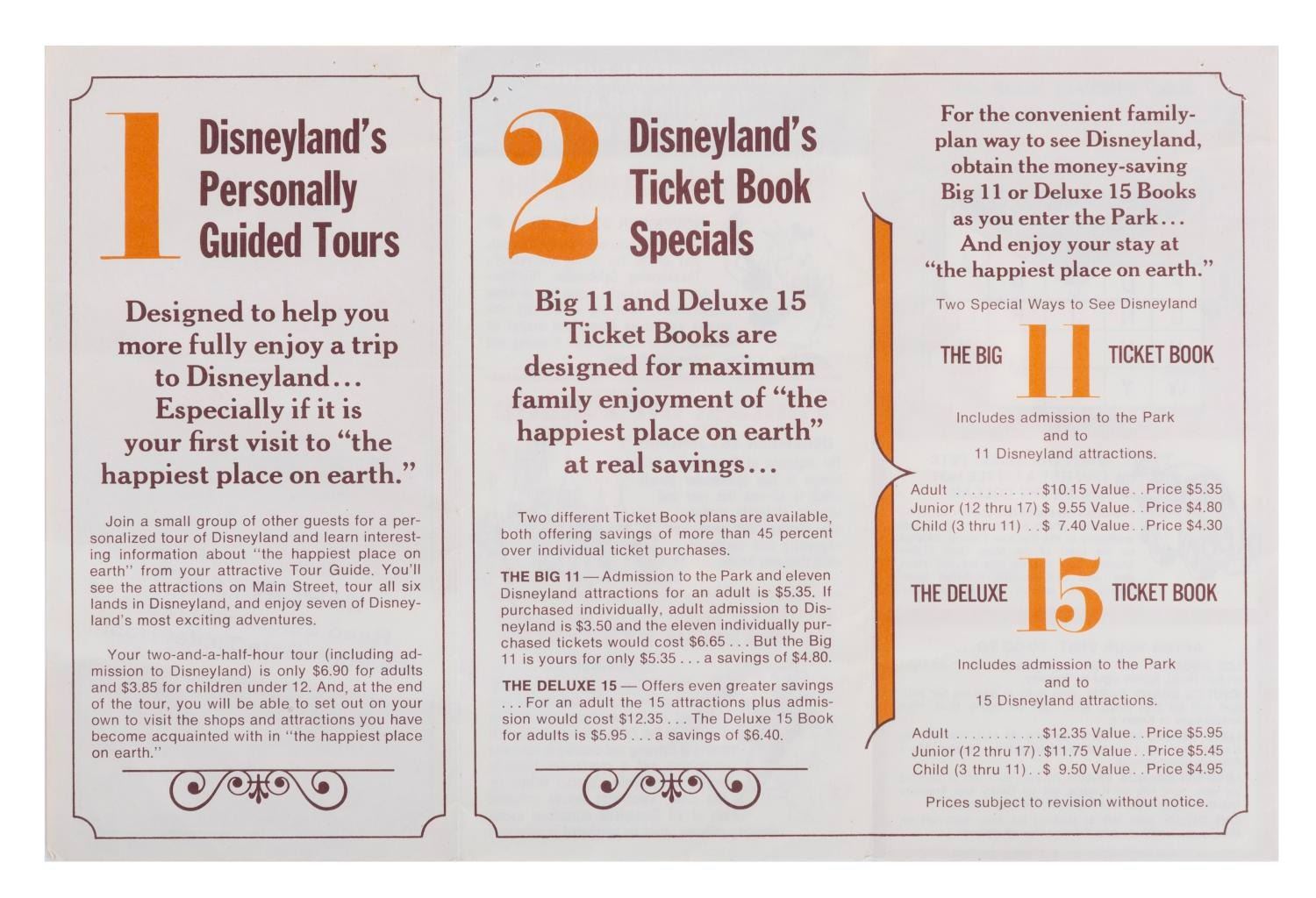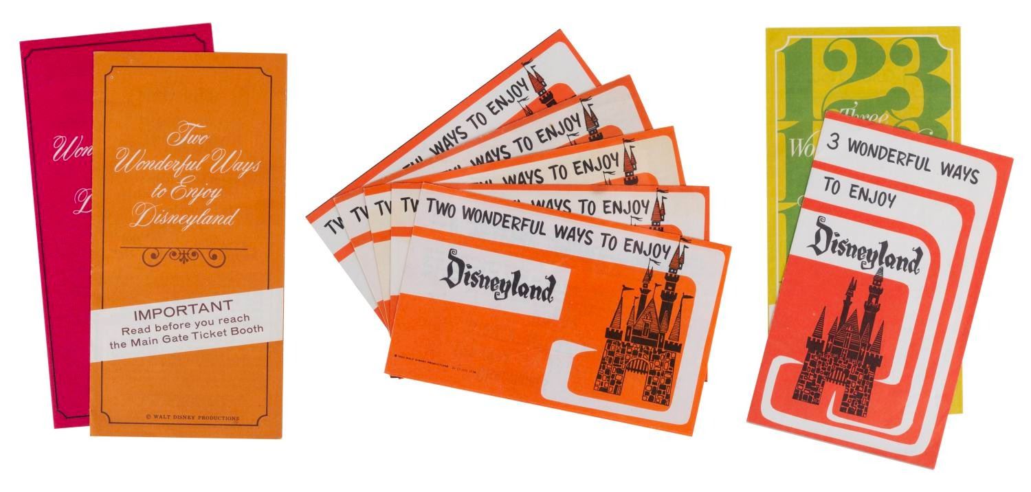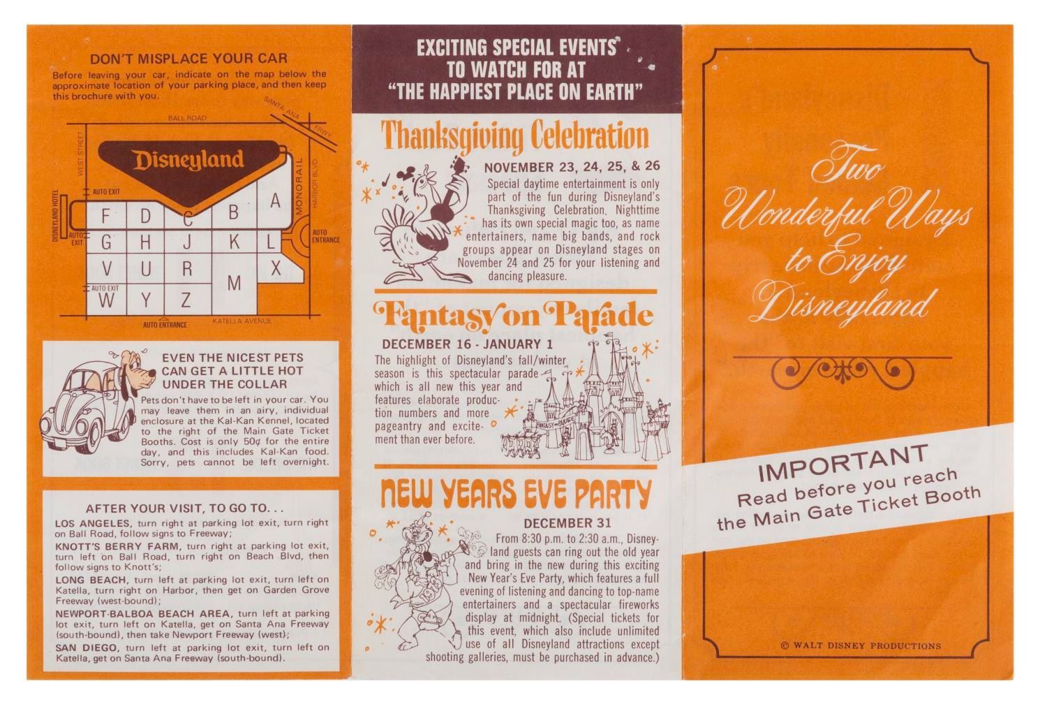 (Disneyland, 1961-70s) A collection of nine Disneyland "Wonderful Ways" Main Gate brochures containing information on the Guided Tours, Ticket Book Specials, and seasonal schedules. Measuring 3.5"x7.25" to 3.5"x5.75", each piece is in very good condition exhibiting minor creases and wear.