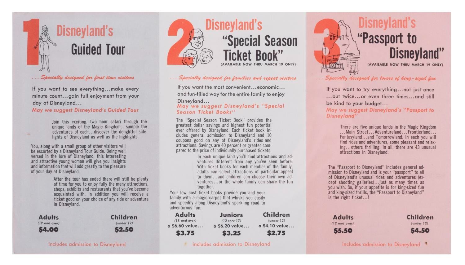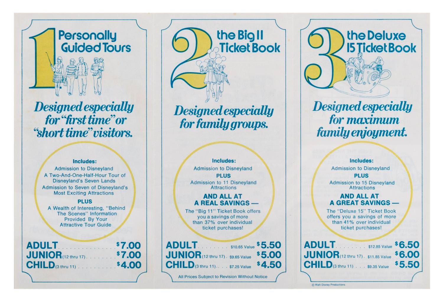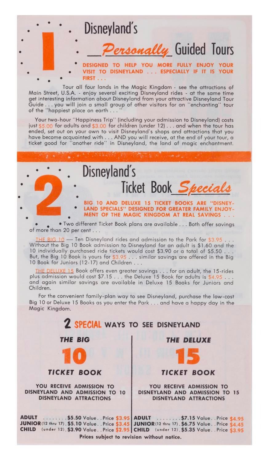 (Disneyland, 1961-70s) A collection of nine Disneyland "Wonderful Ways" Main Gate brochures containing information on the Guided Tours, Ticket Book Specials, and seasonal schedules. Measuring 3.5"x7.25" to 3.5"x5.75", each piece is in very good condition exhibiting minor creases and wear.