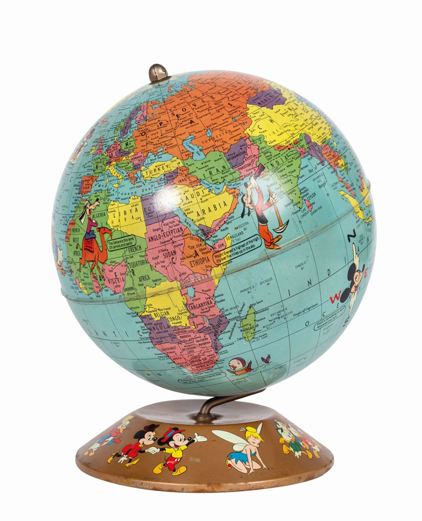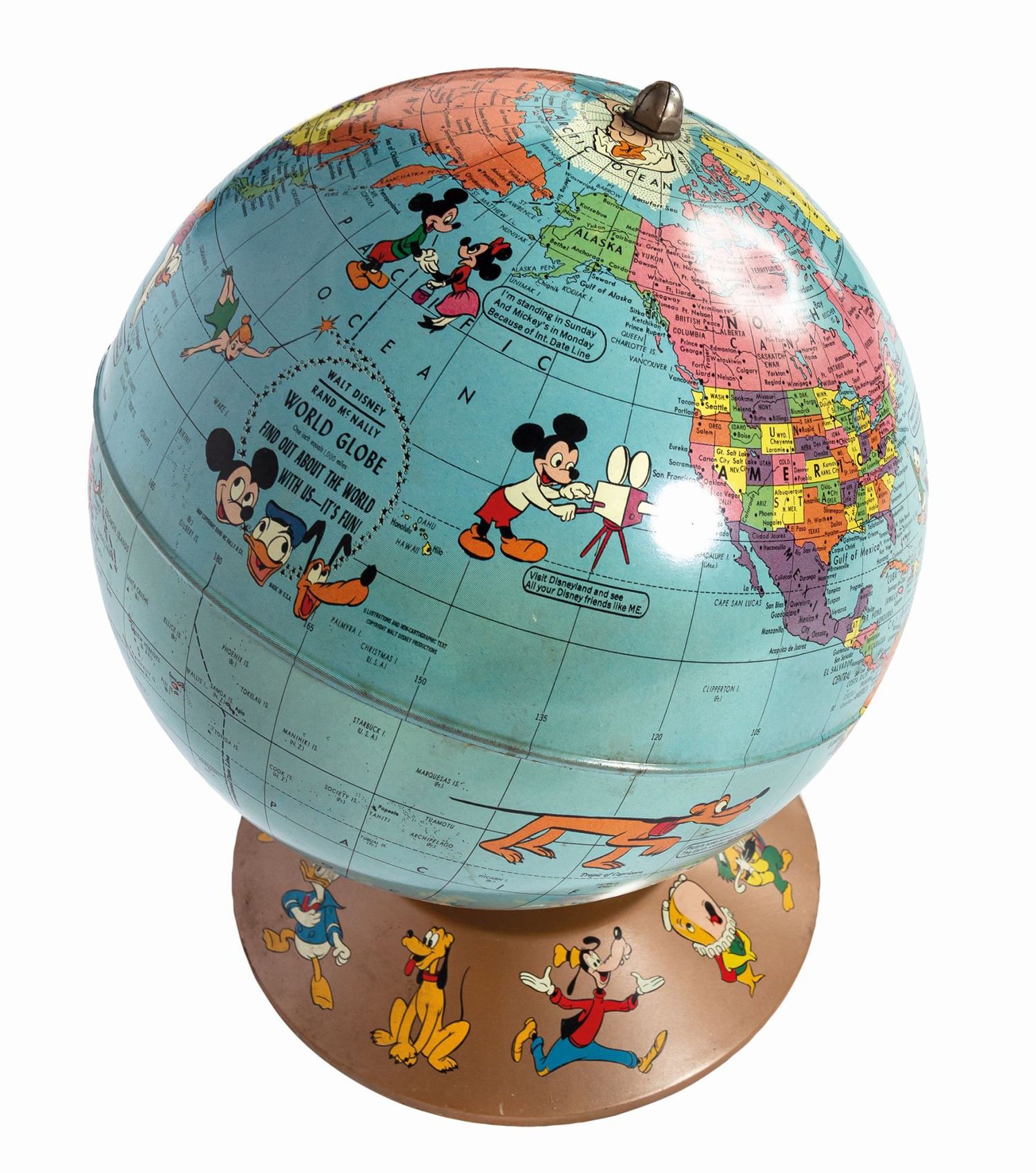 (Disneyland, c.1955) A vintage tin lithograph globe manufactured by Walt Disney and Rand McNally. An illustration near the California coast depicts Mickey Mouse operating a film camera and a caption invites the viewer to visit him at the newly opened Disneyland. Measuring 10” tall on its integral metal stand and approximately 8” in diameter, the globe is in very good condition. There are small dents near Greenland and Japan, as well as faint oxidation around the equator, minor oxidation to the cap, and some oxidation residue to the underside of the base.