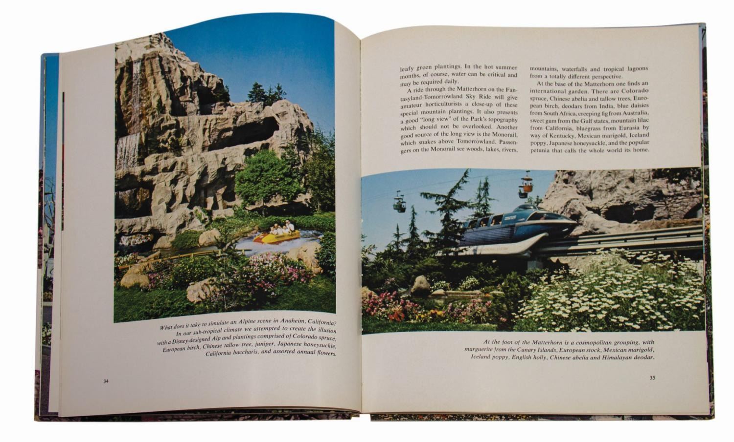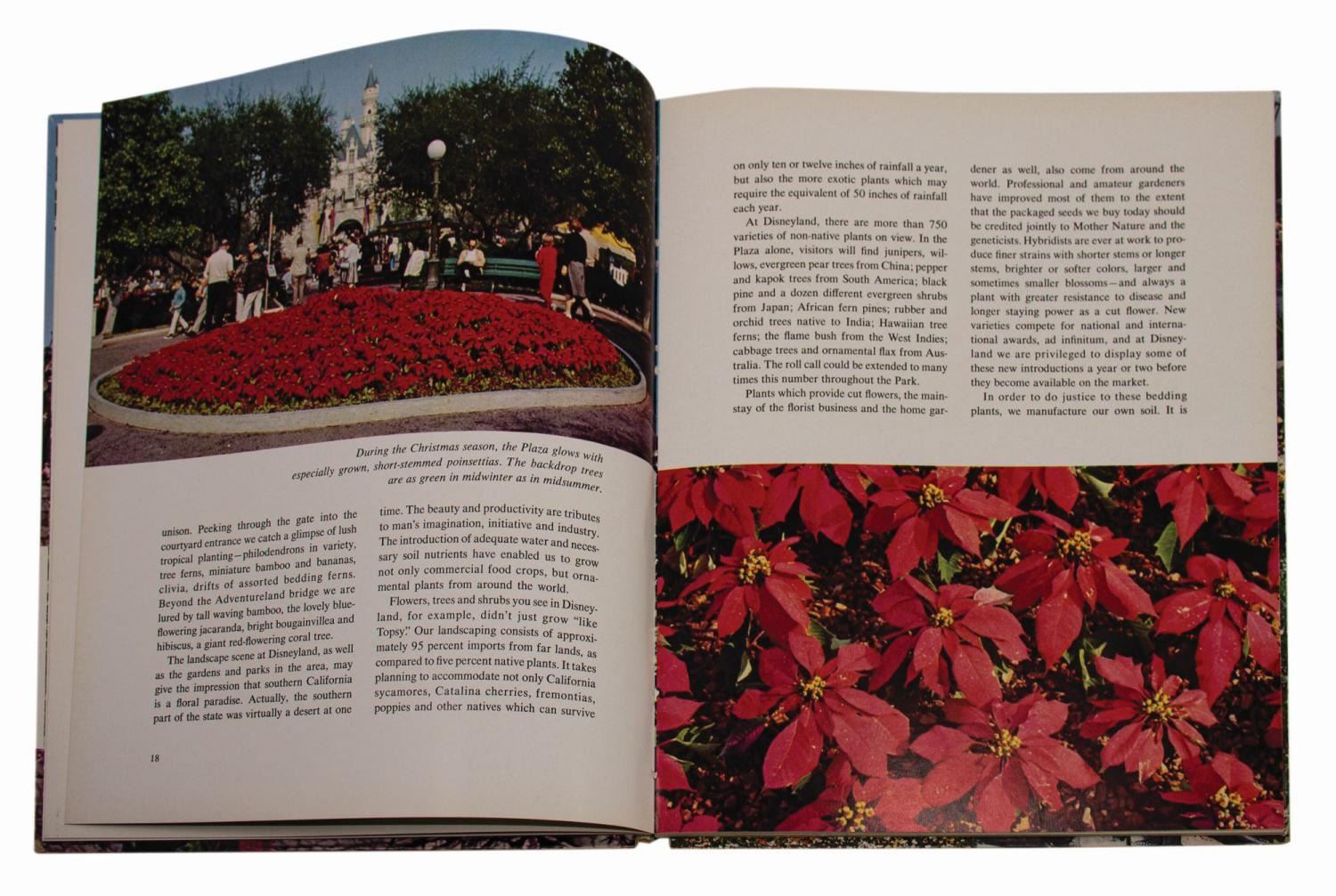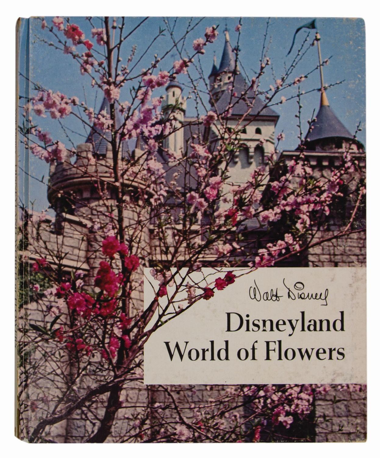 (Disneyland, 1965) A vintage hardcover first edition of Disneyland World of Flowers by Morgan Evans. The 72-page book by the Legendary Disneyland Horticulturist is copiously illustrated with color photos depicting the vast array of flora at the Park that turned a 165-acre swath of semi-arid Anaheim, California into a wonderland of exotic plants, trees, and flowers from all over the world. The book is accompanied by a COA from the Main Street U.S.A. Disneyana store dated "8-31-77." Measuring 11.25"x9.25", the book is in good condition with moderate cover wear. The paper covering the hinge has split completely down the front with some loss, and shows stress, wear, and loss on the reverse (typical with this book).