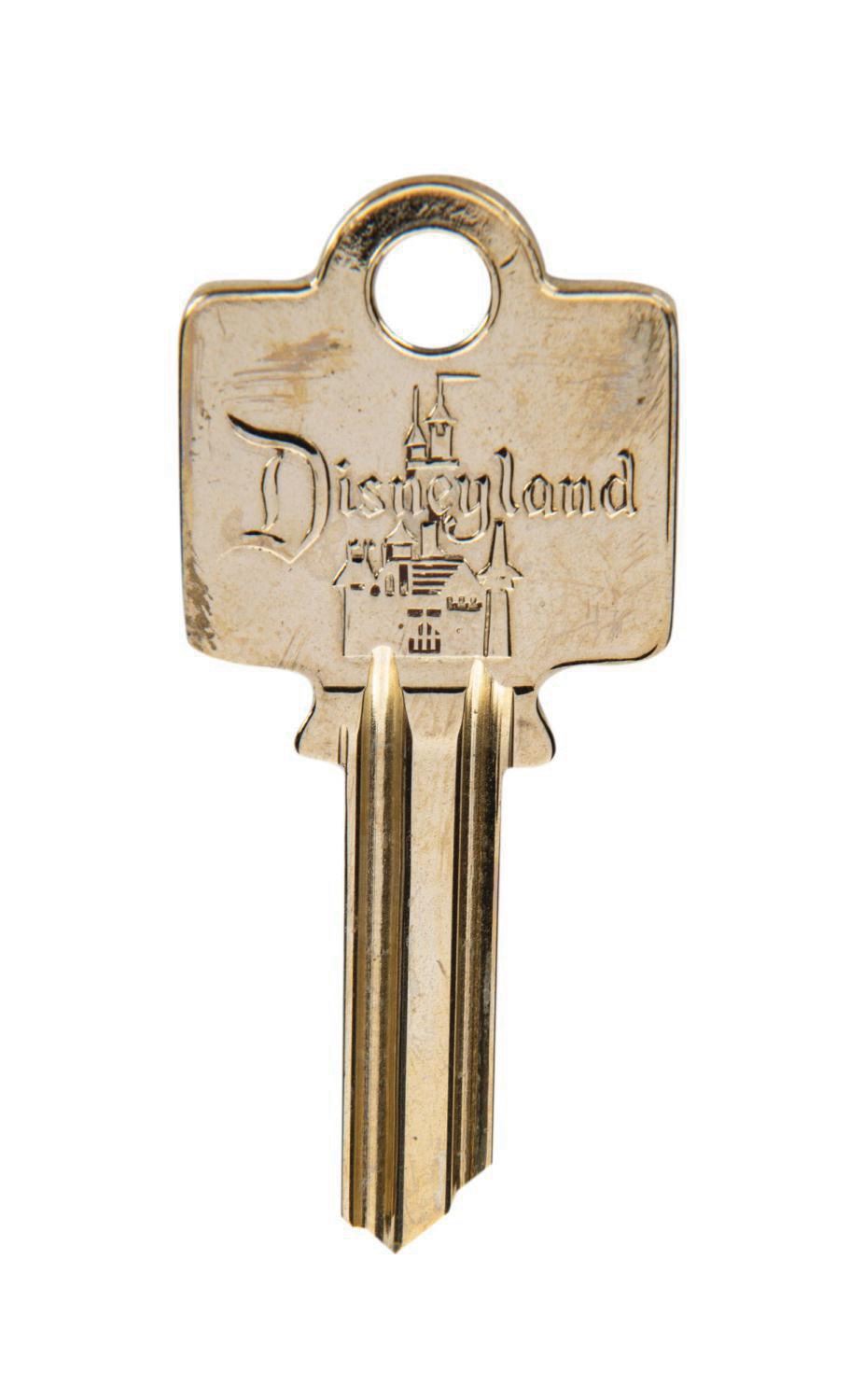 (Disneyland, c.1955) An extremely rare souvenir house key manufactured by Yale and Towne. This style of key was available to guests who visited the Yale Lock Shop on Main Street from opening day through the 1960s and features imagery of Sleeping Beauty Castle. A staple of Disneyland's earliest years, Yale & Towne also manufactured many of the keys for the locks at Disneyland Hotel and in the Park, including Walt's personal apartment. Measuring 2.25"x1", the key is in very good condition with minimal tarnishing to the surface.