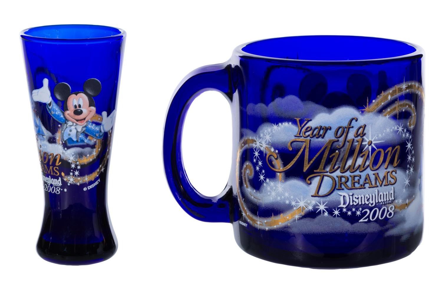 (Disneyland, 2008) A shot glass and mug souvenir of "Year of a Million Dreams" at Disneyland. Each souvenir features dreamlike imagery of Mickey Mouse and the towering spires of Sleeping Beauty Castle. The glass measures 4" tall and 1.75" in diameter and the mug is 3.75" tall and 4.75" in diameter. Each piece is in fine condition.