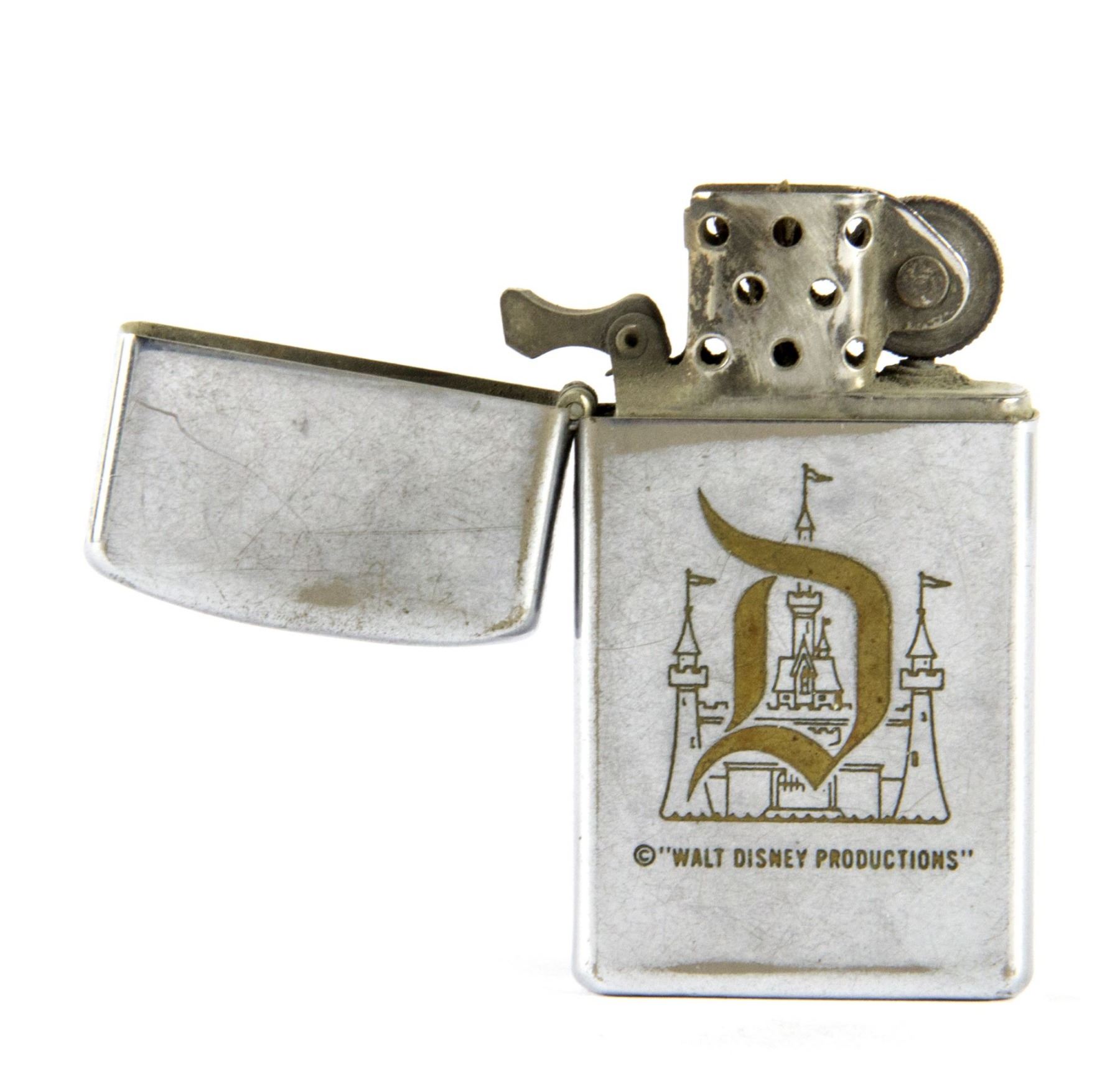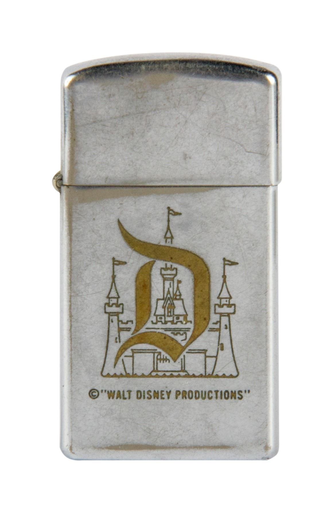 (Disneyland, 1970s) A silver Disneyland Zippo slim lighter featuring a gold "D" on the front with Sleeping Beauty Castle behind it. This lighter measures 2.25"x1.25" and is in fair to good condition with some wear throughout from use.