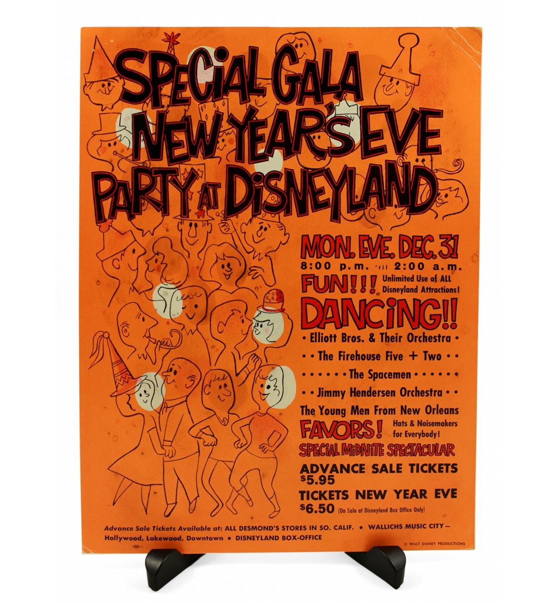 (Disneyland, 1962) Main Gate ticket booth poster for the gala New Year ’s Eve party at Disneyland on December 31st, 1962. These rare point-of-sale posters were printed at the Disneyland Print Shop for exclusive distribution at the Disneyland ticket booths, Desmond department stores and Wallich’s Music City in Downtown Los Angeles. These were the only outlets where special event tickets were available for sale. Measuring 12 x 9 in. and in very good condition.