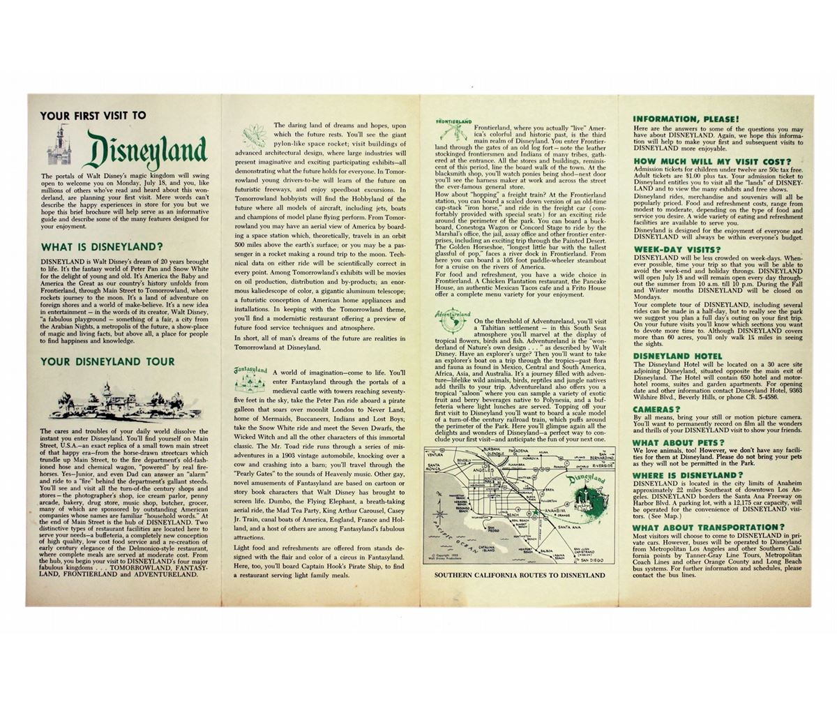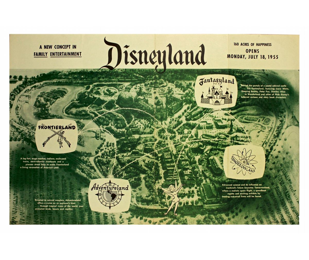 (Disneyland, 1955) The first of many to come, this gate flyer was offered at the park’s front gates before opening day and at selected retail outlets throughout Southern California. Flyer measures 11 x 16.75 in. Very good condition.