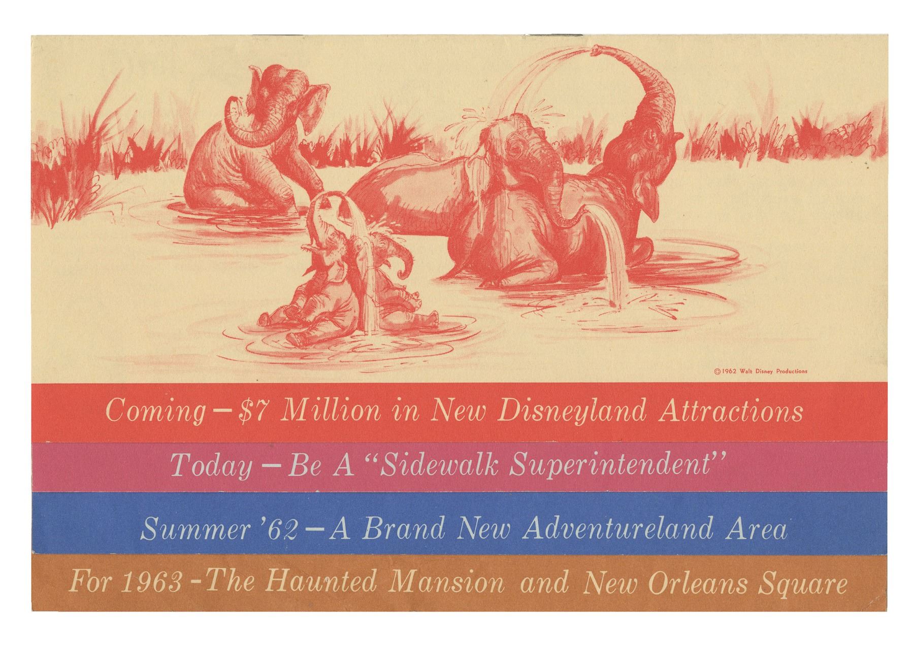 (Disneyland, 1962) A rare gate flyer featuring information and concept art for the $7 million in new Disneyland attractions that were under construction in 1962. The flyer flips up in 4 sections to discuss the Swiss Family Treehouse, Haunted Mansion, and the new Adventureland area. Measuring 5"x7.5", the flyer is in very good condition with some creasing along the bottom edge.