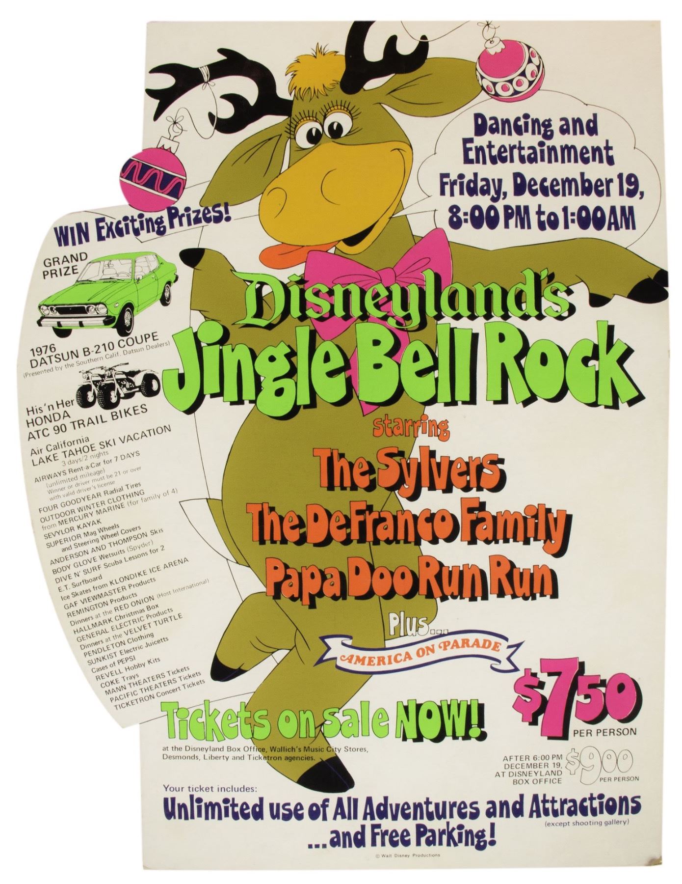 (Disneyland, 1975) A counter display for Disneyland's "Jingle Bell Rock" event in December of 1975. The event offered nighttime musical entertainment, prizes, and promoted "America on Parade". The display is on sturdy board with a foldable stand attached to the back. This display measures 16.25"x12" and is in very good condition with minor edge-wear from use.