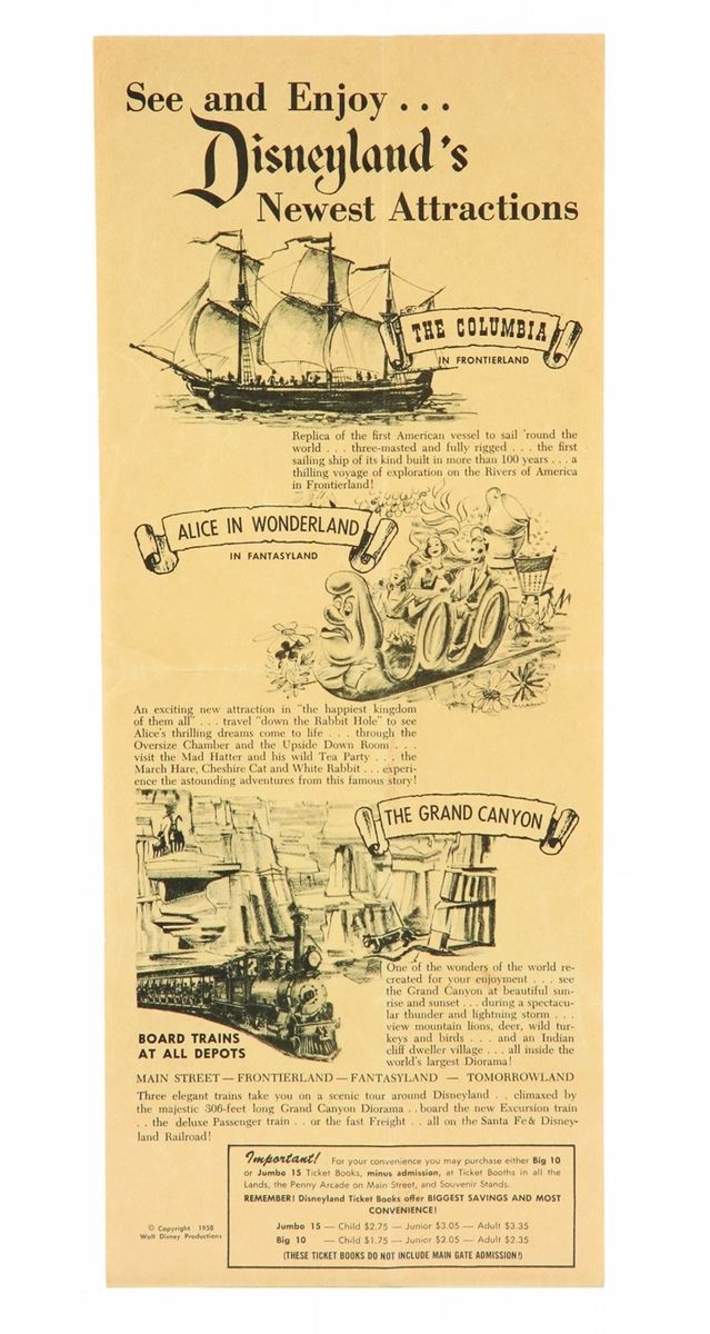 (Disneyland, 1958) Many of the well-known Disneyland attractions were not in the park opening year. Budget overruns and time constraints made the deferment of many of the planned attractions necessary. This 1958 gate flyer announces the newest additions to the park; The sailing Ship Columbia, The Alice in Wonderland ride, and the Grand Canyon Diorama. Good condition with creases from a double fold. 12.5”x5”.