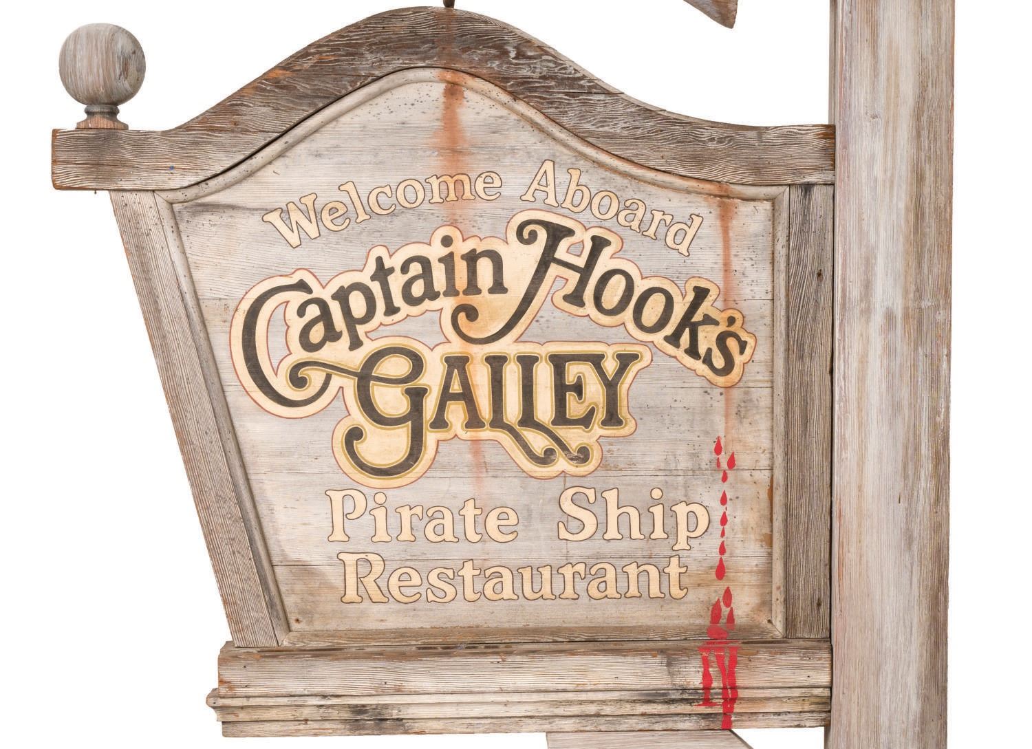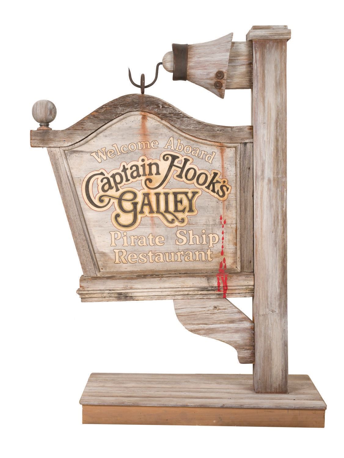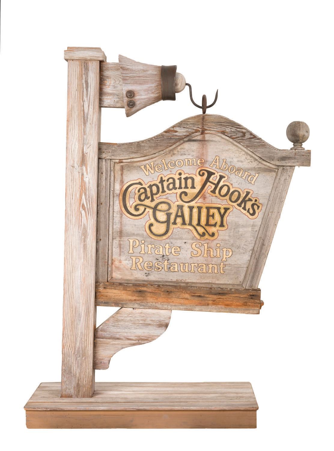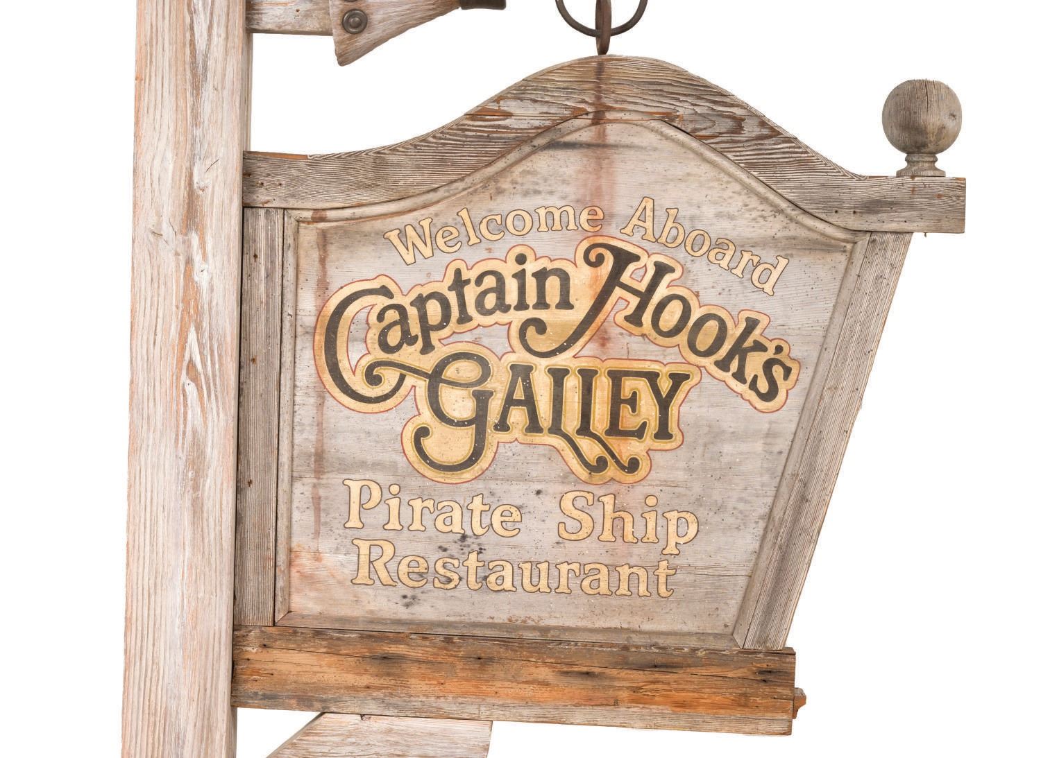 (Disneyland, 1969-1982) The original Captain Hook's Galley sign from the iconic Fantasyland restaurant. After the Chicken of the Sea Pirate Ship and Restaurant was renamed in 1969, this sign identified the iconic landmark Pirate ship restaurant until it was removed to make way for New Tomorrowland in 1982. The original sign is presented with an expertly crafted recreation of the Hook it was displayed with, on post and base evocative of the Disneyland classic display. Measuring 45.5"x47"x3.75", the sign displays in fine condition with typical wear from Park use. The custom display base measures 48.5"x25", with the post bringing the display to a full 80" height.