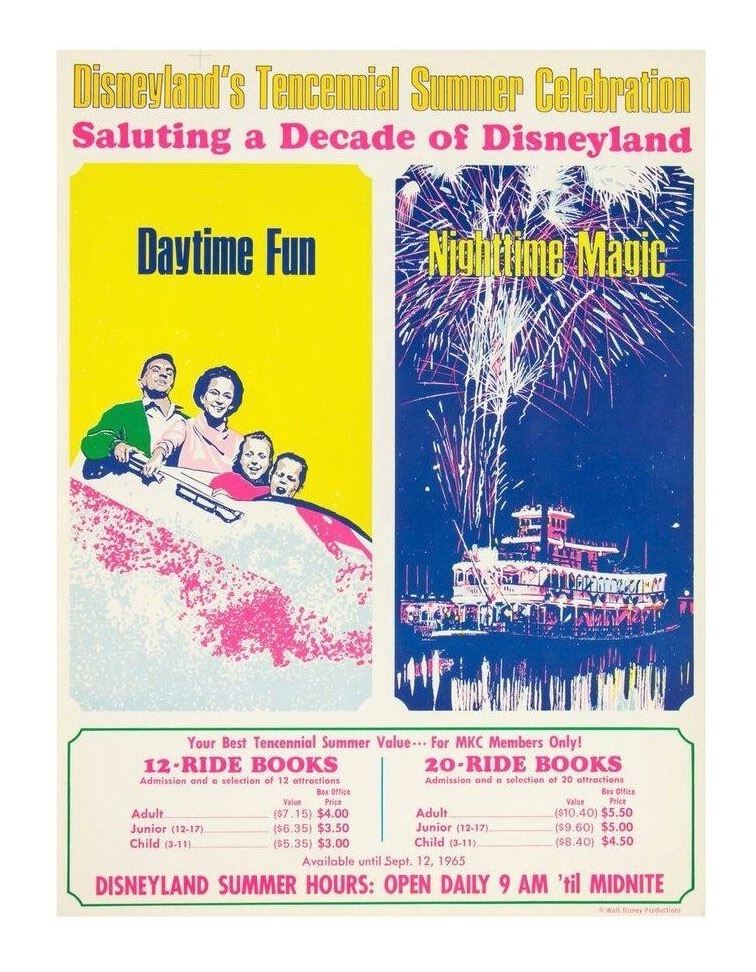 (Disneyland, 1965) A ticket poster for Disneyland's "Tencennial Summer Celebration" in 1965. The poster lists Magic Kingdom Club membership offers for ticket books, and has two large images representing the various daytime and nighttime activities at the park. The colorful poster measures 12"x9" and is in very good condition.