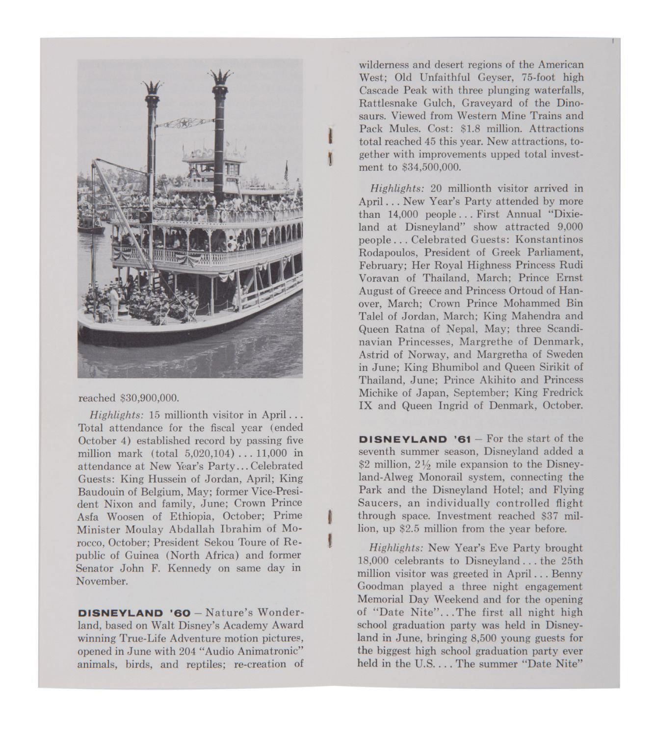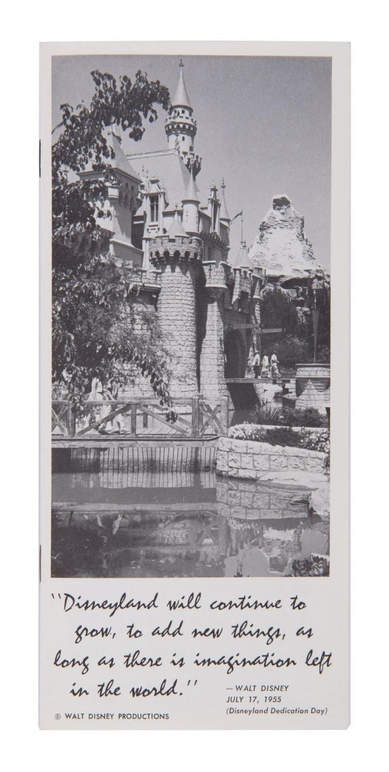 (Disneyland, 1964) A Disneyland brochure featuring annual Park highlights from 1955 to 1964. Black and white photos are shown throughout, and one of the newest Disneyland Tour Guides, Theresa, is introduced. Measuring 8.5"x4", the 8-page brochure is in fine condition with very little wear.
