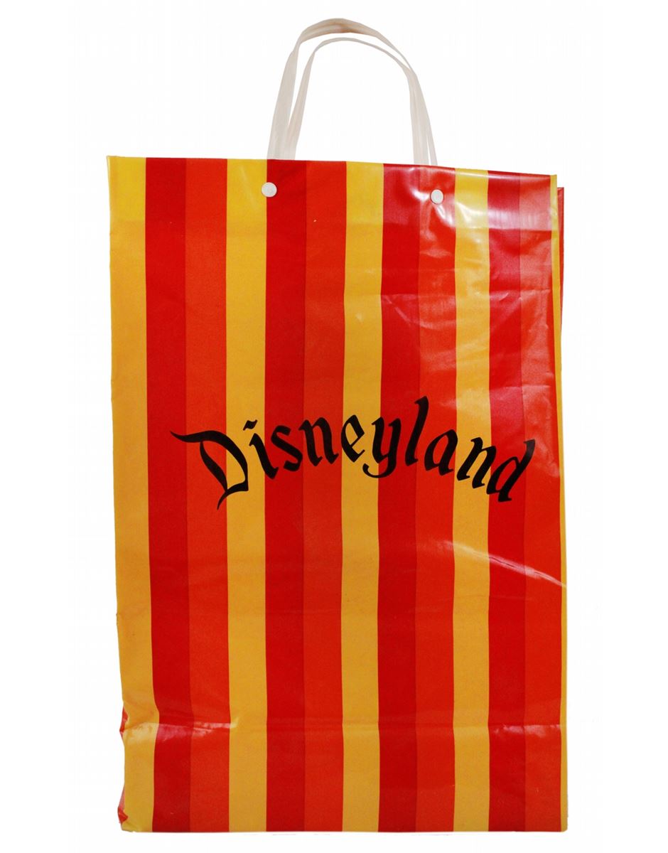 (Disneyland, 1963) A very rare, large graphic shopping plastic bag showcasing the iconic Disneyland graphic sensibility. Most probably used at the Main Street Emporium. Hard-to-find, especially in this size. Measuring 21 x 12 in. and in very good condition with wear from use.