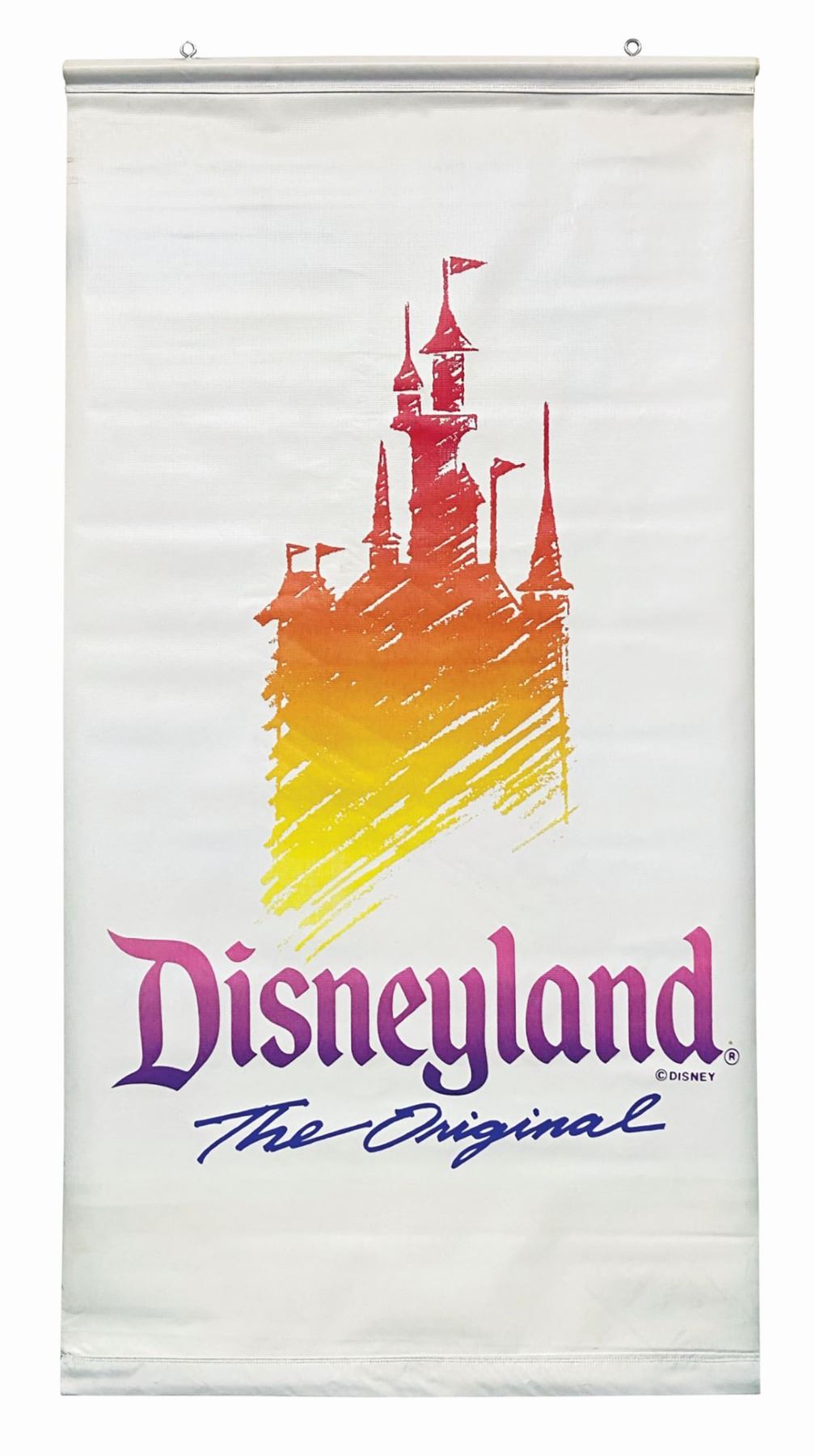 (Disneyland, c.1993) A large double-sided Disneyland banner featuring an image of Sleeping Beauty Castle and the park's early 1990's slogan "Disneyland: The Original." The canvas banner measures approximately 65"x35.5" and is in good condition with some expected minor wear from use.