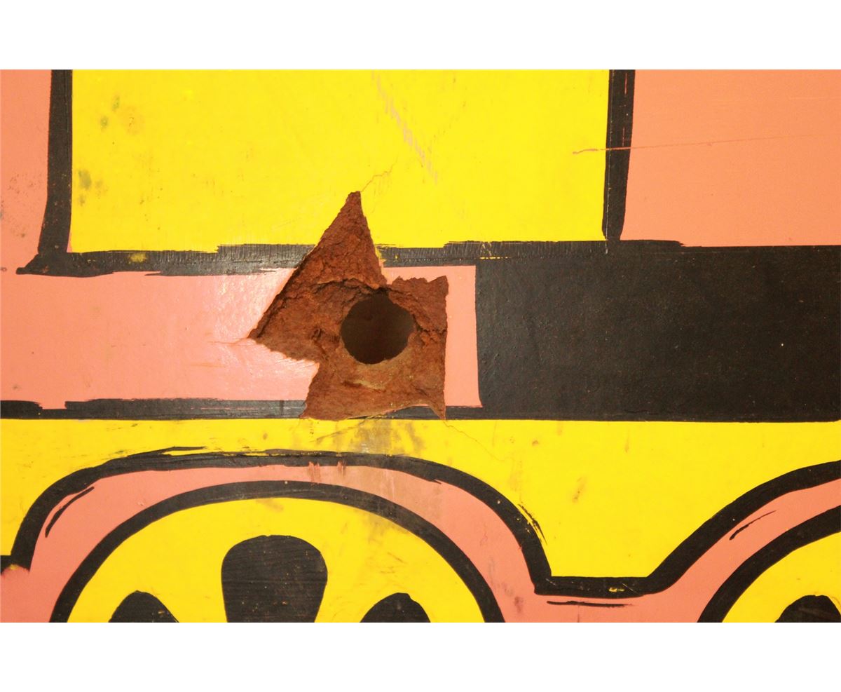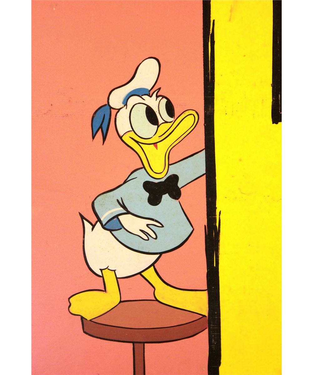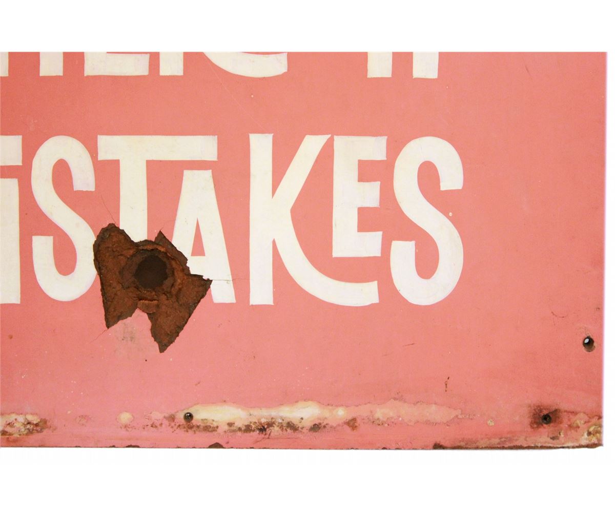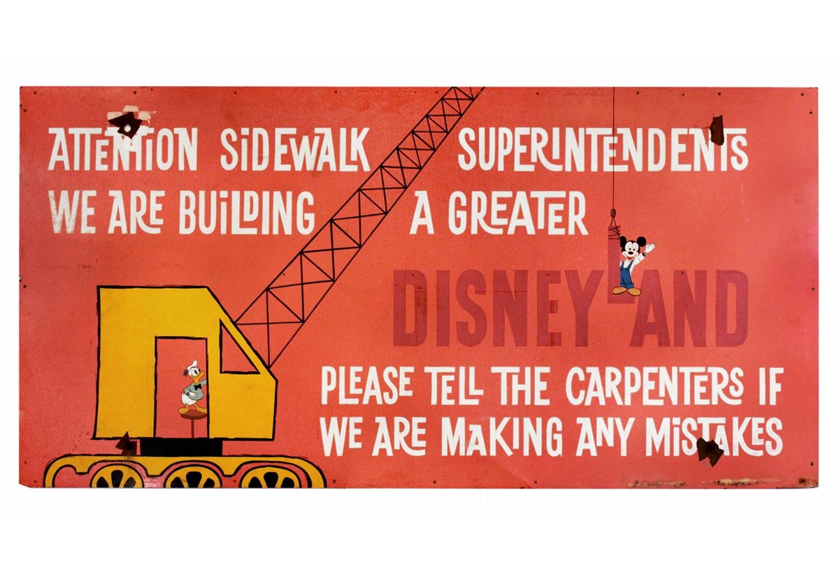 (Disneyland, 1962) Rare original hand-painted heavy masonite sign posted in the park during construction or repair of attractions. Measuring 48 x 96 in. and in good condition with chipping and wear from use.