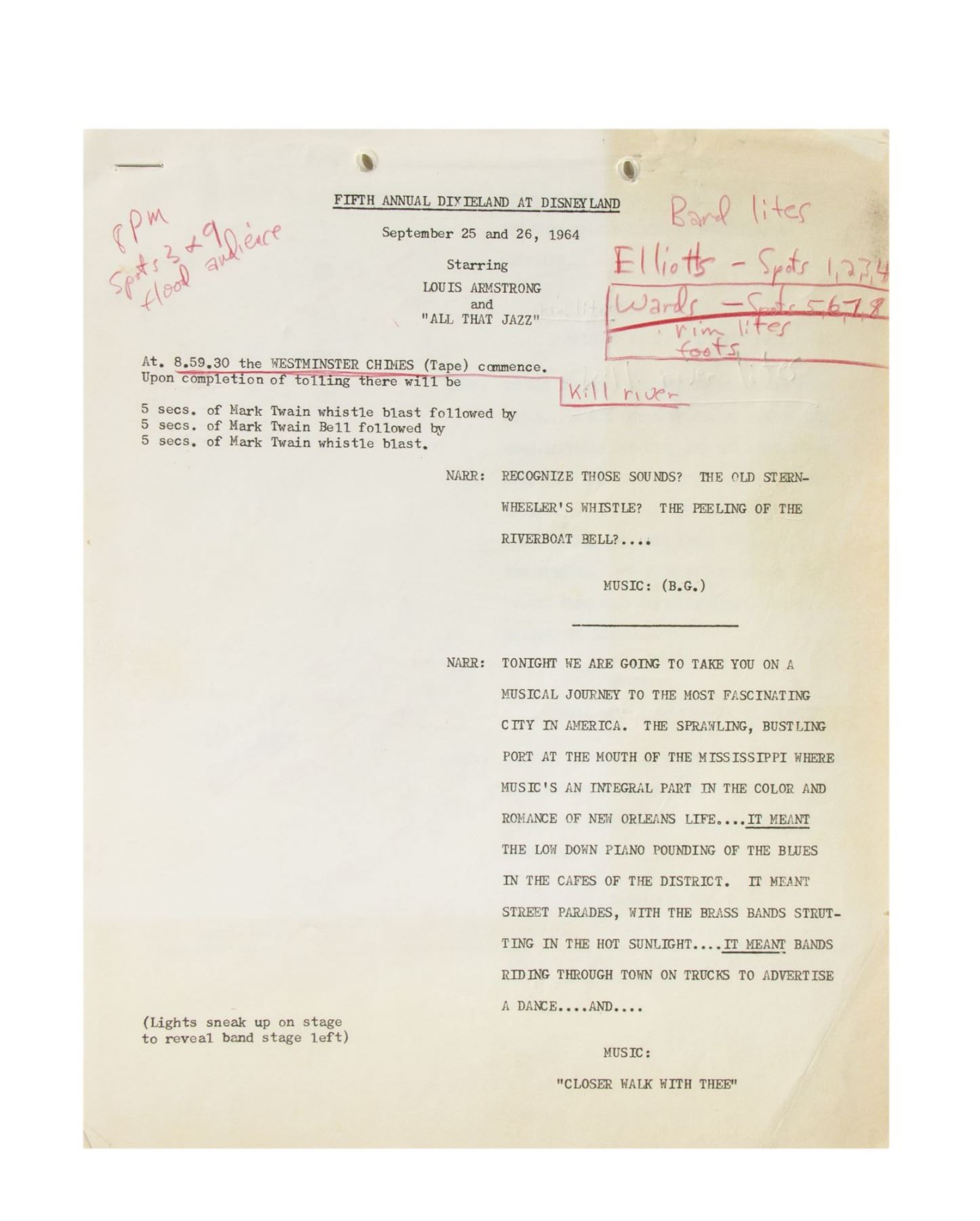 (Disneyland, 1964) An incredible 9-page script for the Fifth Annual Dixieland at Disneyland events. This script features numerous hand-written notes in red and black pencil. The script measures 11"x8.5" and is in very good condition with some minor discoloration and wear from use.