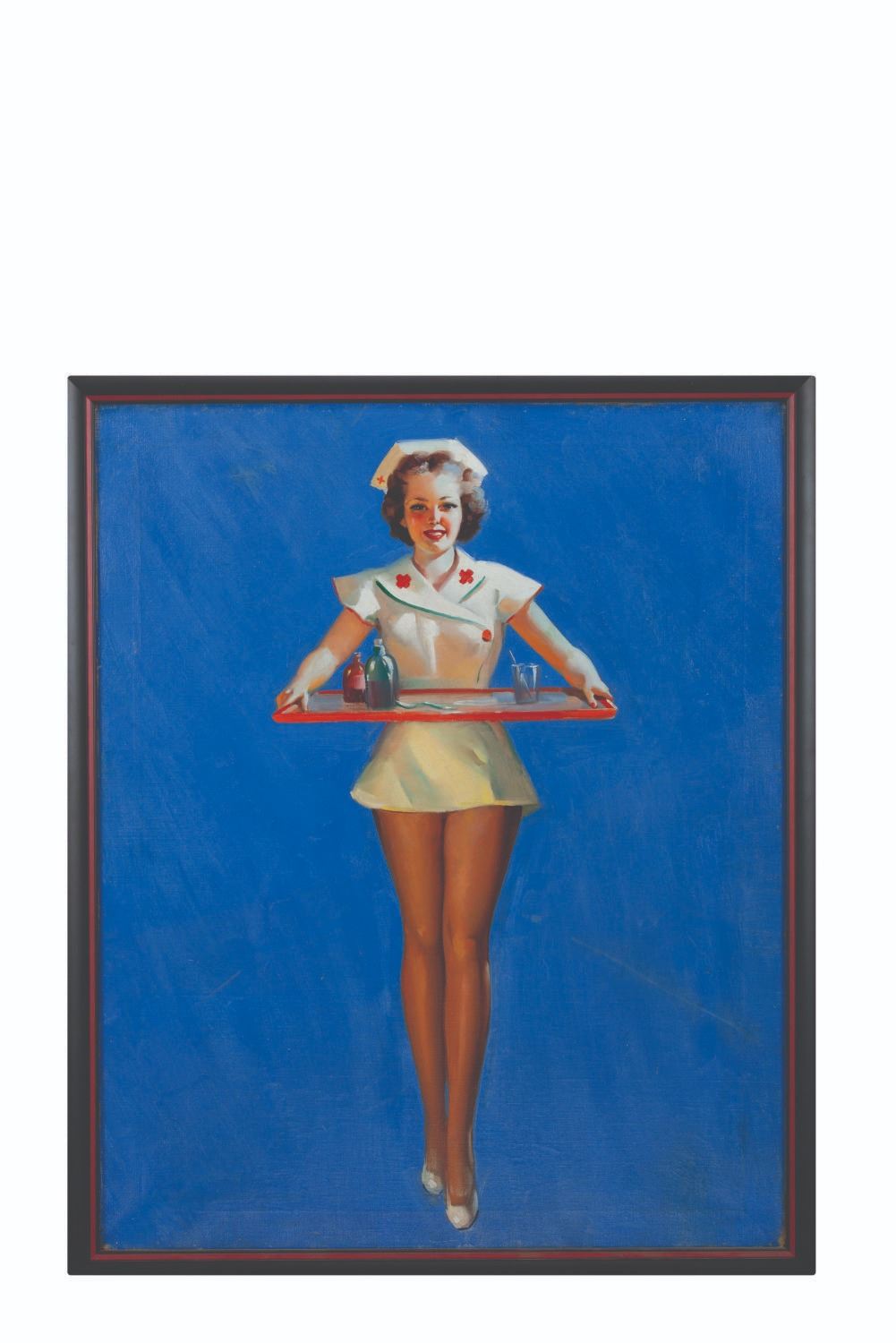 (Elvgren, 1937) The original painting for the pinup "Doctor's Orders" by Gil Elvgren. Elvgren (1914-1980) is a noted American pinup artist who graduated from the American Academy of Art in 1936. In 1937, he joined a stable of artists painting calendar pinups for Louis F. Dow, a leading publishing company. During this time, he created 60 original pin-up paintings, including "Doctor's Orders," which has become one of his most famous images. The piece is painted over an earlier work entitled "Figure's Don't Lie," which was reworked using the same face into "Doctor's Orders." The canvas was professionally retouched to conceal elements of the early work that were still visible. Both pinups are typically dated to 1939, but this canvas bears the date April 20, 1937, with copyright attributed to Louis F. Dow Co. Measuring 26" x 32", the painting is in fine condition.