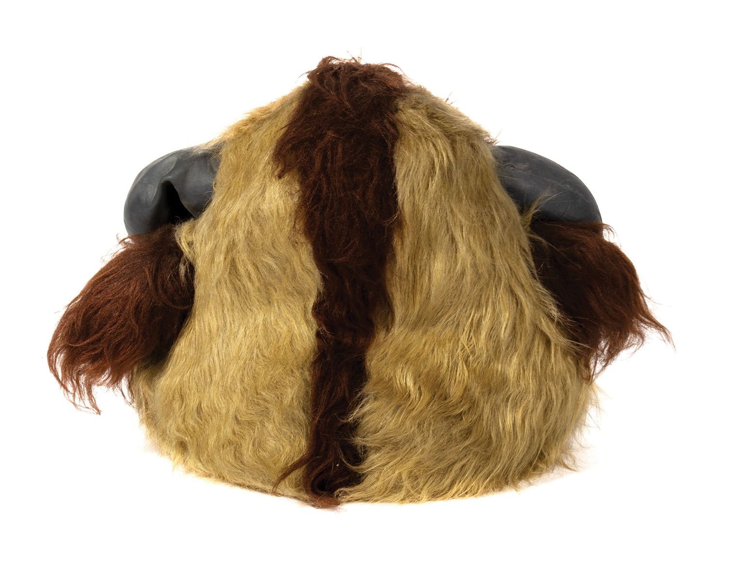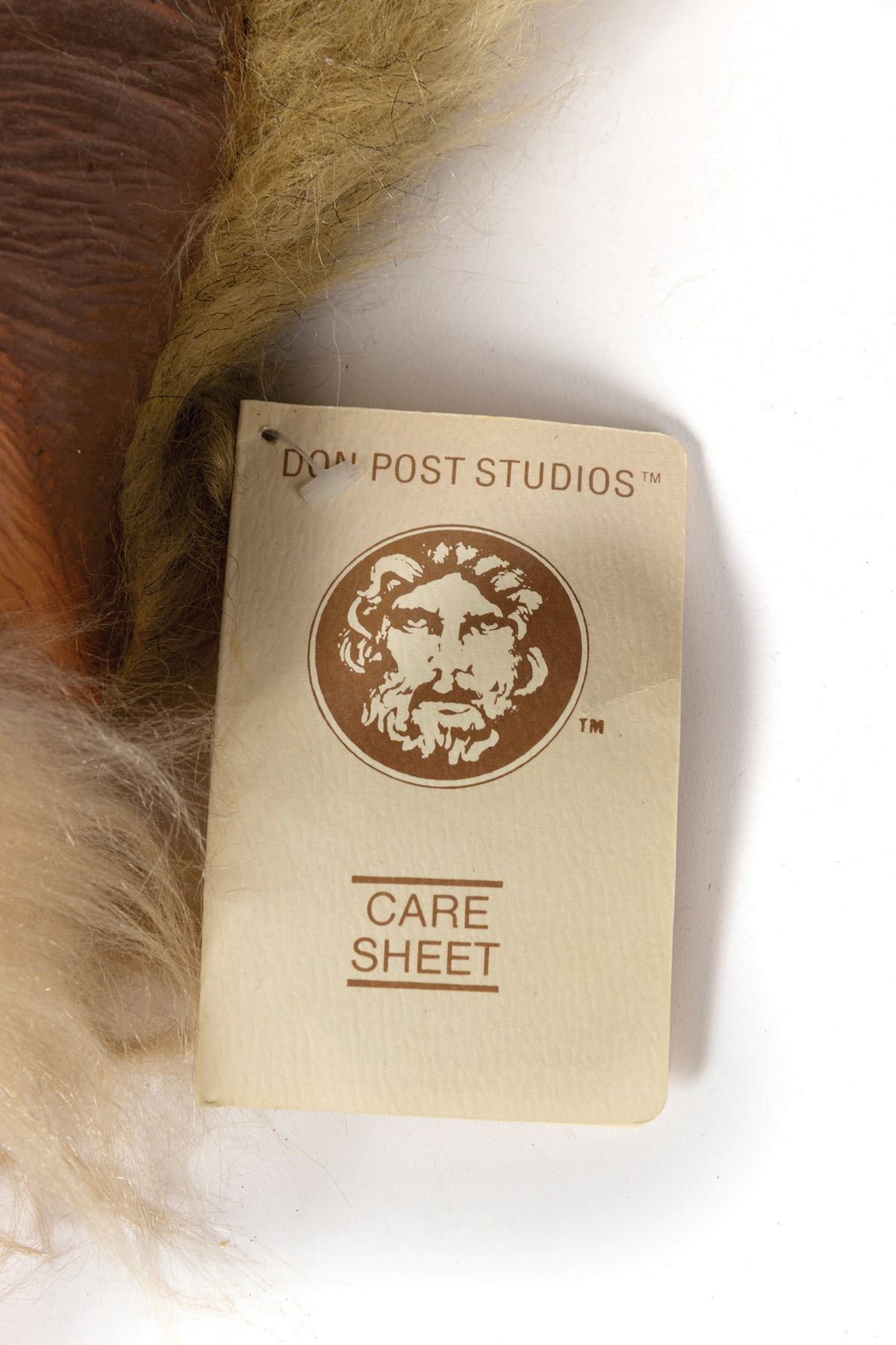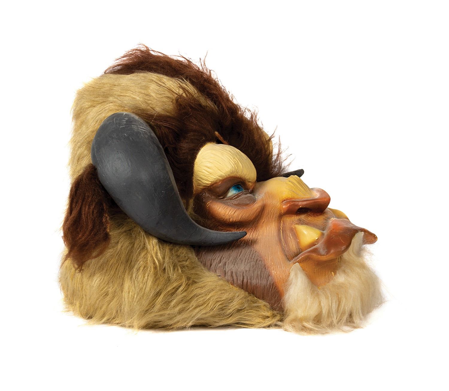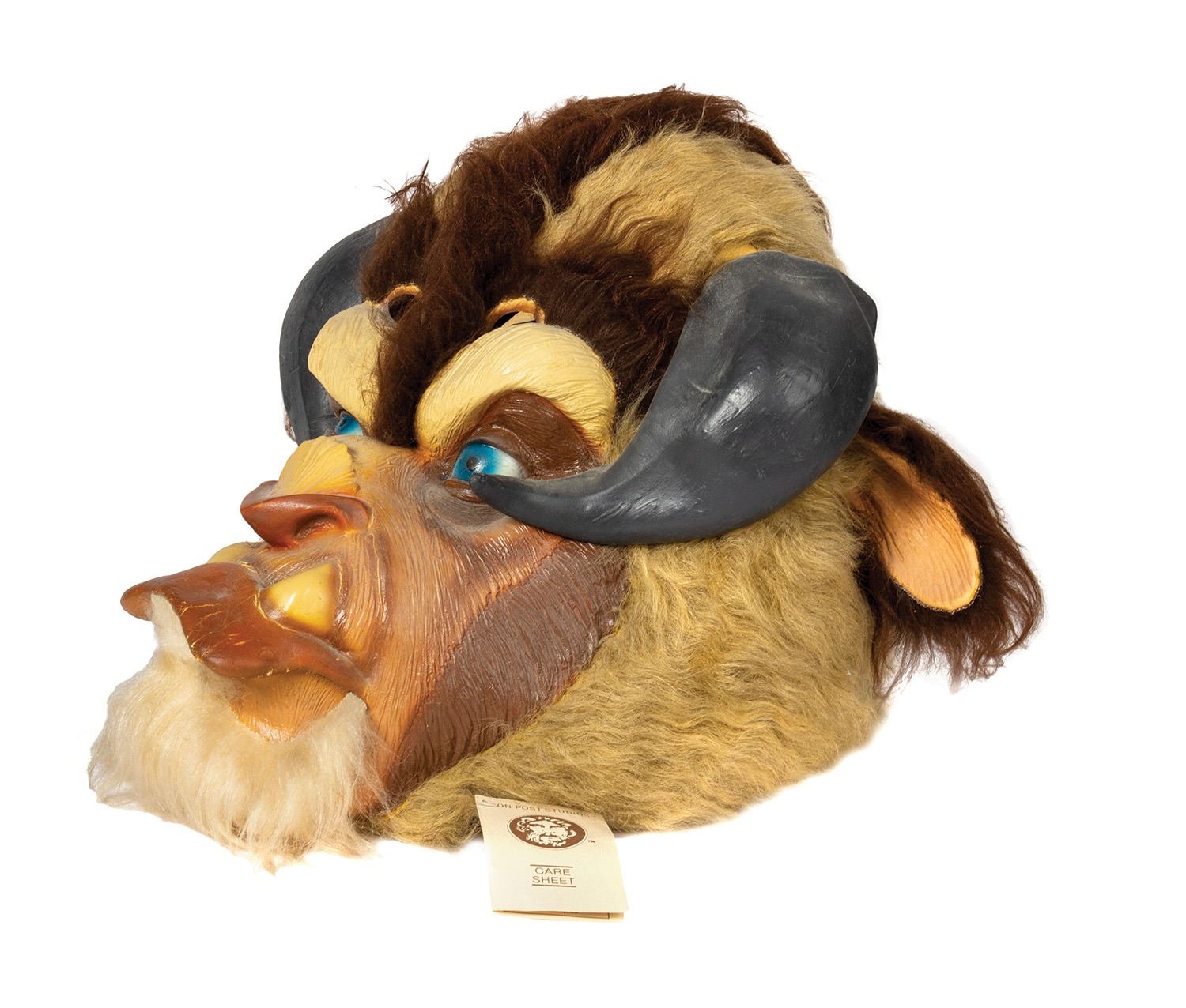 (Don Post, 1992) A rare souvenir mask created by Don Post Studios following the release of Beauty and the Beast. The mask is created from latex rubber and still retains its original Don Post tag with care instructions for the mask. Measuring approximately 19" in diameter and 14" tall, the mask is in good overall condition with some surface wear to the latex from age.
