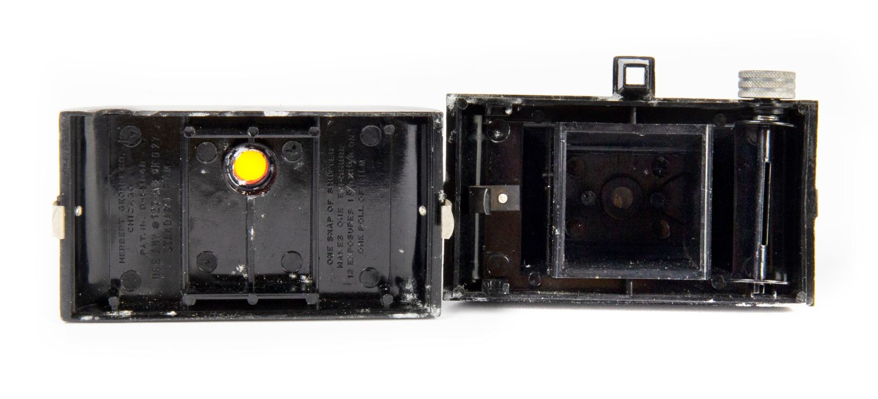 (Herbert George Co, 1940s) A vintage Donald Duck camera created by Herbert George Company. The hard bakelite camera body features molded imagery of Donald and his nephews on the back side below the viewfinder. The camera was capable of capturing 12 exposures using a simple leaf shutter. Measuring 3"x4.5" and 2.75" deep, the camera is in fair to good condition with some small spots of white discoloration to the reverse of the camera. Full functionality has not been tested but the shutter and side clasps function well.