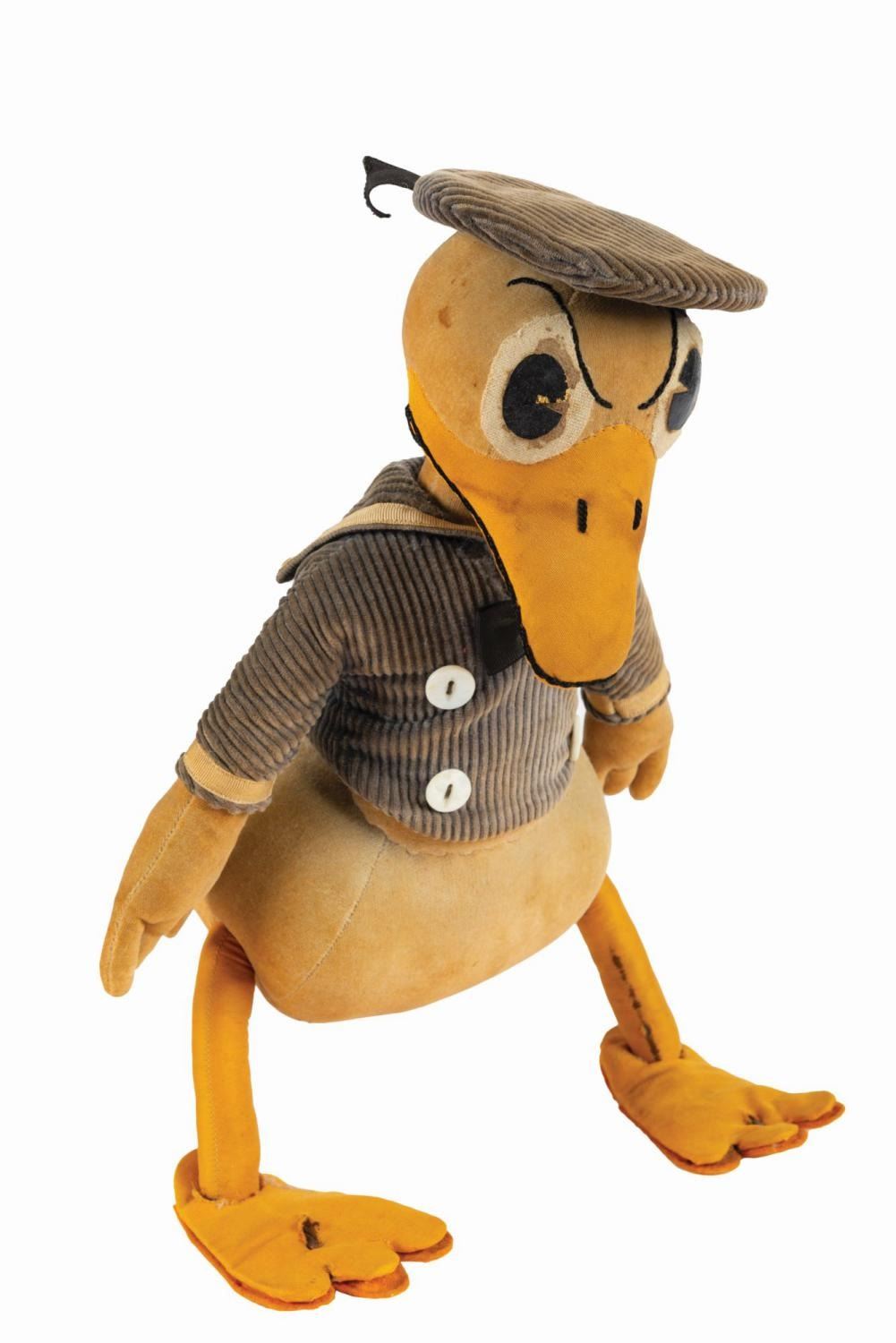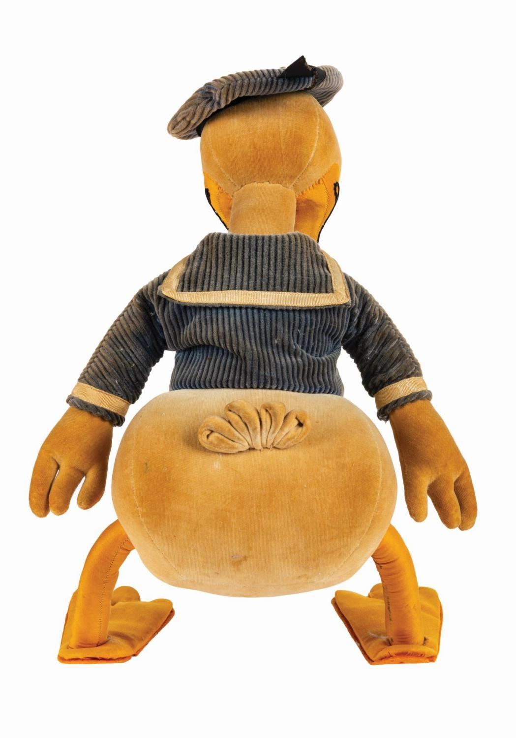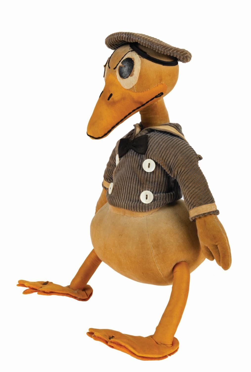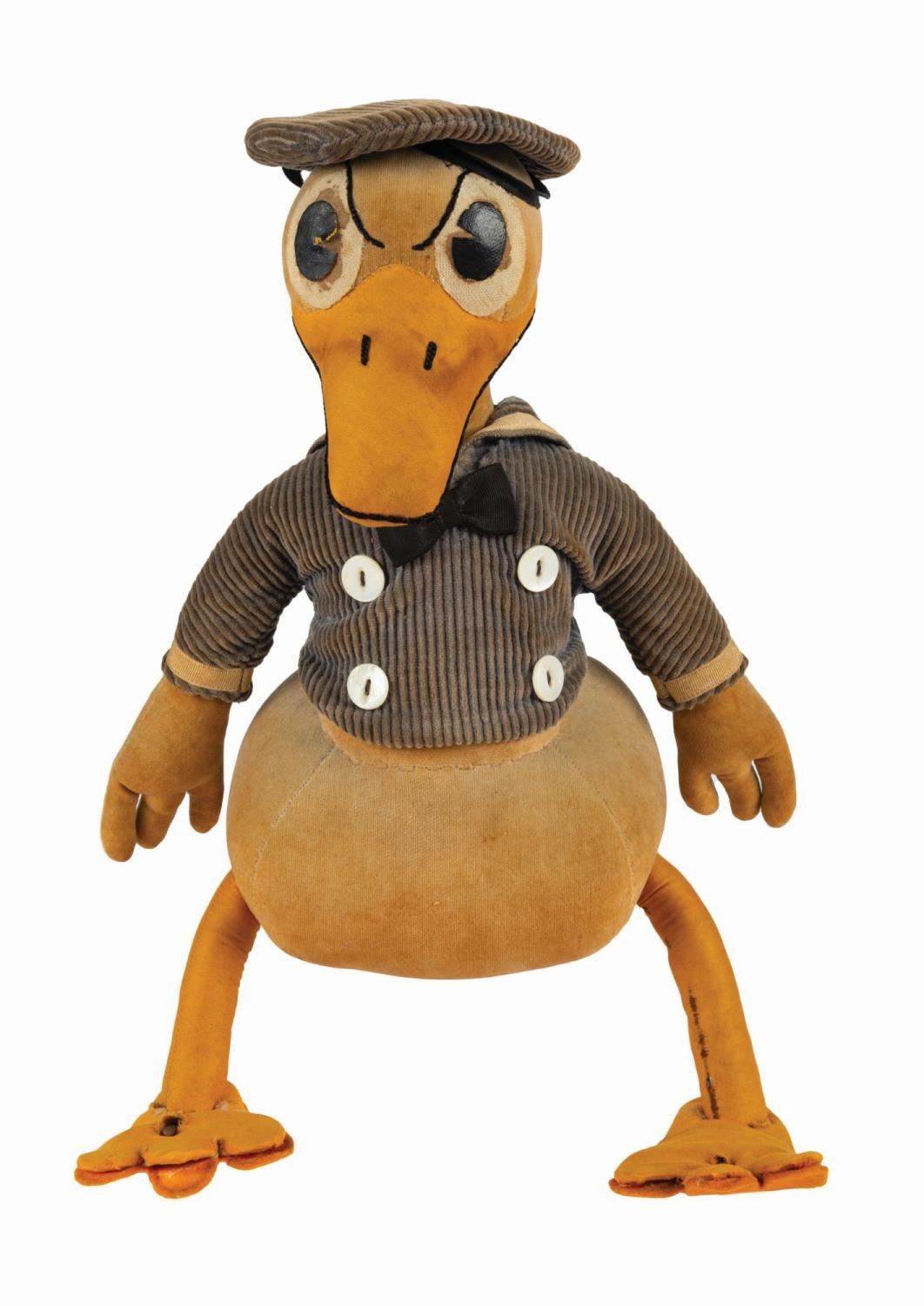 (Charlotte Clark, c.1940s) An early long-billed Donald Duck doll manufactured by Charlotte Clark. In the late 1920s, Clark saw the growing popularity of Mickey Mouse and realized the potential for Disney-themed dolls. Her creations were of such high quality, that after a short meeting, Walt and Roy Disney immediately hired her to produce official Disney licensed merchandise. Today, original Charlotte Clark dolls are some of the most desirable vintage Disney collectibles. The doll consists of a velveteen stuffed body and tail feathers, corduroy sailor hat and tunic with mother of pearl buttons, cloth beak and legs with felt foot pads, and oil cloth pie eyes. Donald wears his typical aggrieved expression, rendered in fine stitched detailing about the beak and eyebrows. Standing 13.75", the doll is in good condition. The metal wire armature in the legs has breached the top of the feet, there are holes in the foot pads, the hat is detached from the head, the velveteen fabric exhibits an even brown toning over all with a few spots of darker discoloration, the eyes exhibit surface loss and wear, the legs show some wear to the fabric, and the blue corduroy has faded over time.