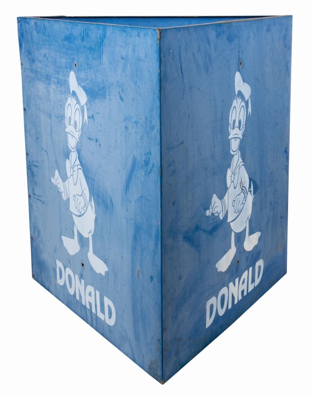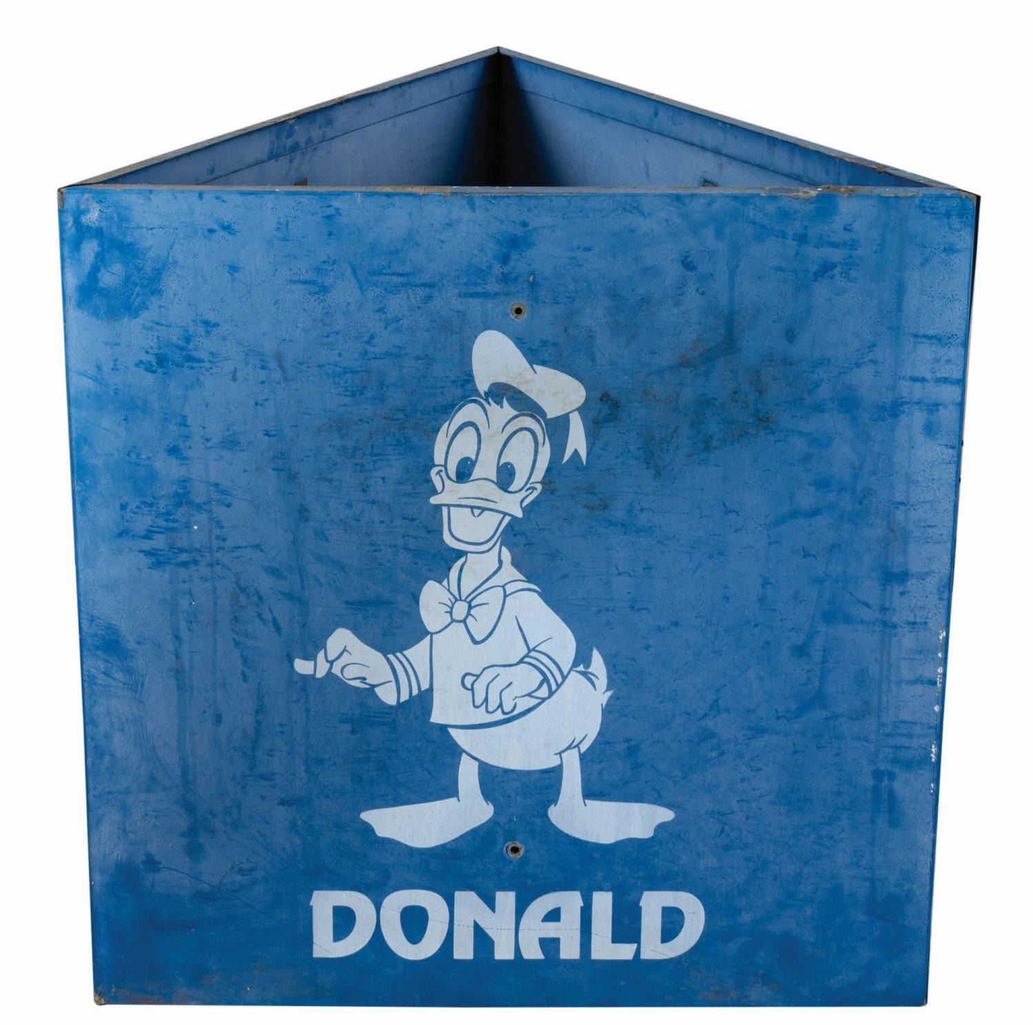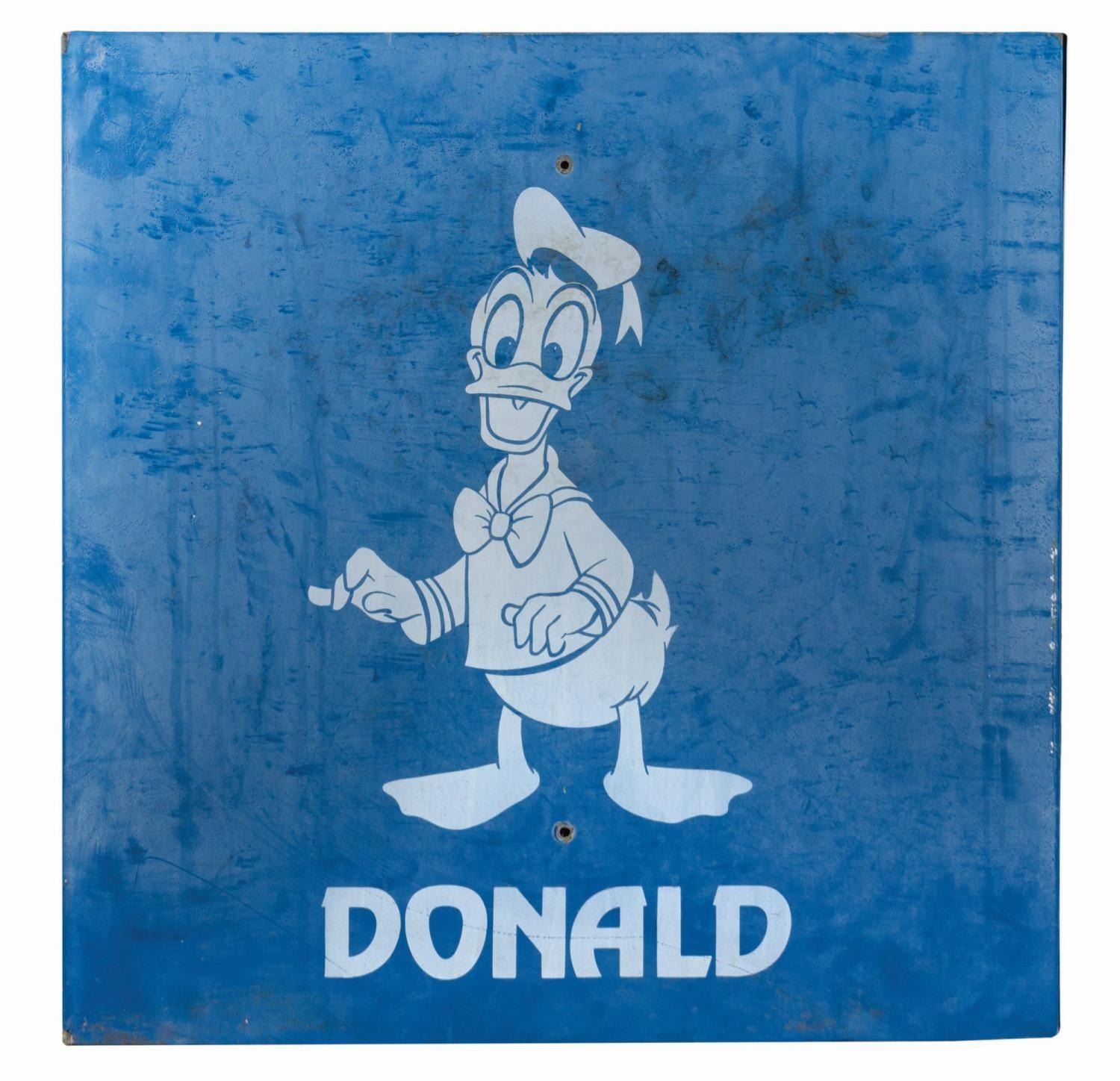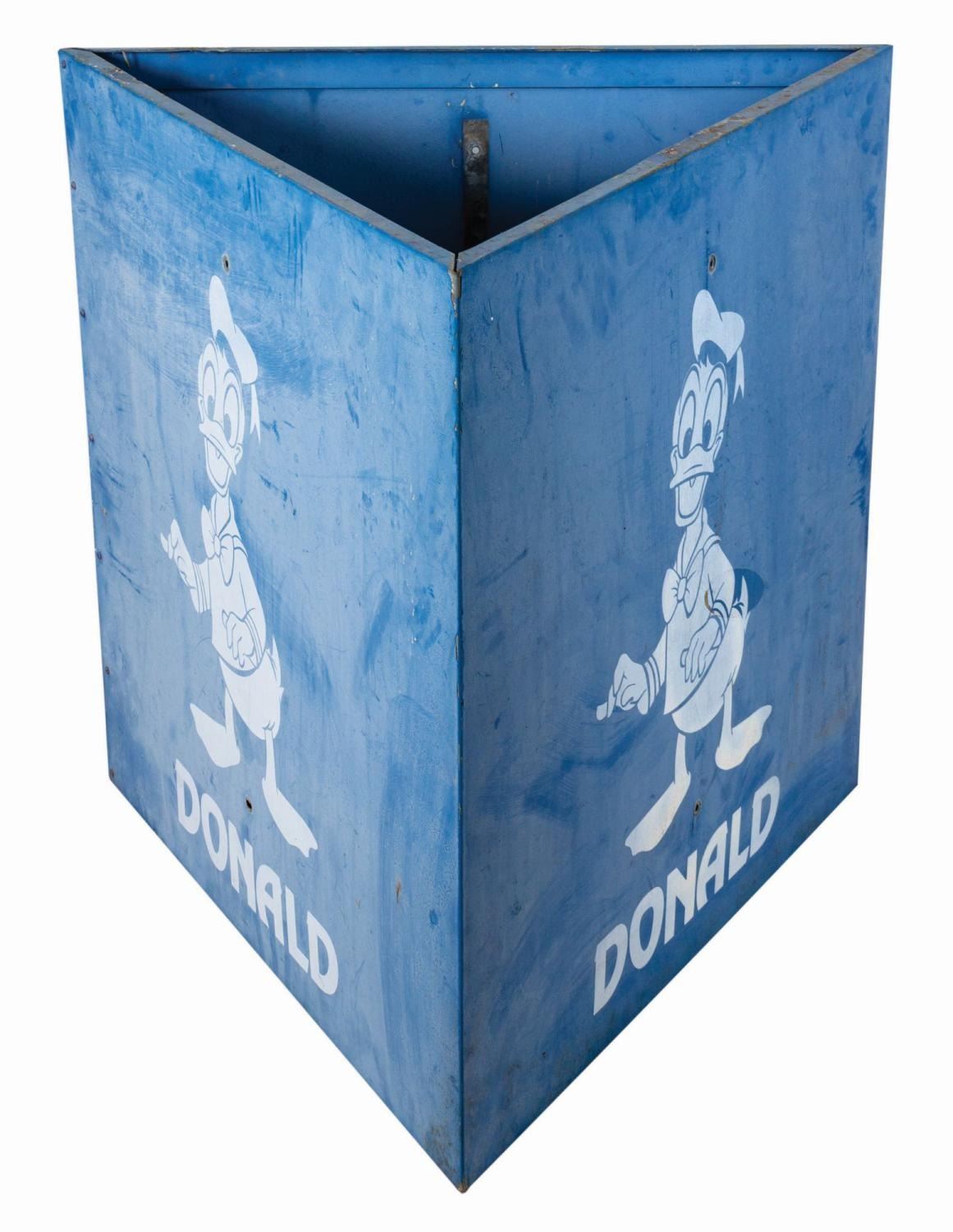(Disneyland, 1990s) A large triangular metal parking lot sign from Disneyland. Each 30"x30" side features the name and depiction of Donald Duck. The condition is good with various dings and wear throughout from its park-use and removal. This item may require special shipping arrangements, please inquire for details and estimates.
