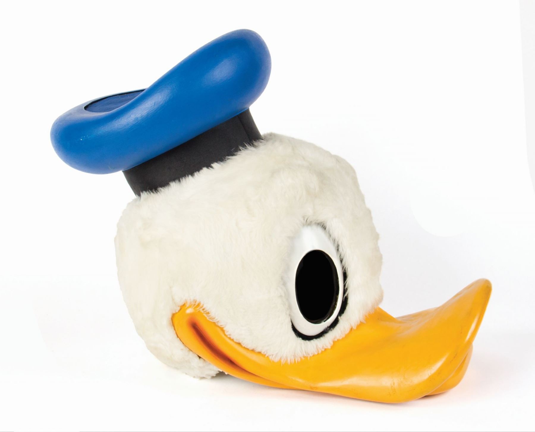 (Disneyland, c.1970s) A costume head for Disneyland's Donald Duck walk-around character. This incredibly rare wardrobe piece has its original Disneyland wardrobe label inside with the note "Donald Duck" written on the label in felt pen. The head still retains its helmet-like apparatus inside, and measures approximately 19" tall. The character head is in very good condition overall with some expected wear from use and age, including a few small spots which appear to have been repaired during the head's initial use in the 1970s.