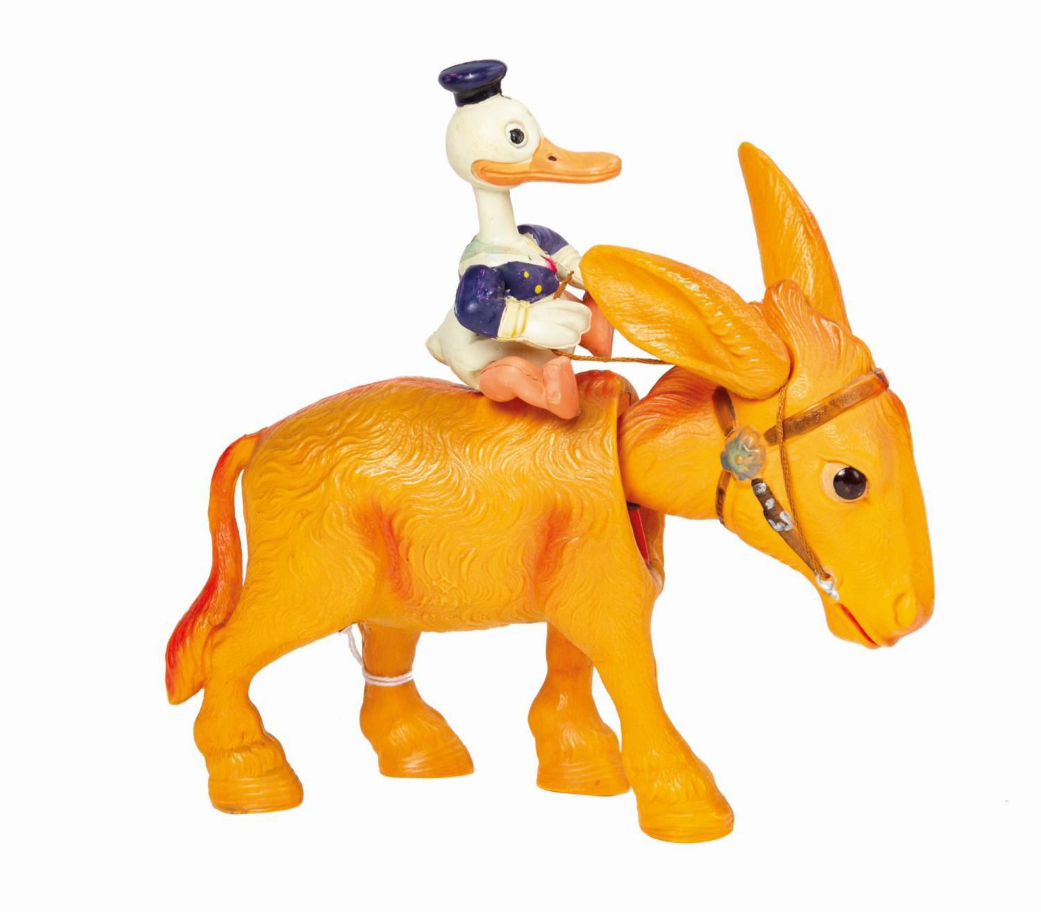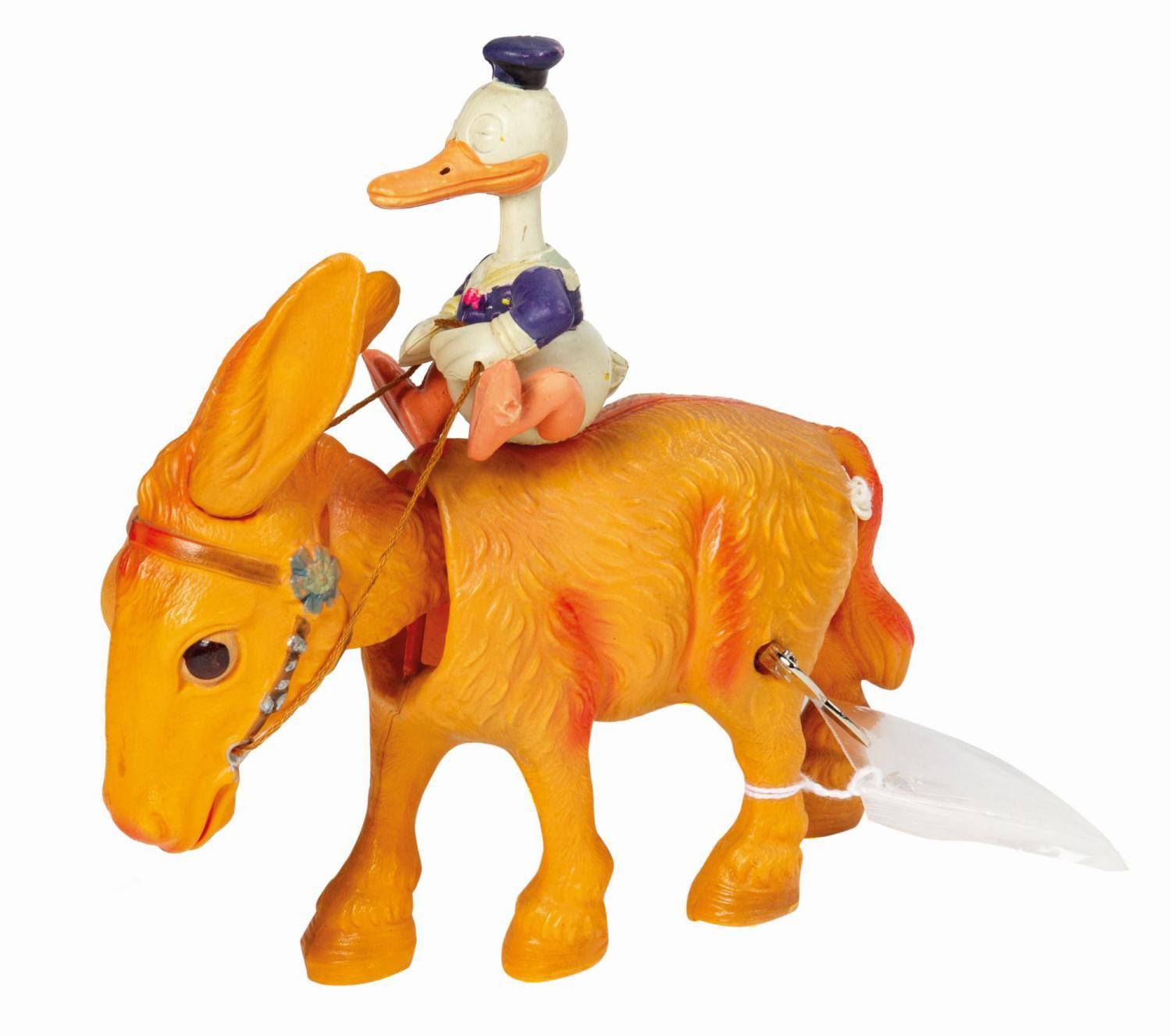 (Disney, c.1930s) An extremely rare Donald Duck riding a donkey wind-up toy. Donald is shown in his very early long-beak design. When the key on the donkey's right rear haunch is turned, the head moves from side to side and the body rumbles, causing Donald to bounce up and down. The mechanicals are in working order. Measuring 6.5"x6.5" and 2.5" deep, the toy is in fine condition with only minor paint chipping and wear.