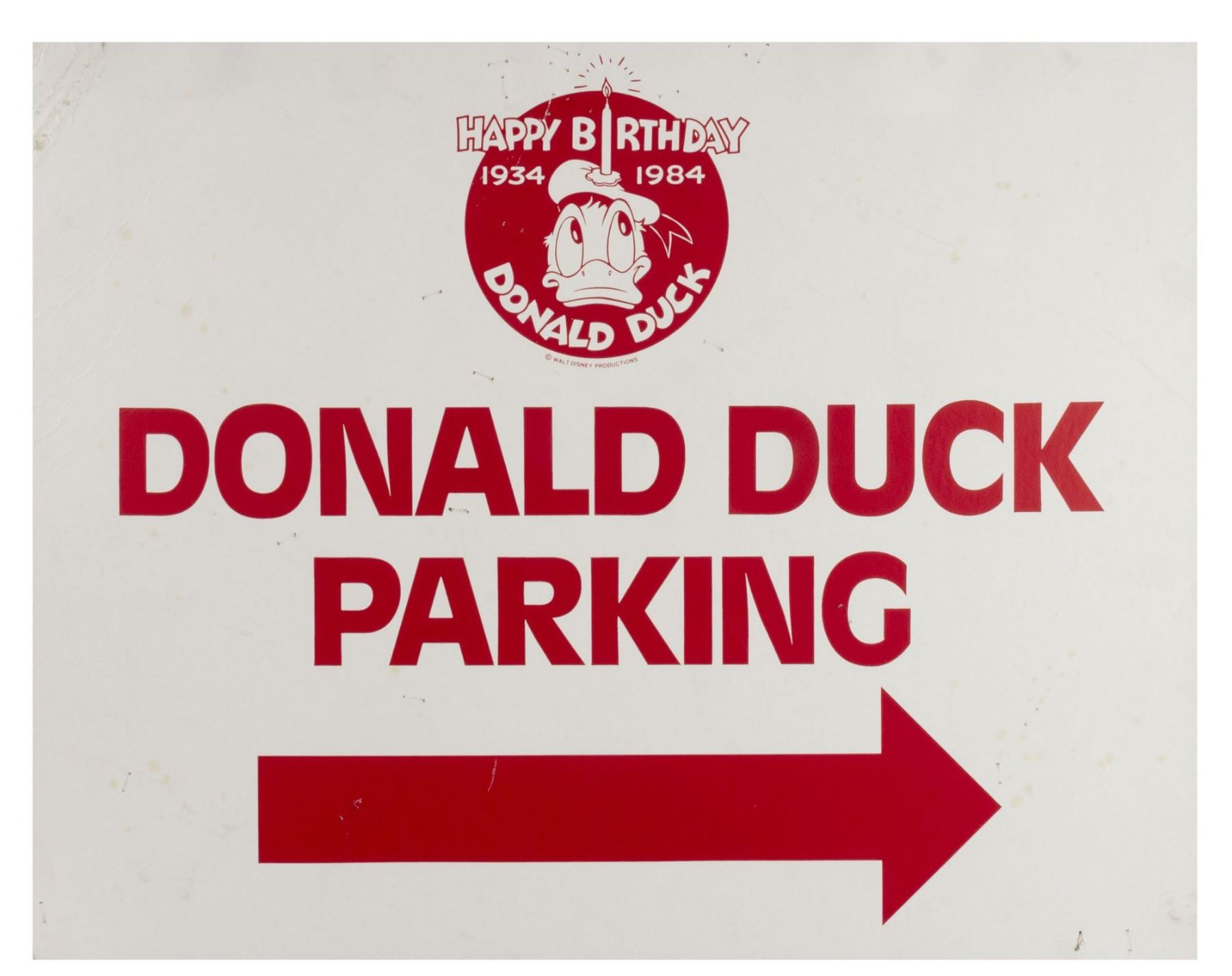 (Disneyland, 1984) A large parking sign used during Donald Duck's 50th Birthday celebrations at Disneyland. Featuring the logo for Donald's 50th at the top, the sign was used to designate the direction for the Donald Duck parking area. Screen printed on a large sheet of art board, the sign measures 22"x28" and is in good condition overall with some scattered spots of discoloration and small staple holes to the board from its original use.