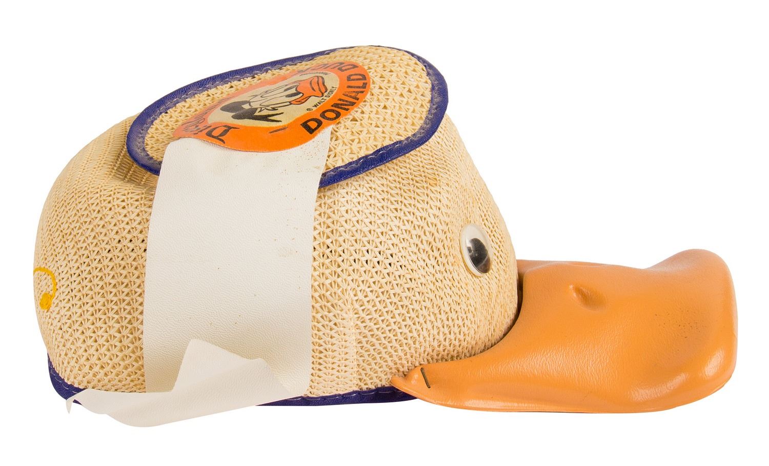 (Disneyland, 1950s-60s) An early Donald Duck child's hat with working squeaker in its bill. The original Disneyland ribbon is still adhered to the top. The hat is marked as a child's small inside and is in very good condition with minor wear.