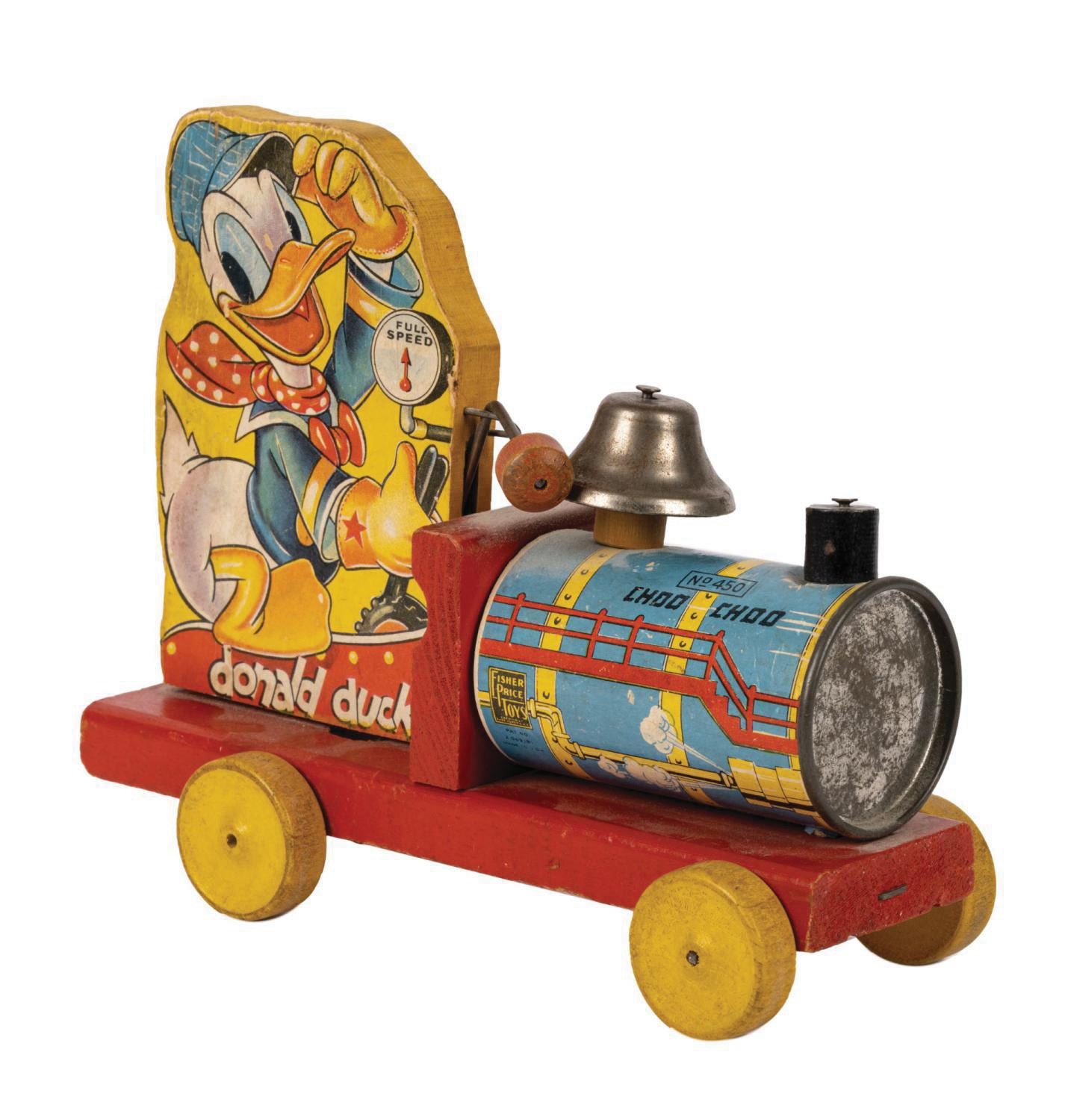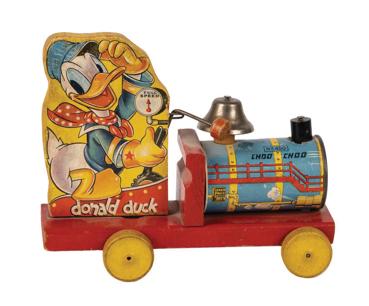 (Fisher-Price, c.1938) A vintage Donald Duck Choo Choo pull toy manufactured by Fisher-Price. Measuring 8" tall and 7" long, the pull toy displays in very good condition. The pull string is absent, and there are minor surface scuffs and wear from use, and minor oxidation to the metallic parts.