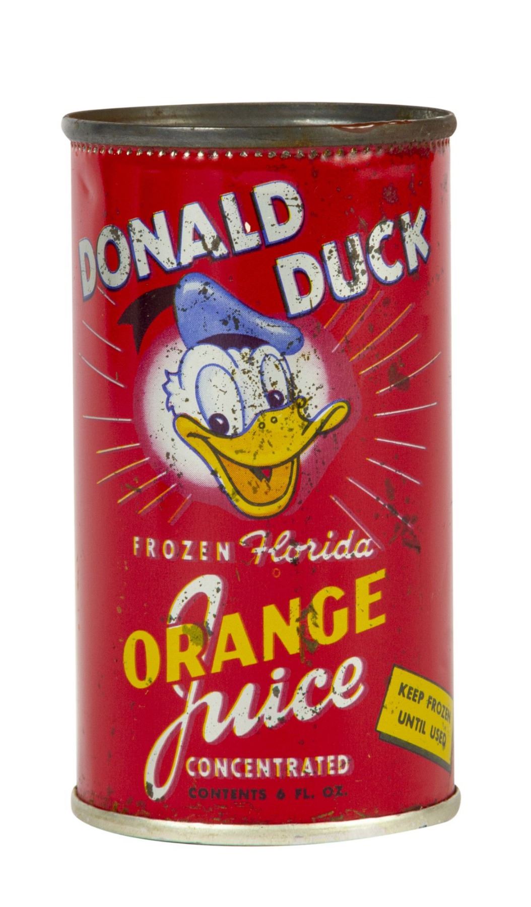 (Florida Citrus, c.1940s) A vintage Donald Duck Florida orange juice can. The open can features an image of Donald Duck on the front and instructions for serving the concentrated juice on the back. Measuring 3.75" tall and 2.25" in diameter, the can is in fair to good condition with some rust and discoloration throughout.