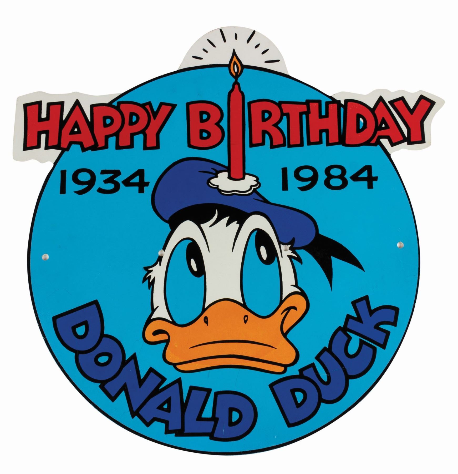 (Disneyland, 1984) A sign created for Donald Duck's 50th birthday celebration at Disneyland in 1984. This sign was displayed in Main Street during the event, and is printed on sturdy PVC board. The lamppost sign measures 17.5"x18" and is in very good condition with some surface scratches from use.