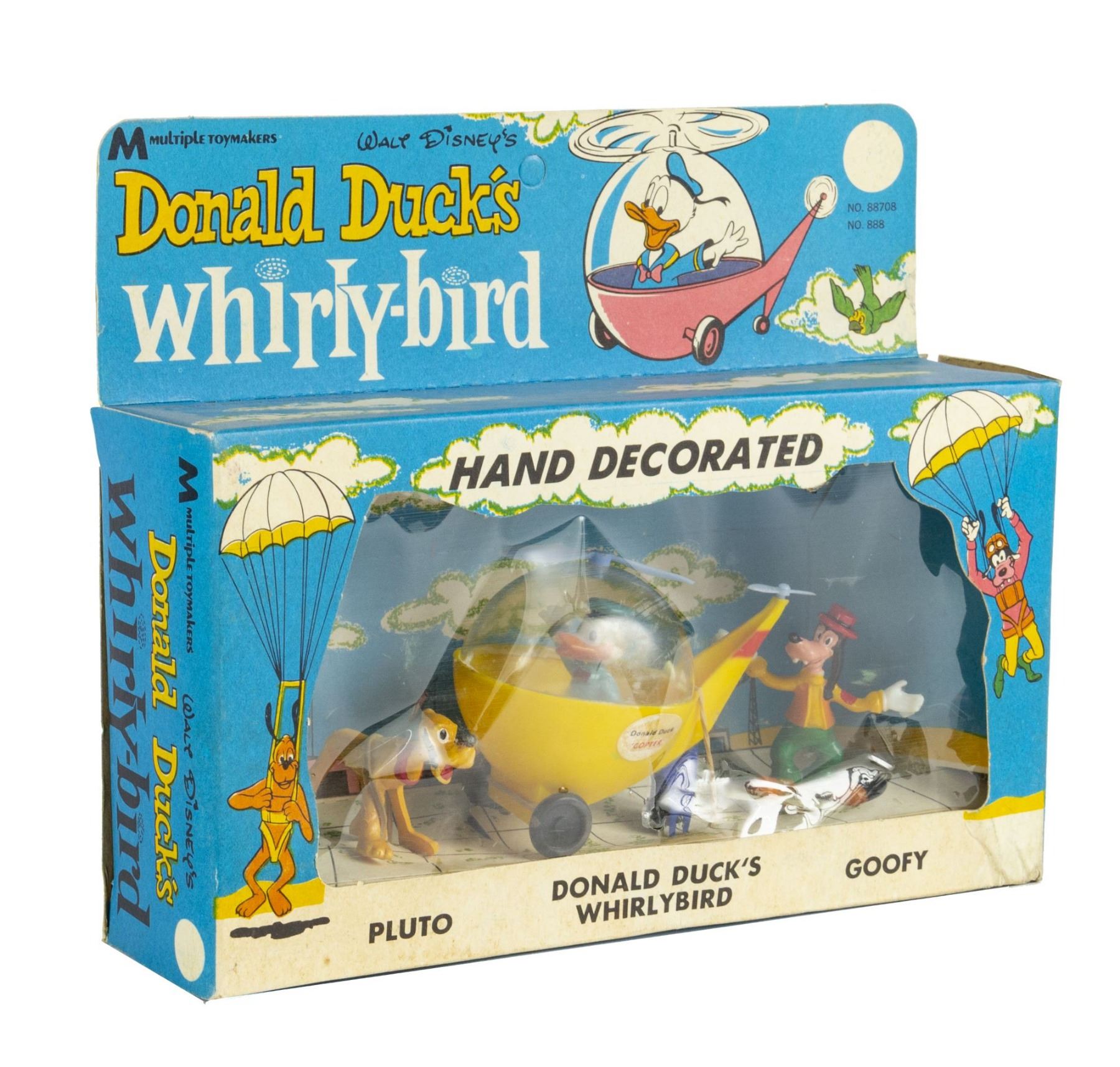 (Multiple Toymakers, 1968) A set of hand-painted Walt Disney character toys depicting Pluto, Goofy, and Donald Duck inside a helicopter. This charming figure set comes in its original box with is beautifully illustrated with additional character imagery. The box measures 7.25"x9" and 2.5" deep and the set is in very good condition with minor wear to the box.