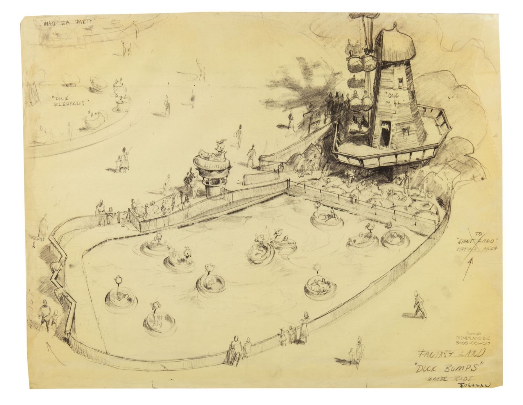 (Disneyland, c.1954) A concept brownline by Imagineer Bruce Bushman. Featuring a "Duck Bumps" water ride in Fantasyland, this concept was created for an unbuilt water attraction themed around Donald Duck, with boats featuring his likeness. The brownline measures approximately 18.5"x23.5" and is in good condition with some minor edge-wear and spots of discoloration on the reverse.