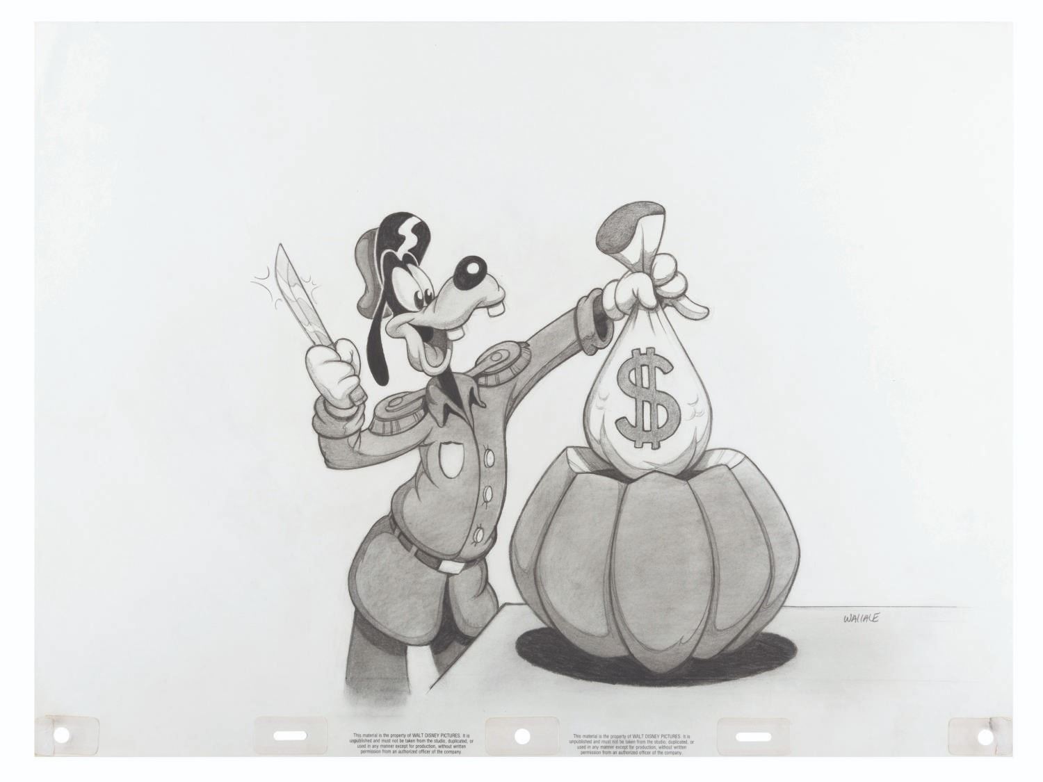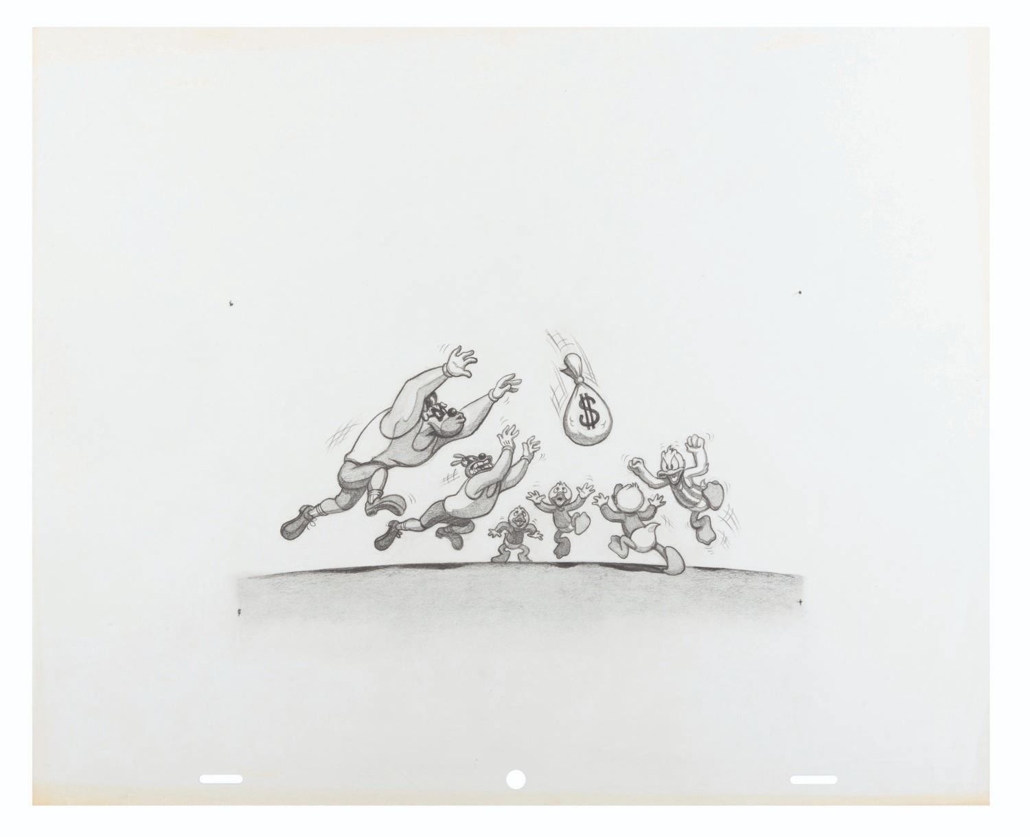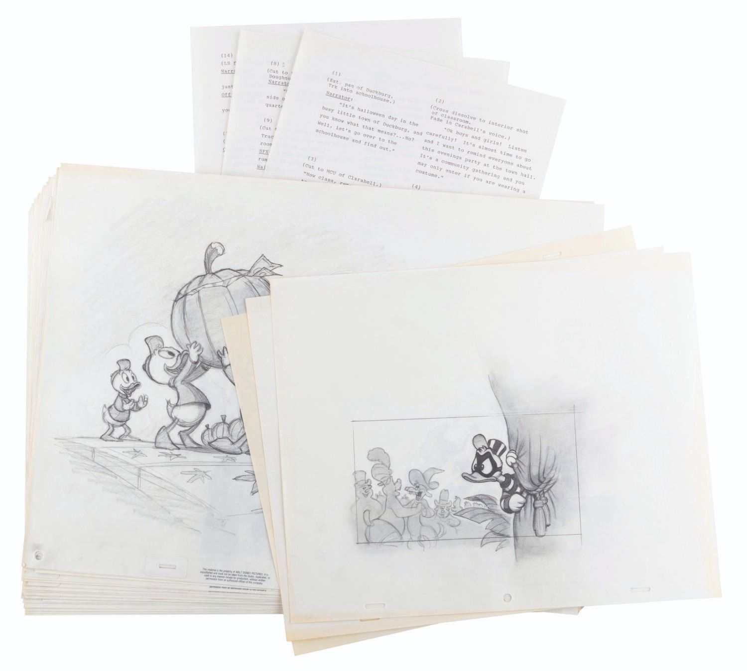 (Disney, 1990) A beautiful set of 20 illustrations and a partial script from the pitch for a "DuckTales" Halloween special. The original series ran from 1987 to 1990. This artwork is dated 1990 and, along with the three page pitch script of Act I of the show, tells the story of Huey Dewey and Louie's Halloween finding a pumpkin filled with money stashed there by the Beagle Boys. Uncle Scrooge does not appear in the story which features Donad Duck with cameos by Mickey Mouse, Goofy, and Clarabelle Cow. The artwork, established in graphite on animation paper, has stunning attention to detail and shading not usually seen in production work. Even with three pieces including paste up (copy) elements, each is a work of art in itself. With the 8.5" x 11" script and art on animation paper measuring 10" x 13" to 12.5" x 17", the set is in very good production-used condition with light handling wear and smudges, slight discoloration to some paper from age, and one piece with five staples that show heavy oxidation from age.