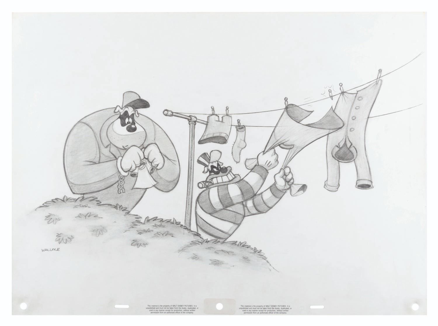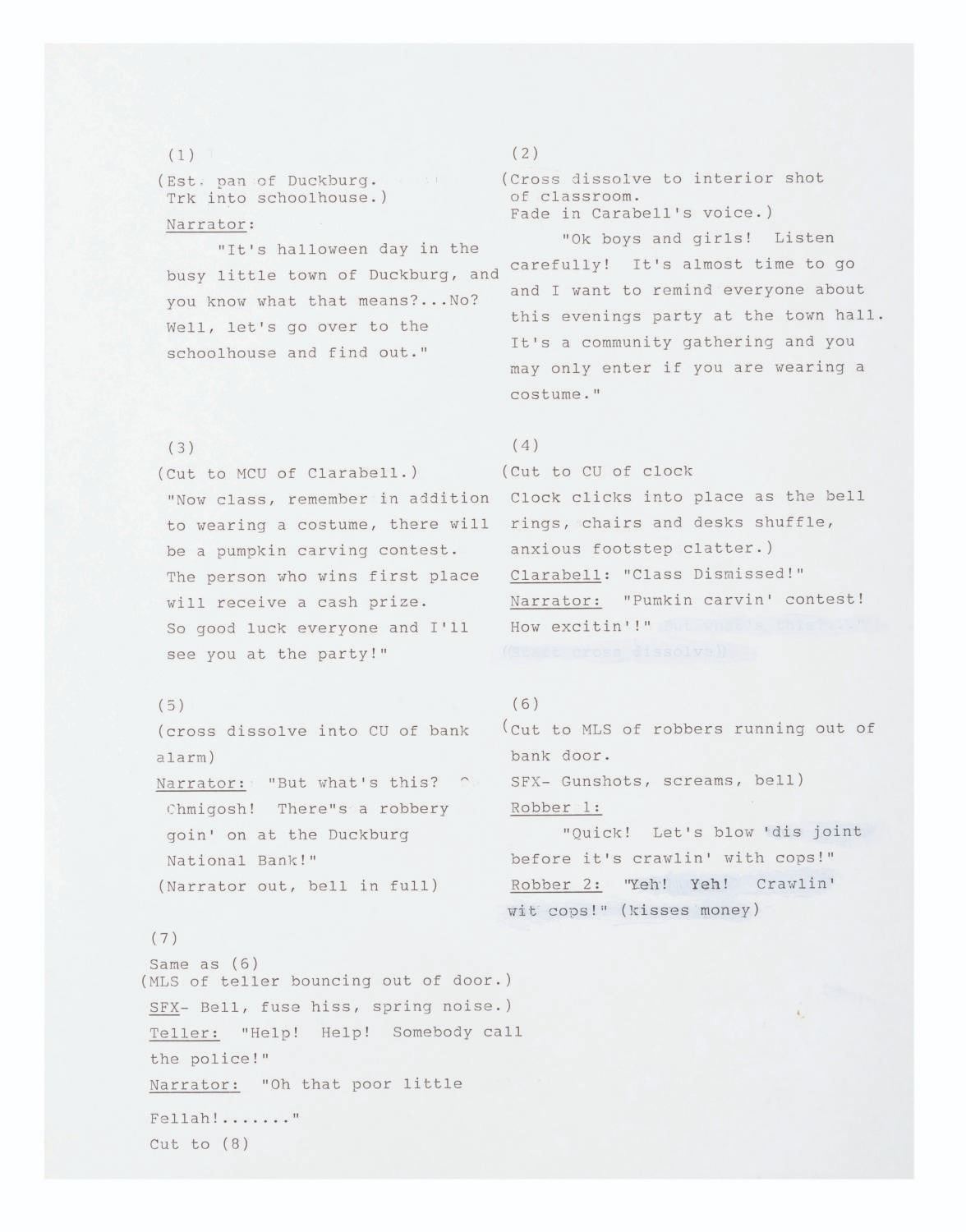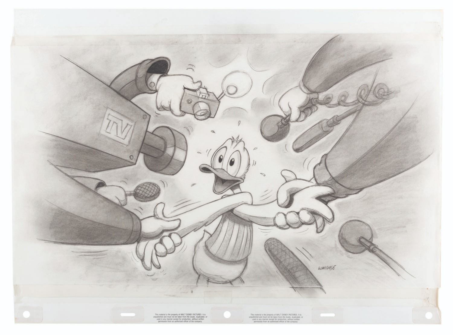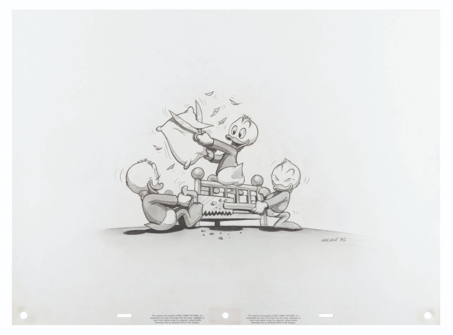 (Disney, 1990) A beautiful set of 20 illustrations and a partial script from the pitch for a "DuckTales" Halloween special. The original series ran from 1987 to 1990. This artwork is dated 1990 and, along with the three page pitch script of Act I of the show, tells the story of Huey Dewey and Louie's Halloween finding a pumpkin filled with money stashed there by the Beagle Boys. Uncle Scrooge does not appear in the story which features Donad Duck with cameos by Mickey Mouse, Goofy, and Clarabelle Cow. The artwork, established in graphite on animation paper, has stunning attention to detail and shading not usually seen in production work. Even with three pieces including paste up (copy) elements, each is a work of art in itself. With the 8.5" x 11" script and art on animation paper measuring 10" x 13" to 12.5" x 17", the set is in very good production-used condition with light handling wear and smudges, slight discoloration to some paper from age, and one piece with five staples that show heavy oxidation from age.