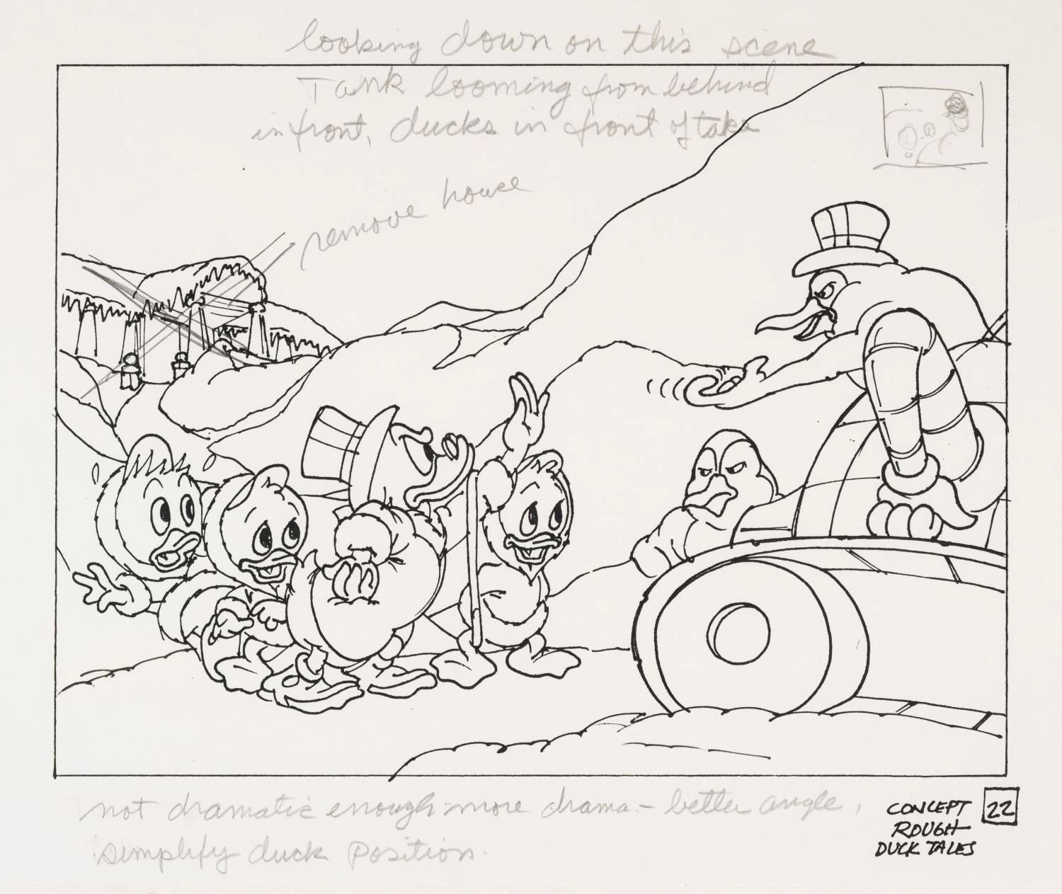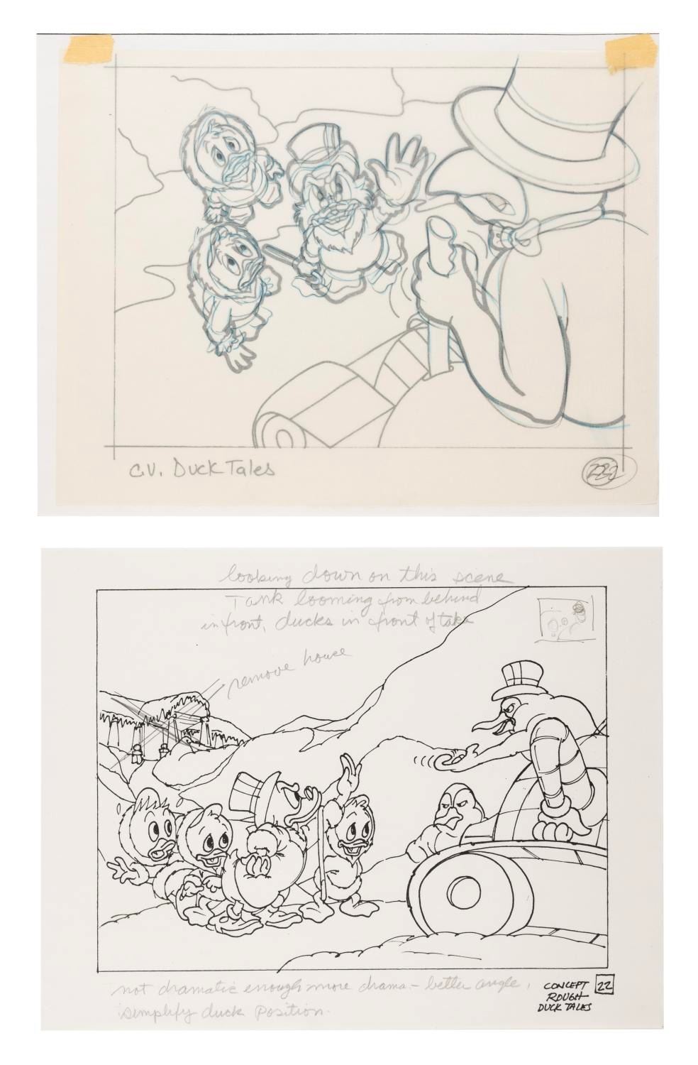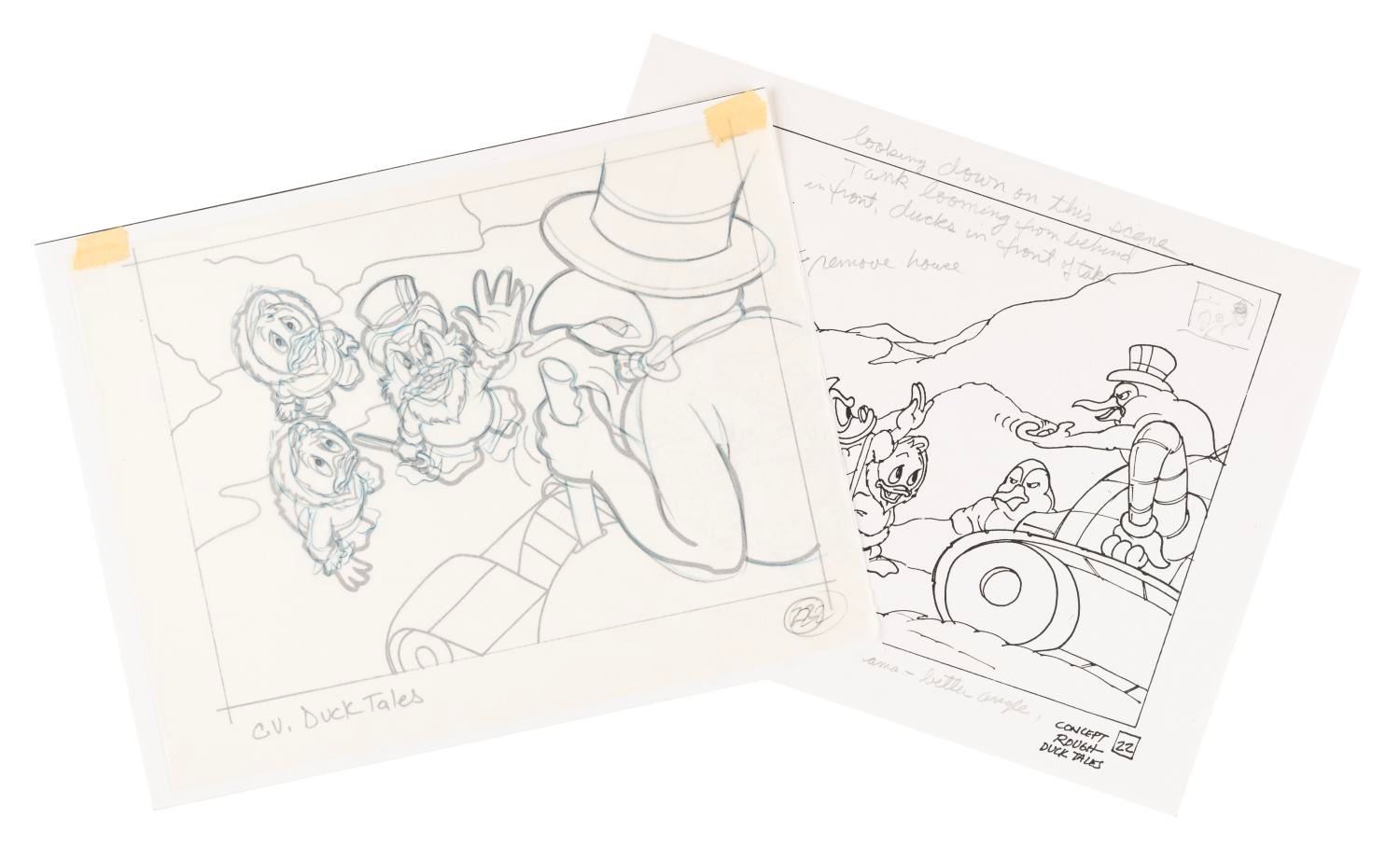 (Disney, 1987-90s) An original development drawing and a pair of photocopies for a View-Master slide of the animated series "DuckTales" (1987-1990). The graphite drawing and photocopies were created at the Disney Studio and used to create a color image on a View-Master reel. Measuring 8.5" x 11" overall, with the correction layer measuring 8" x 10.5", and the character image measuring 6.5" x 8.25", the development artwork is in very good condition with minor fading, discoloration, page bending, edge and corner wear.