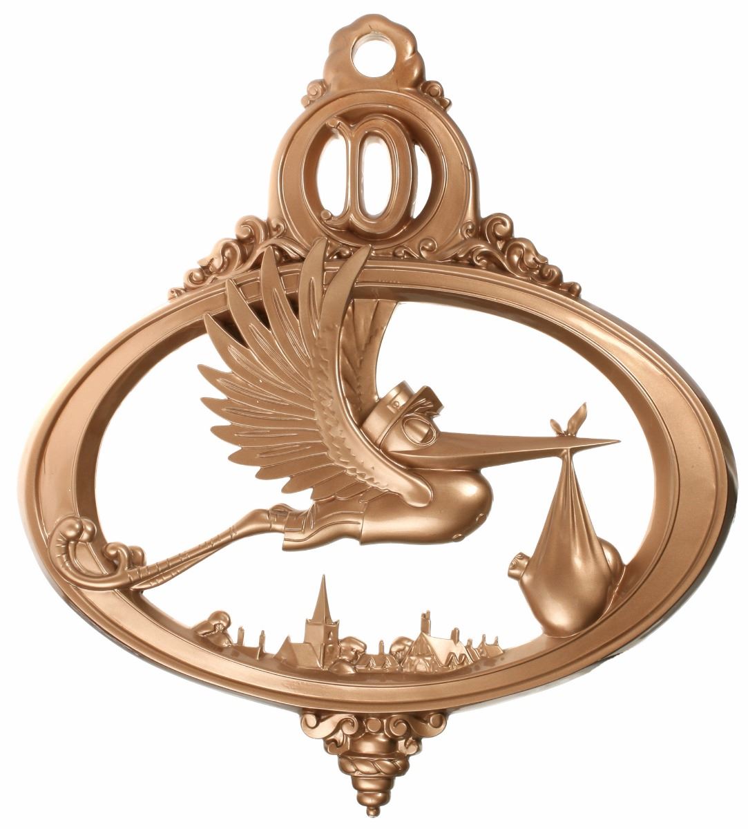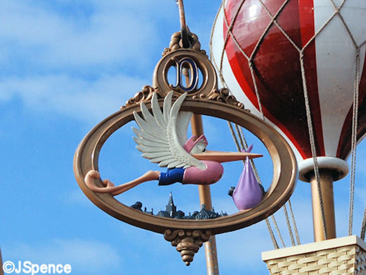 (Disneyland, 1983) Beautiful gold stork "ornament" prop that hung from the center of the "Dumbo The Flying Elephant" attraction in Fantasyland. The heavy fiberglass "ornament" features a stork delivering a baby with the skyline of a town below. These ornaments were added to the ride as part of the "New Fantasyland" in 1983. Shortly after, they were replaced with similar painted ornaments, which still hang on the ride today. Measures 33.5"x29" and 1.5" thick. In fine condition.