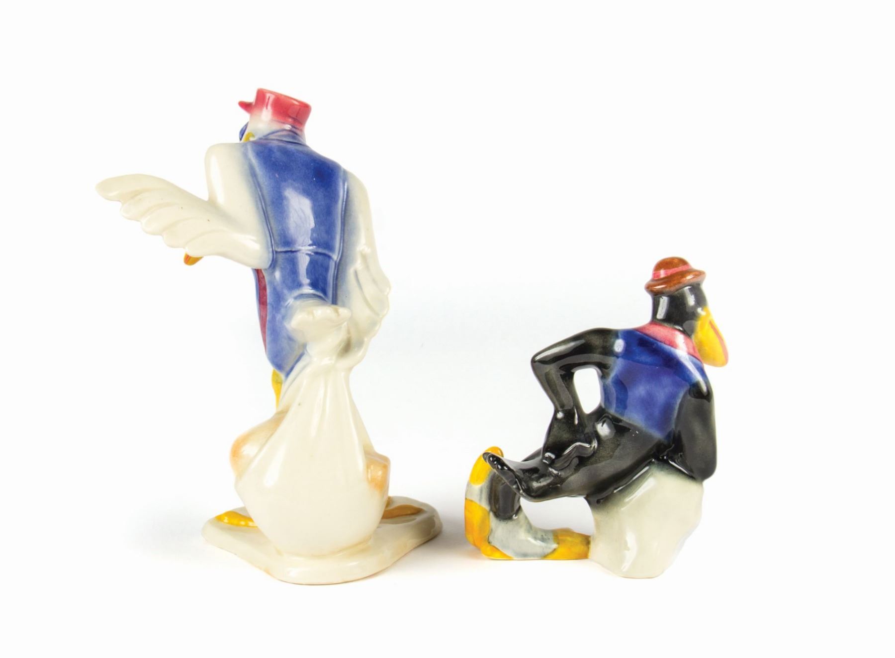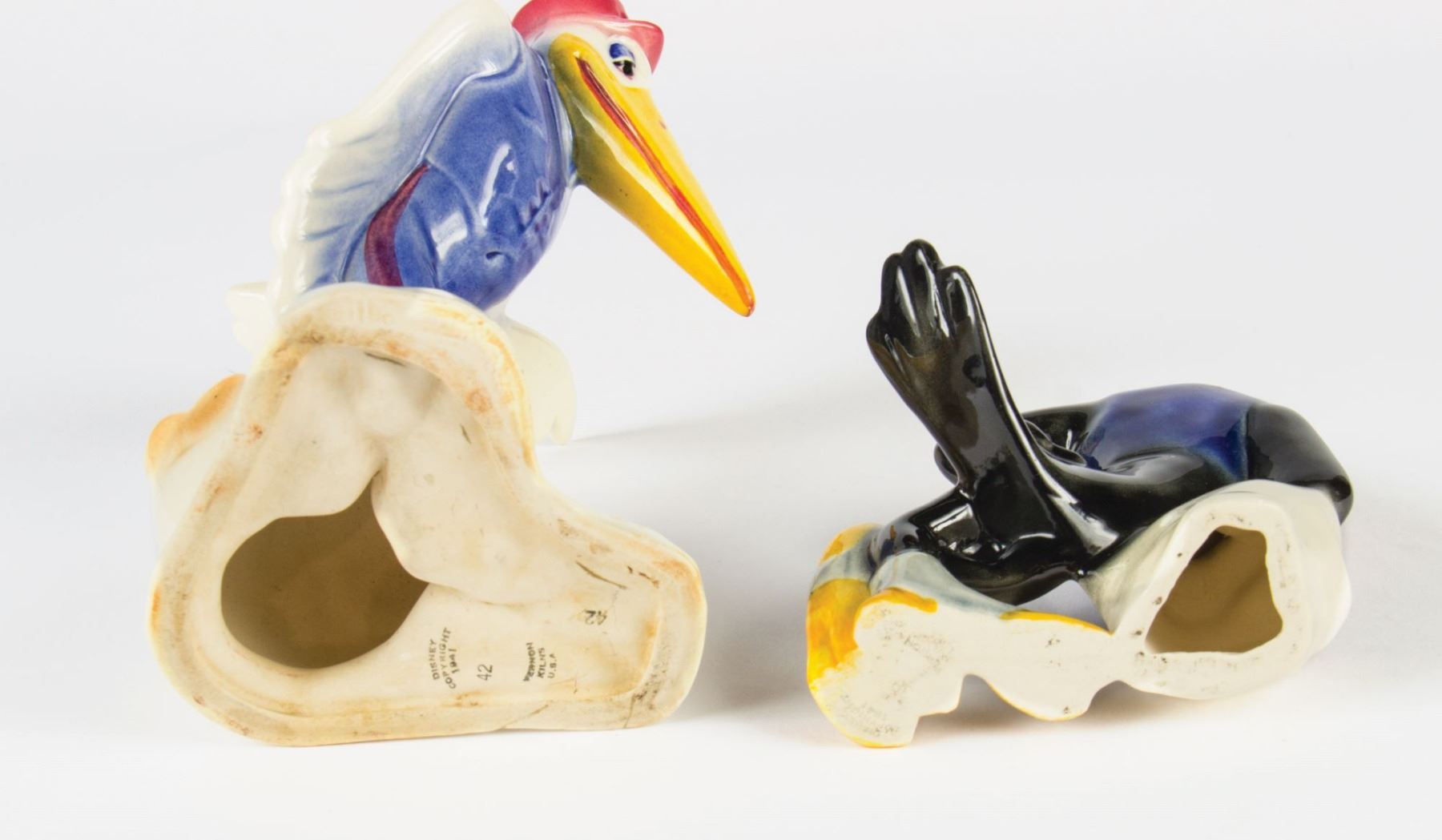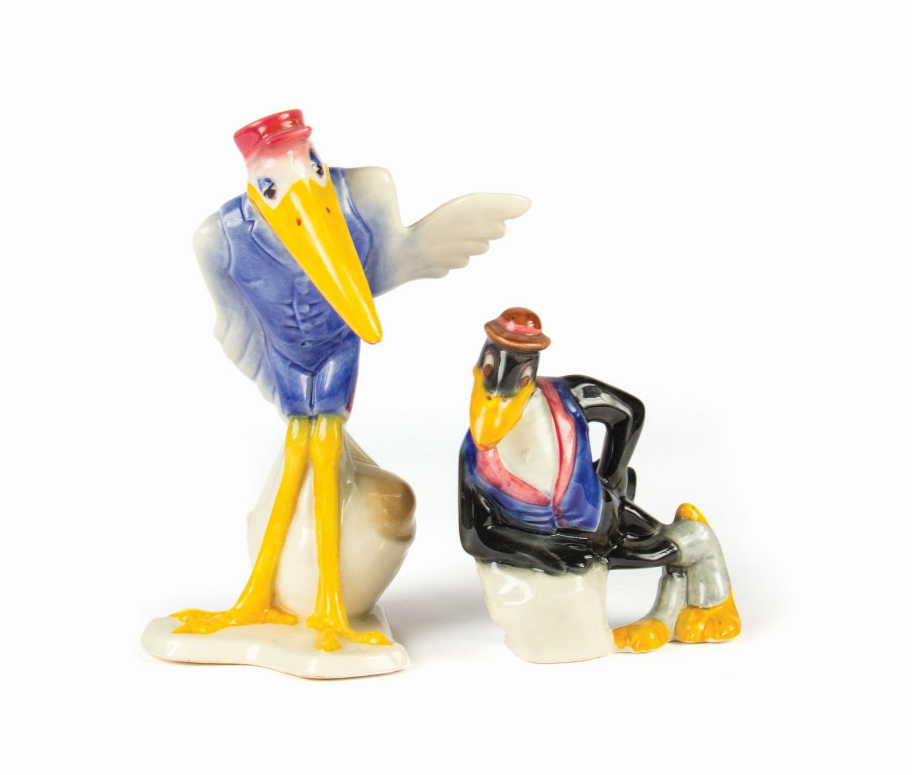 (Vernon Kilns, 1941) A pair of extremely rare ceramic figures created by Vernon Kilns and based on Disney's "Dumbo". The figures include the Stork and Crow, and measure 8.75" and 5.75" respectively. The pair of figures is in very good condition with little wear.