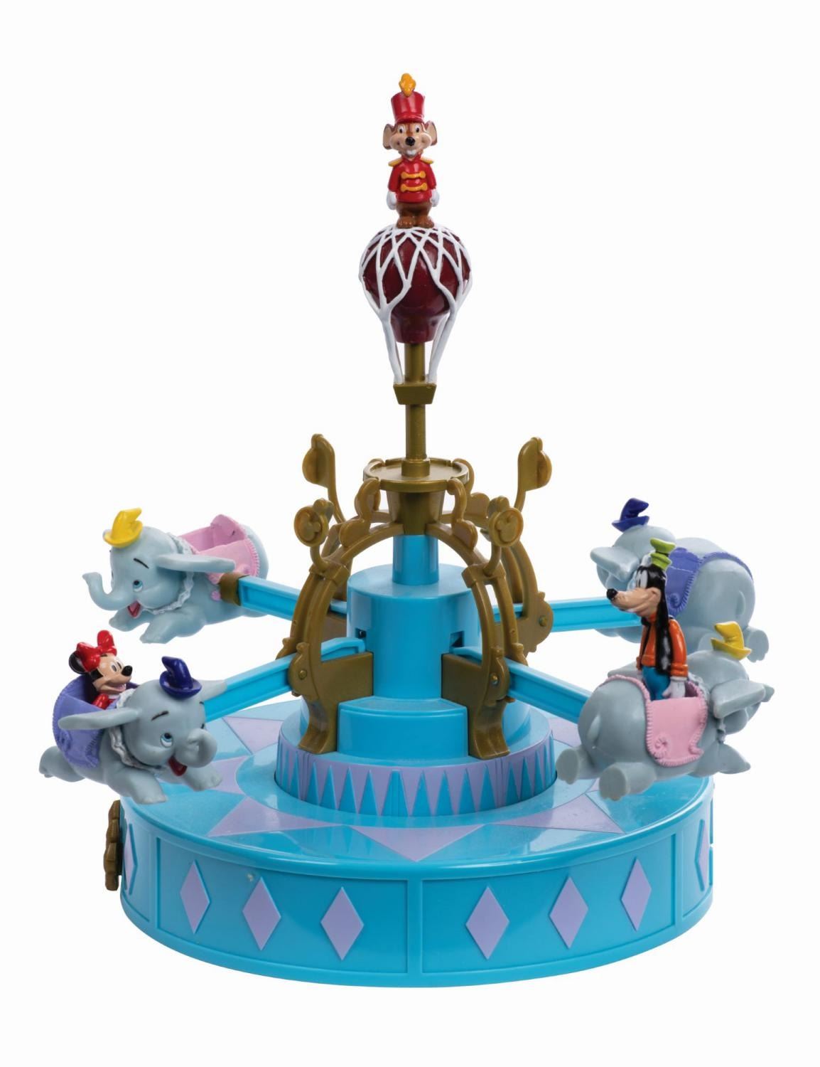 (Disneyland, 2001) Disney Theme Park Edition Dumbo the Flying Elephant Interactive Playset. The good condition action toy playset comes loose but complete with original Minnie and Goofy figures and control switch, all packaged in its original box. Requires (2) AA batteries, not included. Measuring 10.5"x11"x8.5", the box is in good used condition, with detached but included figural clamshell, and retains the original price sticker.