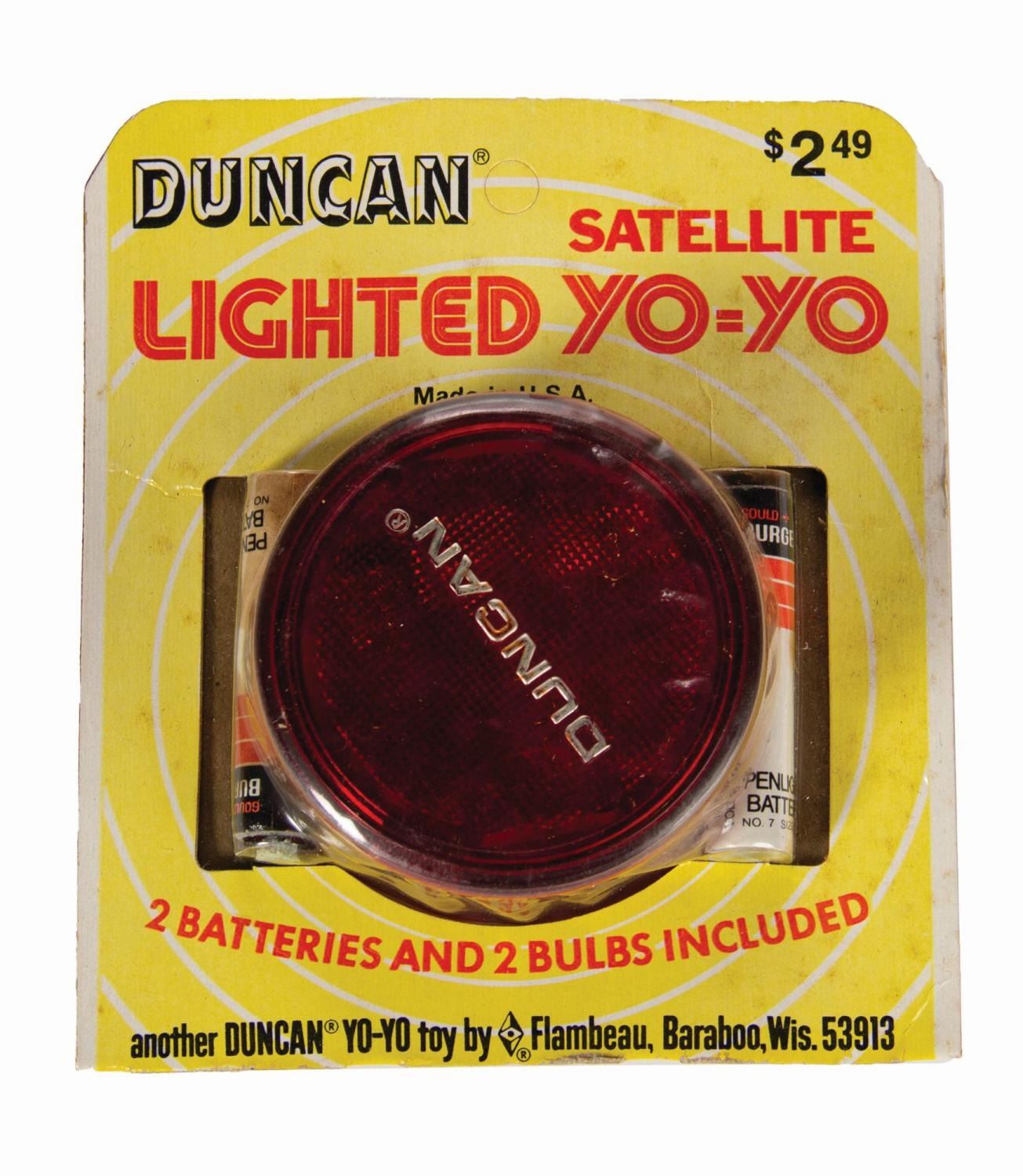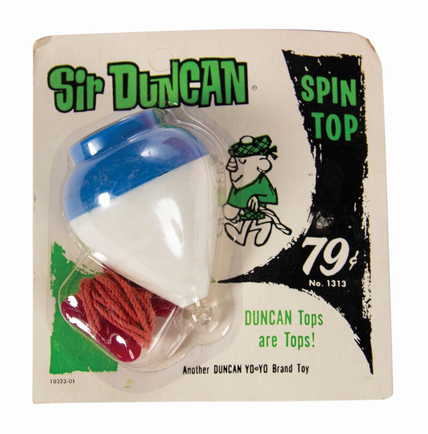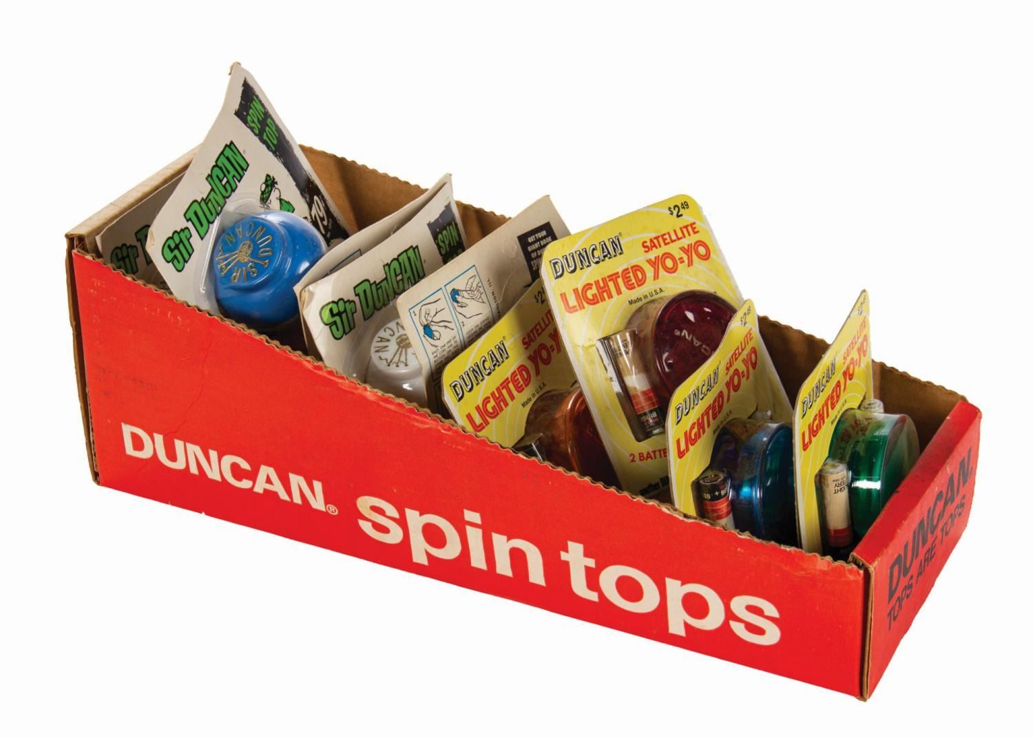 (Duncan, c.1960s-70s) A store display of (4) lighted yo-yos and (6) spin tops, all manufactured by Duncan. All the toys are still attached to their original cardboard backings with plastic coverings. The batteries which come with the yo-yos all show signs of corrosion from age. The yo-yo packages measure 4.5"x4" and the spin tops measure 5"x5", and all are contained in the 14.5"x6" and 5" tall cardboard display box. The condition is good, with some edge-wear, as well as some bending and warping to the cardboard from age.