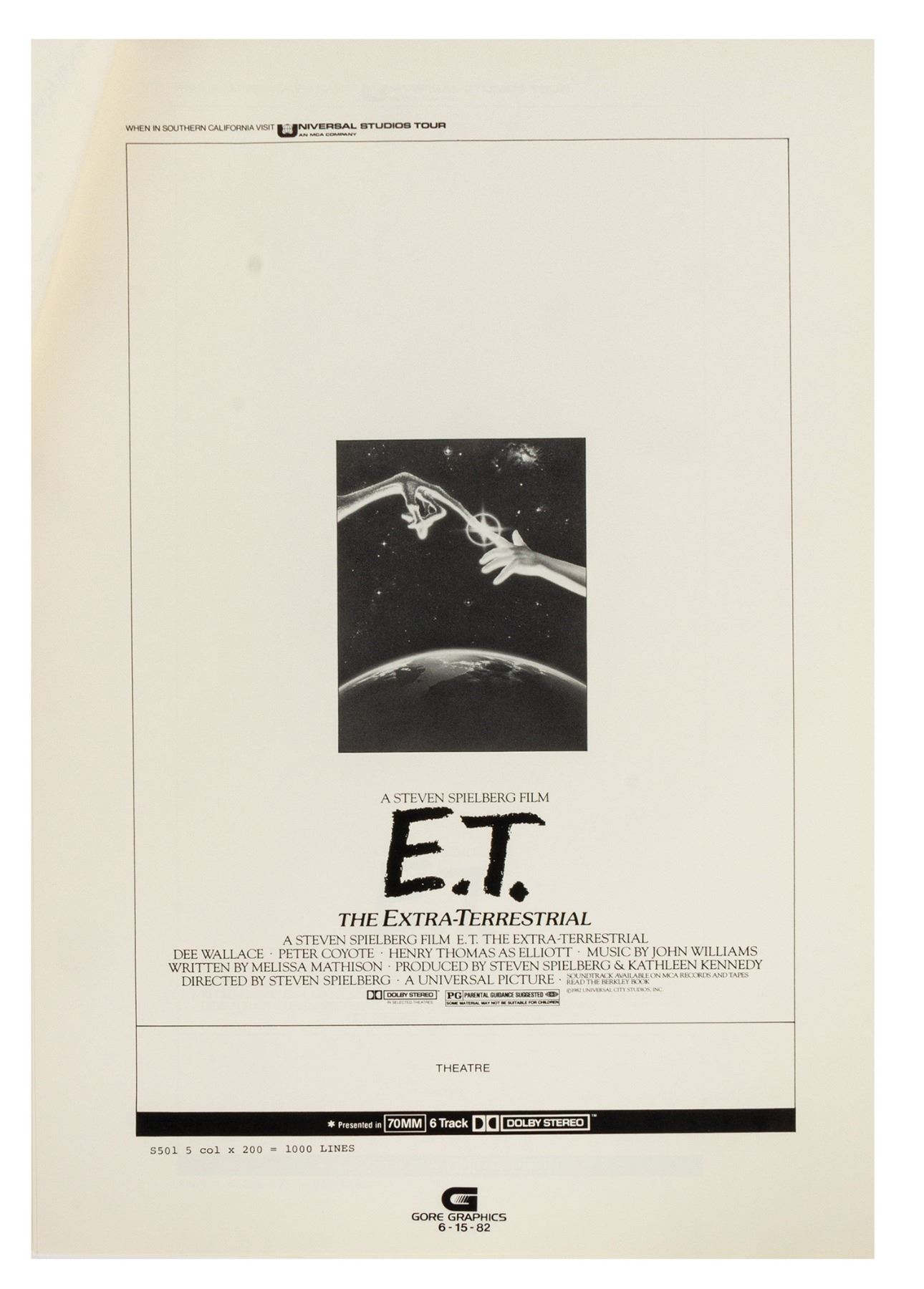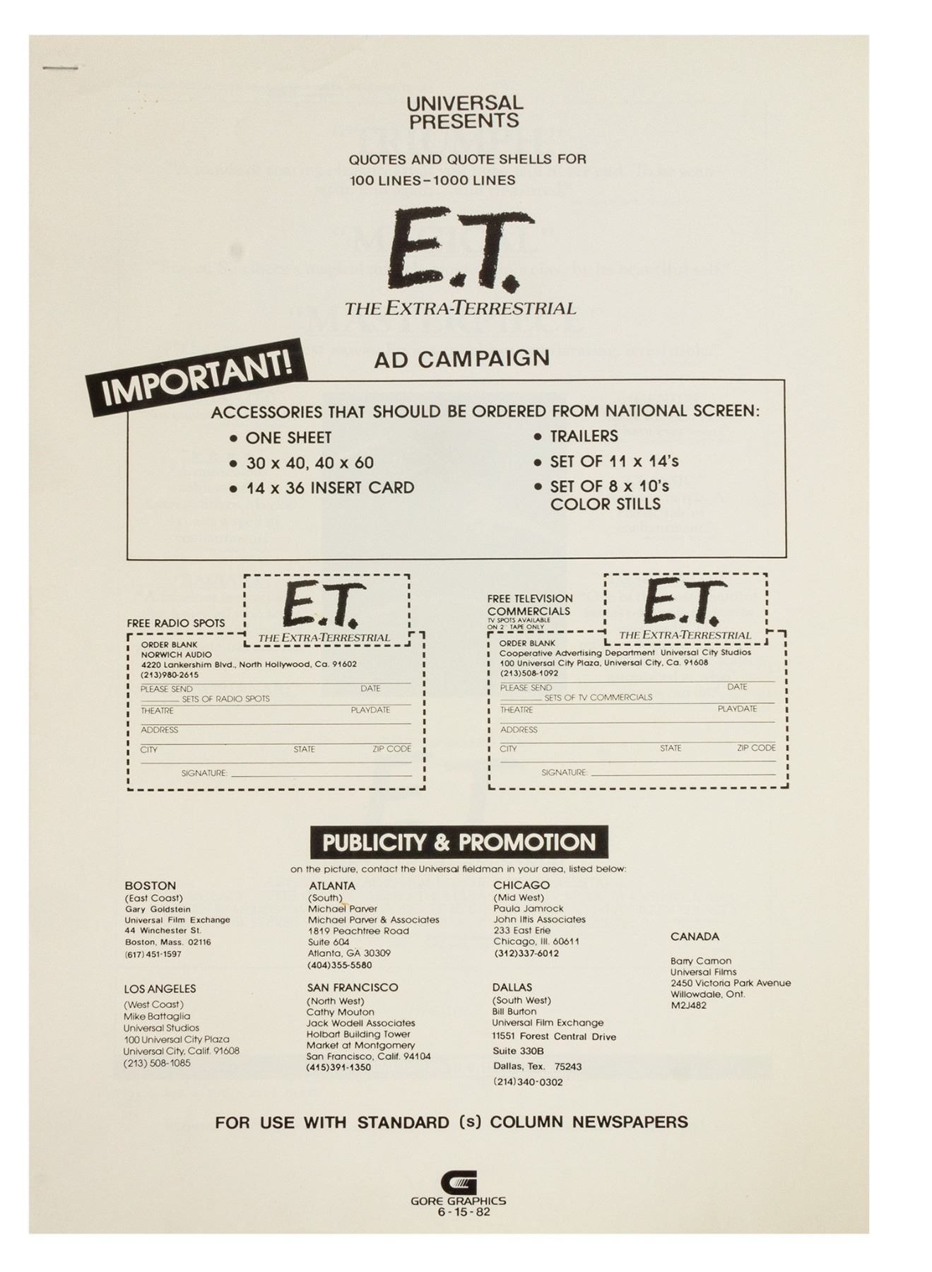 (Universal, 1982) A rare advertising campaign book created by Gore Graphics for the theatrical release of E.T. the Extra-Terrestrial. The packet contains (11) pages of potential newspaper advertisements and quotes to use in the promotion of the film. The 18"x12" packet is in very good condition with some minor edge-creasing.